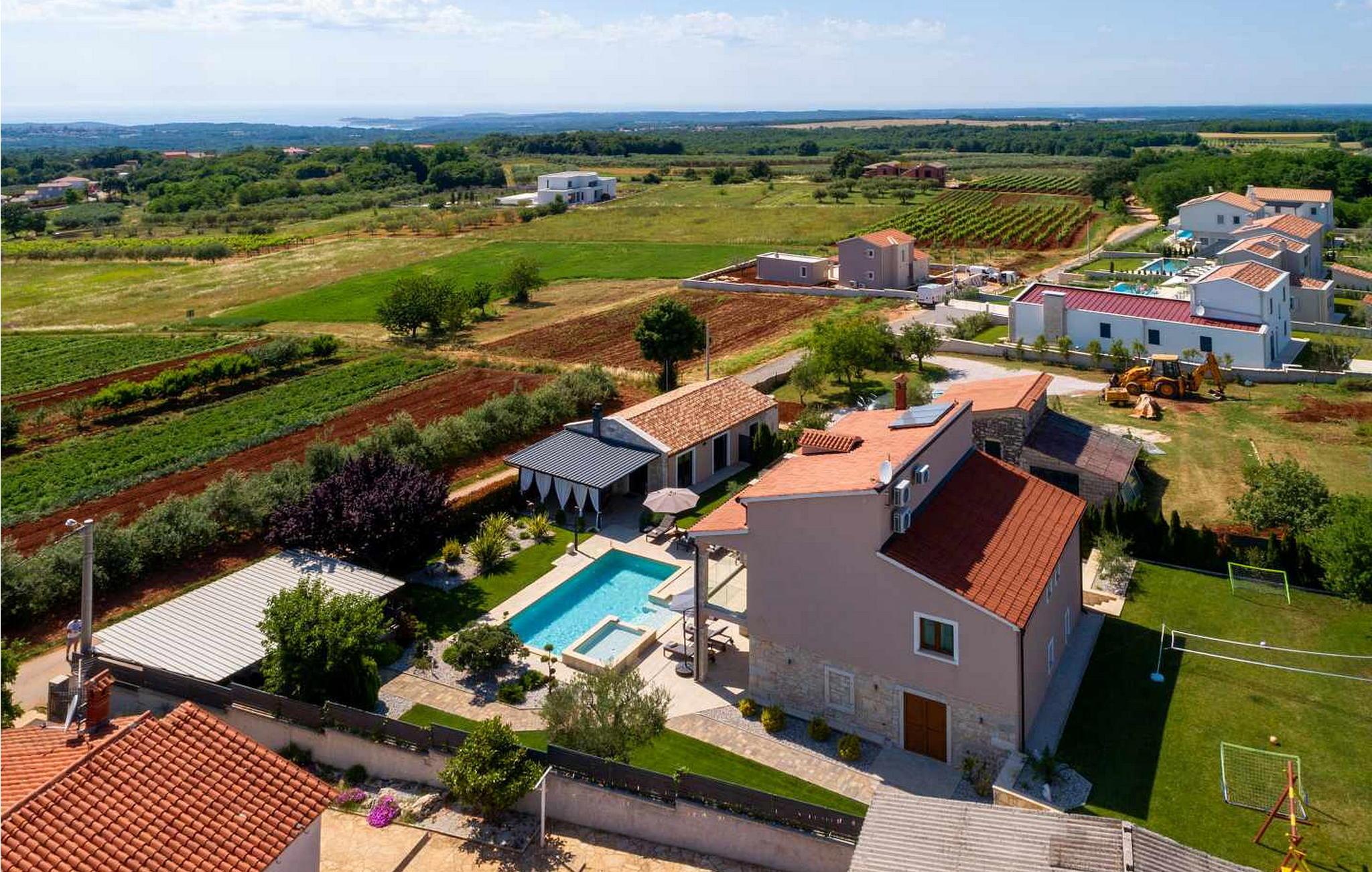 Villa Gambin i udkanten af landsbyen Kastelir er et komfortabelt og luksuriøst feriehus med swimmingpool og vidunderlig panoramaudsigt over havet. Feriehuset ligger 6,5 km fra havet og 15 km fra byen Porec. På en velholdt og fuldt lukket ejendom på 1 200 kvm tilbyder det gæsterne en swimmingpool med børnepool, overdækket terrasse med grill, bordtennis, badmintonbane, et lille hus på 40 kvm med billardbord og spabad og tre parkeringspladser mellemrum. Sommerhus på 300 kvm fordelt på tre etager med aircondition. I stueetagen er der et fuldt udstyret køkken med spisestue, et soveværelse med dobbeltseng med eget bad/toilet og endnu et bad/toilet. På første sal er der en hyggelig stue og to dobbeltværelser med hver sit bad/toilet. På anden sal (høj loft) er et stort dobbeltværelse med eget bad/toilet og balkon med smuk panorama havudsigt. Bemærk venligst, at denne ejendom ikke accepterer ungdomsgrupper eller polterabends. En ungdomsgruppe på denne ejendom er en gruppe bestående af personer på 26 år eller derunder. Book ikke denne ejendom, hvis du er en ungdomsgruppe eller et polterabend, da din reservation vil blive afvist efter booking, hvilket kan omfatte ved ankomst til ejendommen eller under dit ophold, og du vil ikke blive refunderet.