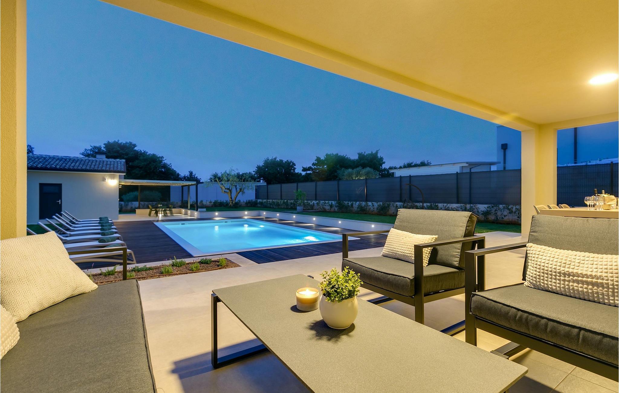 Hvert soveværelse er udstyret med aircondition og et tv, med 3 af soveværelserne placeret på første sal. Stueetagen er i åbent plan med hyggelig opholdsstue og direkte adgang til udendørsareal og stor pool. Stuen strækker sig ind i den lyse og nænsomt designede spiseplads. Her finder du også et meget moderne køkken, fuldt udstyret til alle dine kulinariske behov. For nemheds skyld er der endnu et soveværelse med eget badeværelse i stueetagen. Den udendørs spiseplads er perfekt til afslappende stunder, mens din familie og venner nyder de lokalt inspirerede retter tilberedt i sommerkøkkenet. Den store pool giver en forfriskning på varme dage. Spild ikke meget tid - bestil din ferie i denne moderne drømmevilla nu!Villa Amoroso ligger kun en kort køretur fra Porec, en af de største kystbyer i Istrien. Porec er bestemt mere end bare sol og hav – det er en by med en lang og rig historie, der går tilbage til Romerrigets tid. Når du er i Porec, skal du helt sikkert besøge Euphrasius-basilikaen, et glimrende eksempel på tidlig byzantinsk arkitektur i Middelhavet. Basilikaen har været på Unescos verdensarvsliste siden 1997. Gå en tur gennem byens smalle gader, besøg byens museer og gallerier og nyd den afslappede bystemning. De nærmeste strande ligger kun 4 km fra villaen, og der er et udvalg af strande at vælge imellem, afhængigt af dine præferencer. Porec byder også på mange restauranter og barer - valget er dit! Gå ikke glip af at besøge det indre af Istrien med sine mange middelalderbyer på en bakketop som Motovun, Buzet og Groznjan. Gå gennem de mange vinmarker og olivenlunde og nyd Istriens natur.