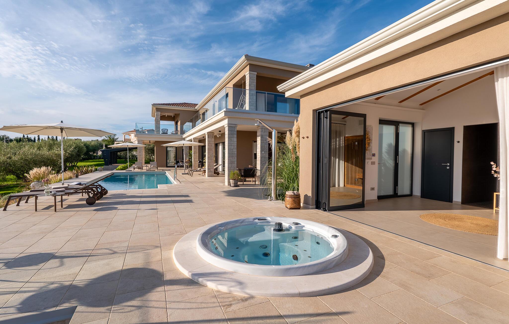 Højdepunkterne, såsom den private pool og det udendørs spabad, toppes kun af en fantastisk panoramaudsigt over den private olivenlund. Den nærmeste strand ligger kun en kort køretur fra villaen.