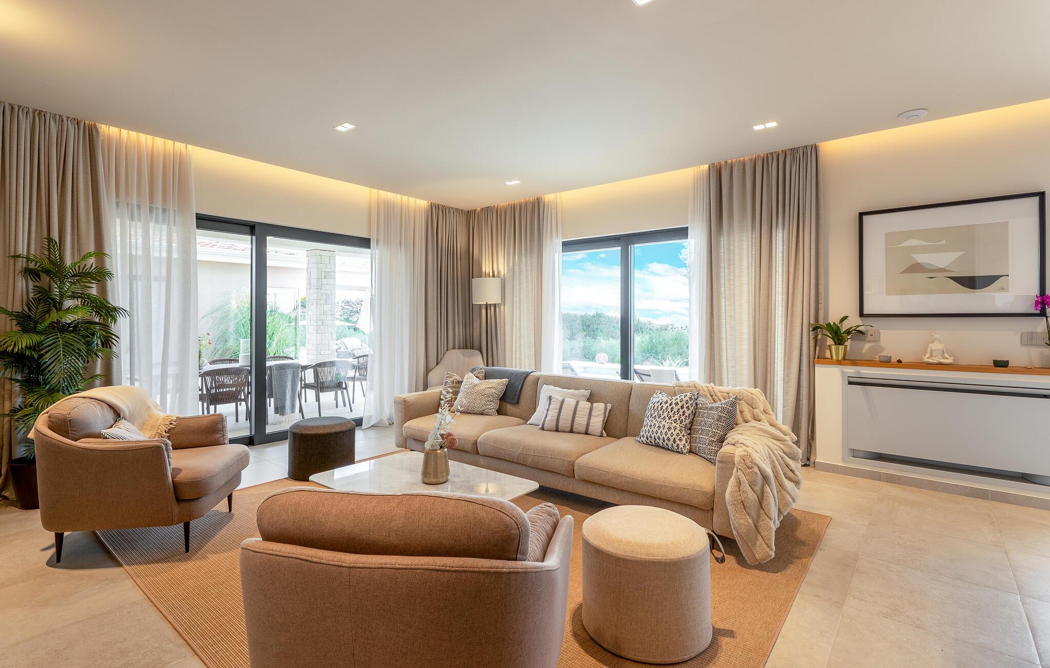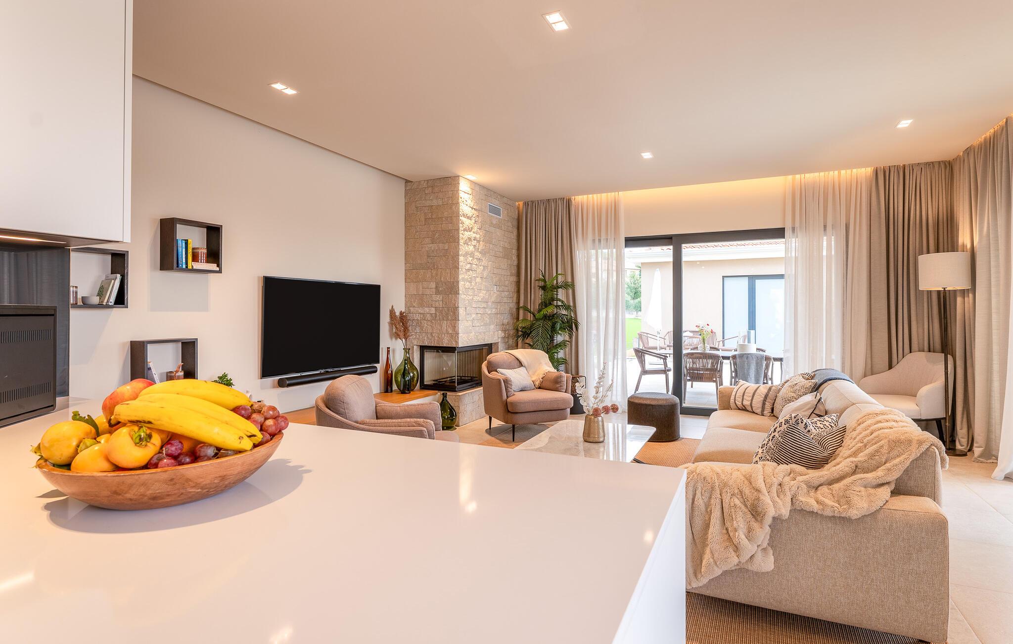 Interiøret er lyst og hjemligt og har et åbent design. Den fuldt klimatiserede opholdsstue med pejs, tv og komfortabel sofa flyder ind i den smarte spiseplads og det moderne, veludstyrede køkken. På samme niveau er der gæstetoilet og vaskeri. Et komfortabelt soveværelse med dobbeltseng og eget badeværelse fuldender dette niveau.