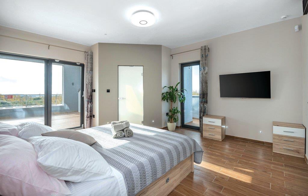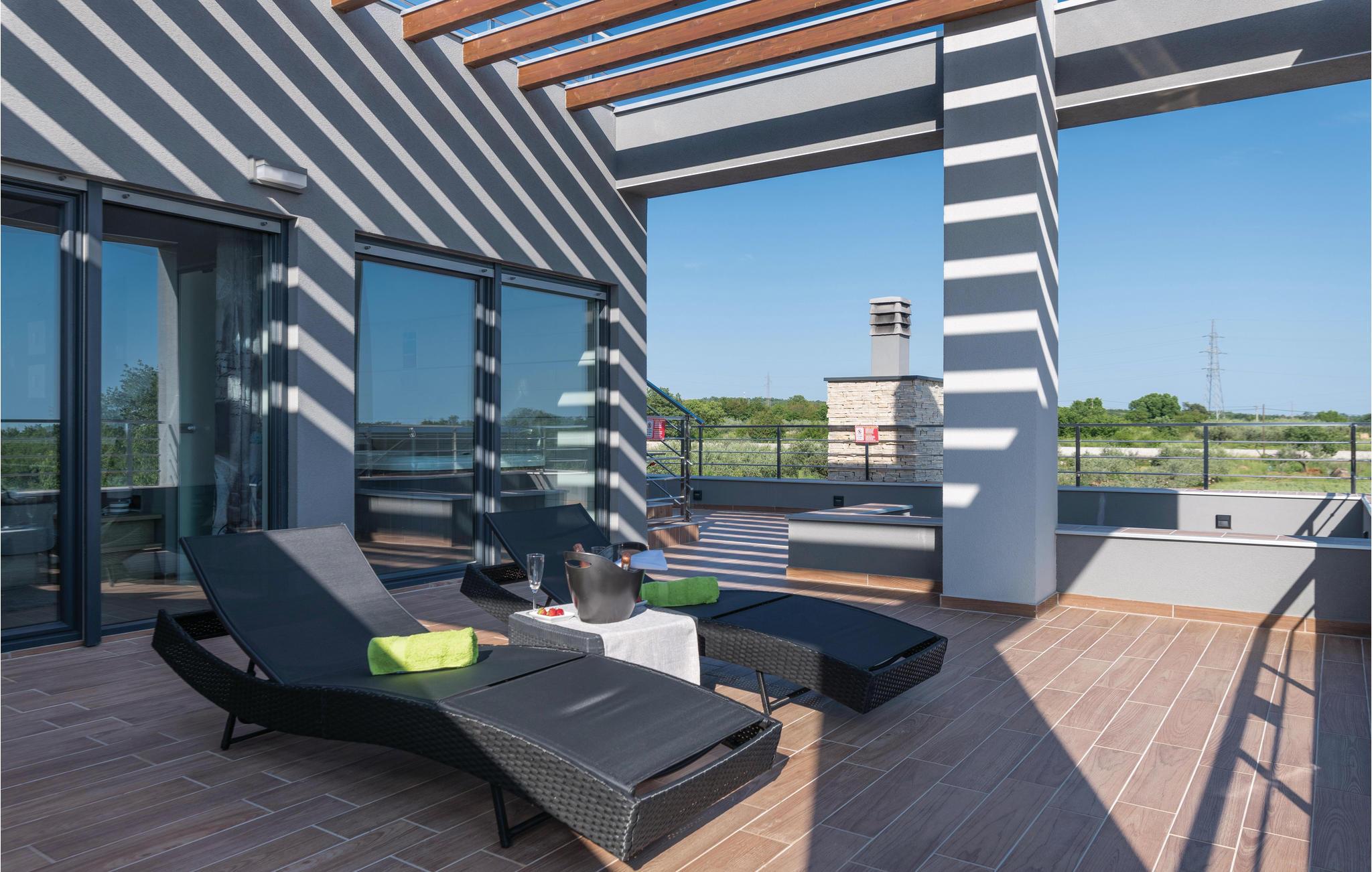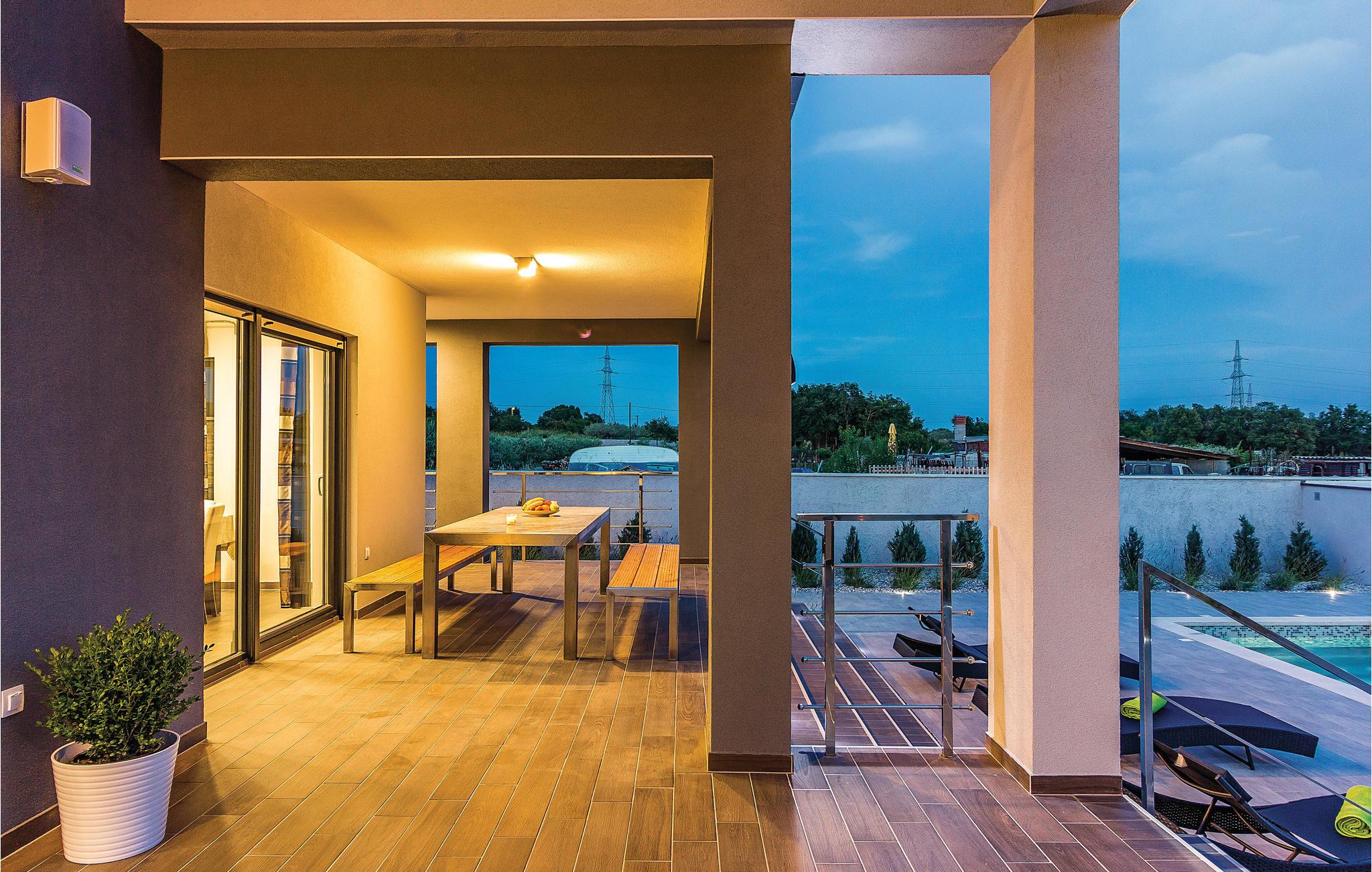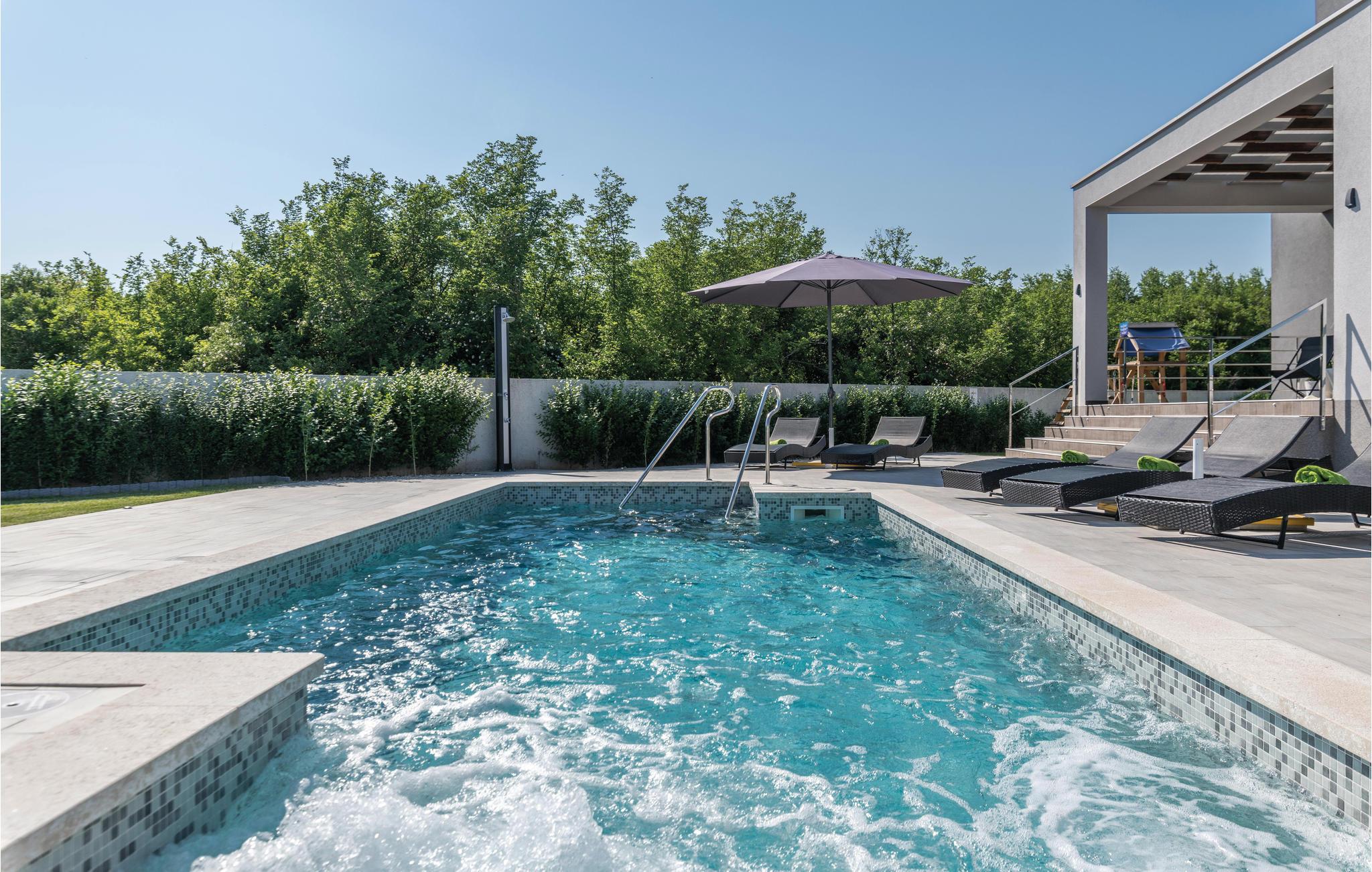 I Galižana, ikke langt fra Pula, ligger dette moderne og indbydende feriehuse. De store vinduer lukker masser af lys ind og giver en charmerende feriestemning. Indretningen er smagfuld og komfortabel. Til hvert soveværelse hører eget badeværelse, hvad der giver en høj grad af ugenerthed. Tagterrassen er lukket af og kan ikke benyttes. Vælg mellem whirlpoolen og swimmingpoolen når der skal slappes af i vandet. Smut en tur til Pula, i hvis gamle bydel der er mange seværdigheder fra romertiden. Her er også mange former for sommerunderholdning for alle aldersklasser. Gå heller ikke glip af et besøg i Nationalpark Brijuni-øerne, hvis naturskønhed vil fortrylle jer. Alene turen i båd er en oplevelse helt for sig selv.