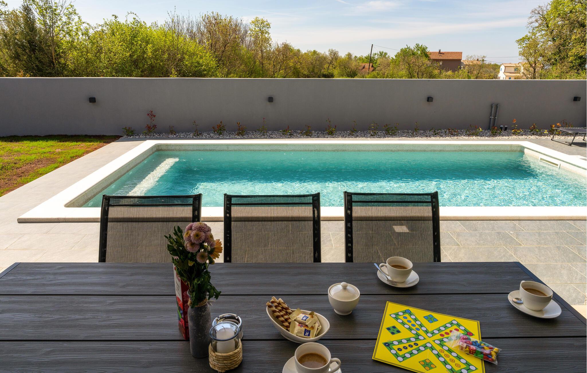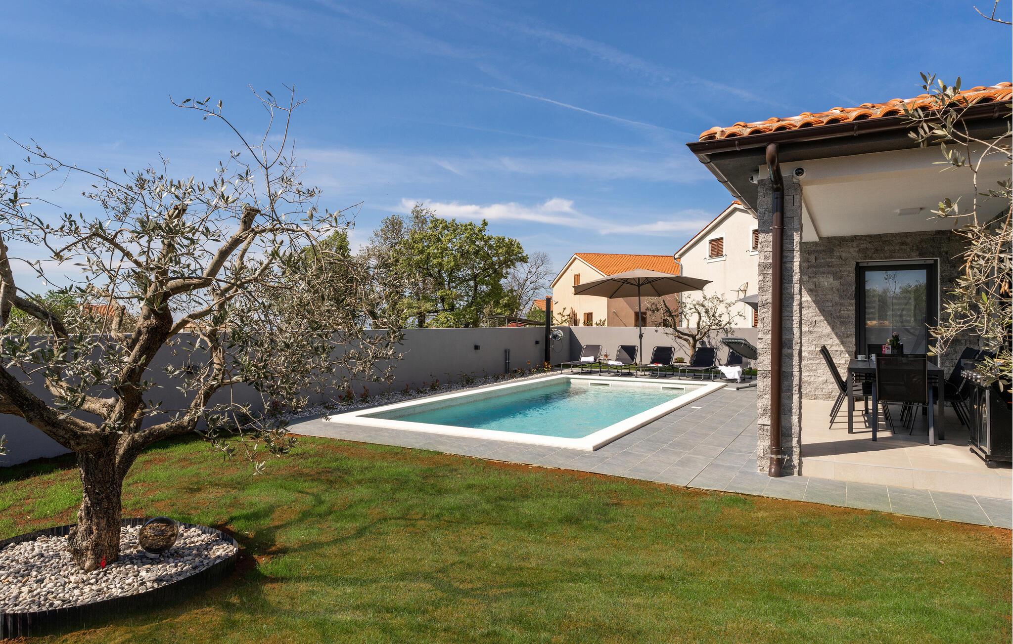 snup en frisk dukkert i det krystalklare vand i jeres smukke pool og nyd solen på en behagelig liggestol. Mens jeres børn benytter legefaciliteterne på den velholdte ejendom, kan I i ro og mag tilberede en stemningsfuld grill.