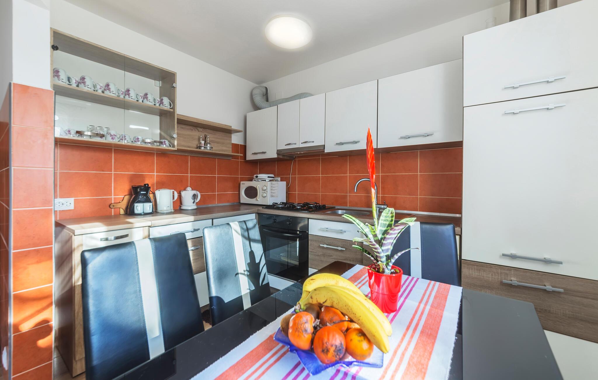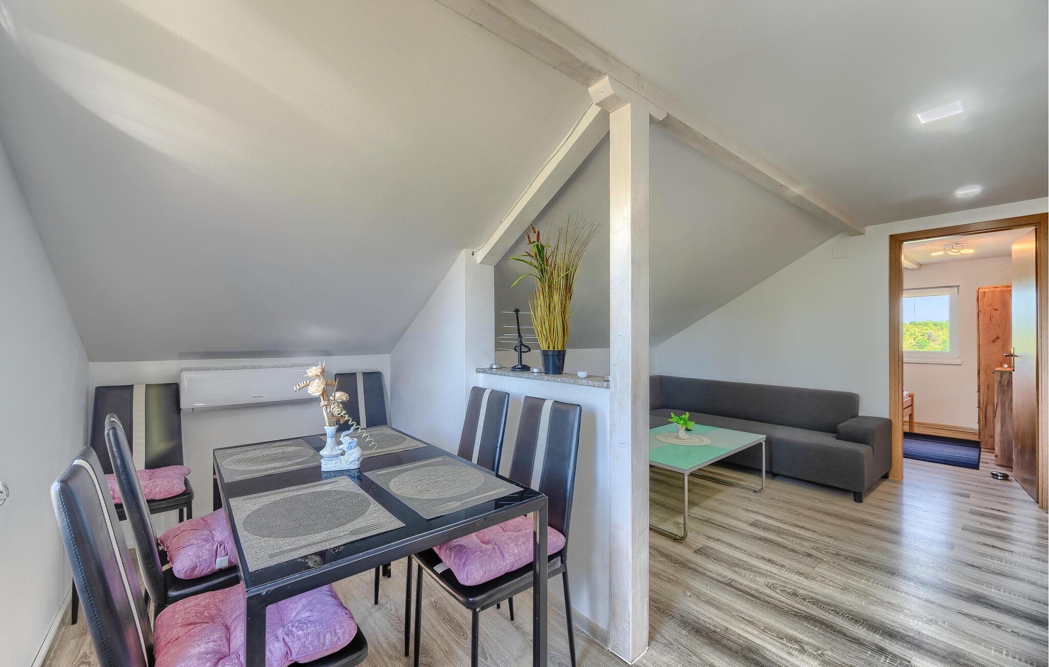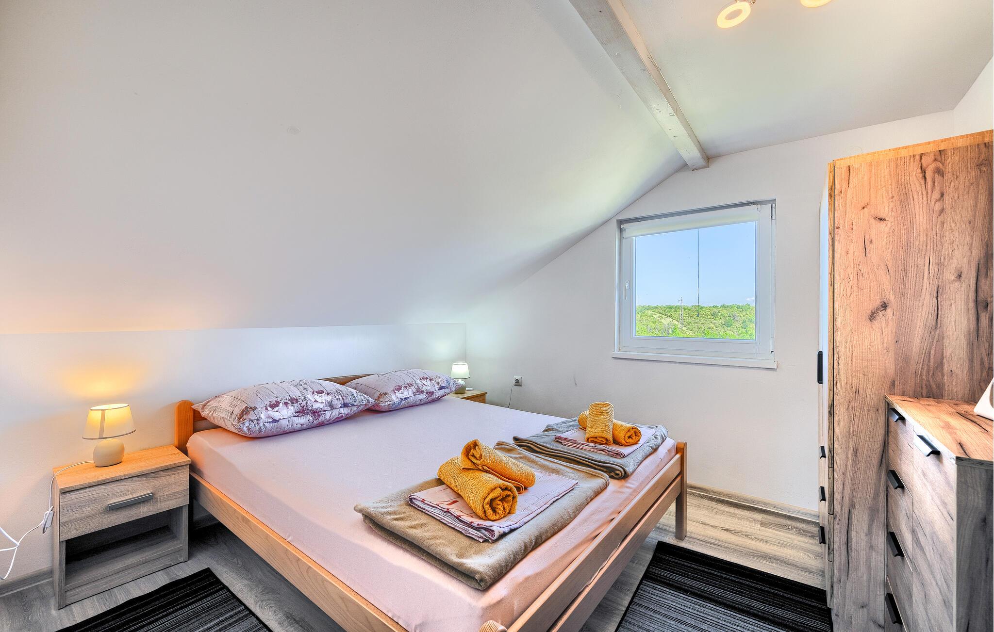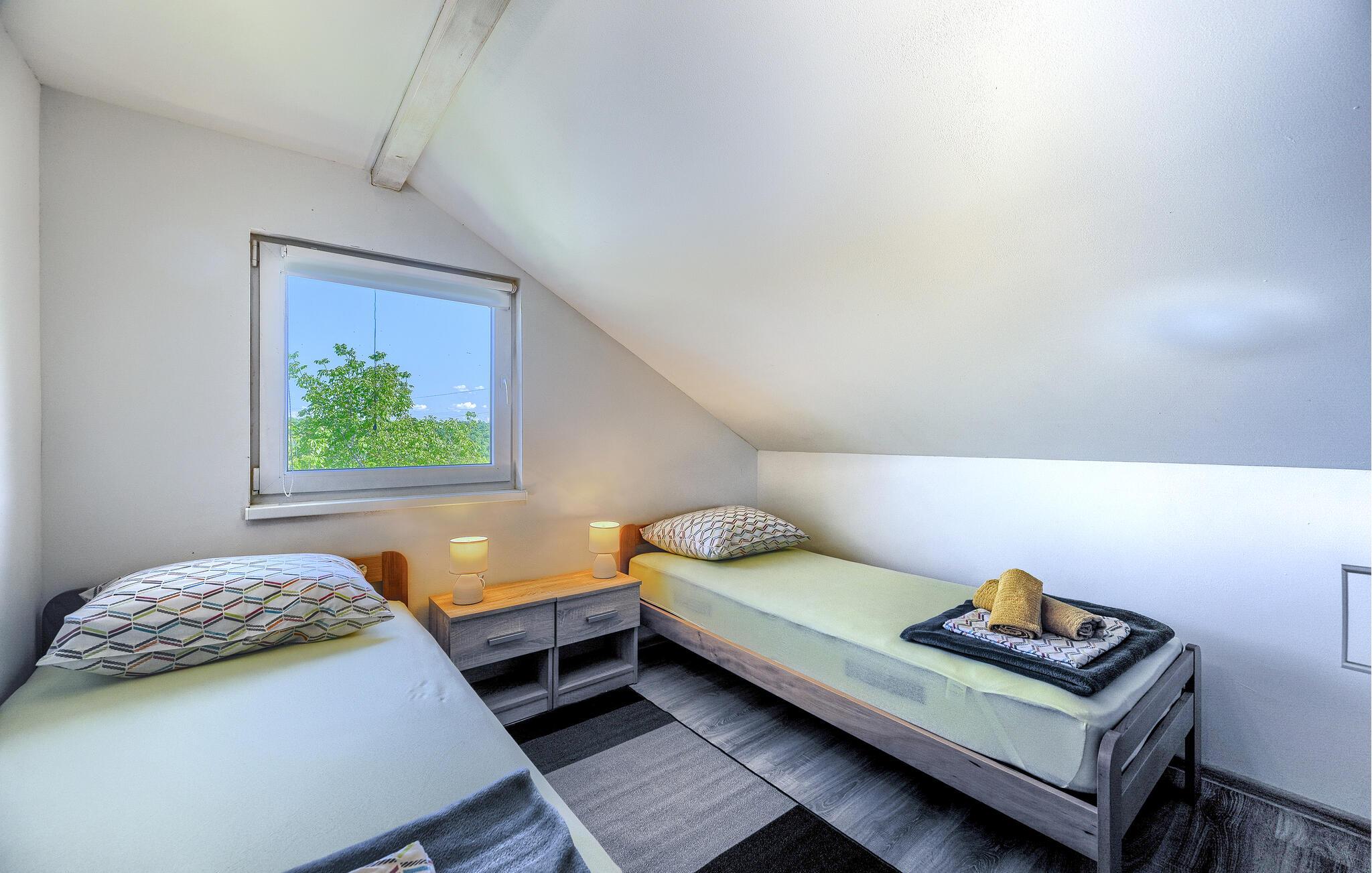 Huset ligger i den lille landsby Sv. Kirin, hvor I har mulighed for at lære det idylliske indre af Istrien at kende. Husets bolig tilbyder to soveværelser, spisekøkken, badeværelse og en overdækket terrasse i det udendørs område. På den helt indhegnede grund med grønt område kan I finde et hyggeligt feriehus og en simpel ekstra bygning med en indendørs pejs og spisebord. Whirlpoolen i haven tilbyder sjov for hele familien på varme sommerdage.