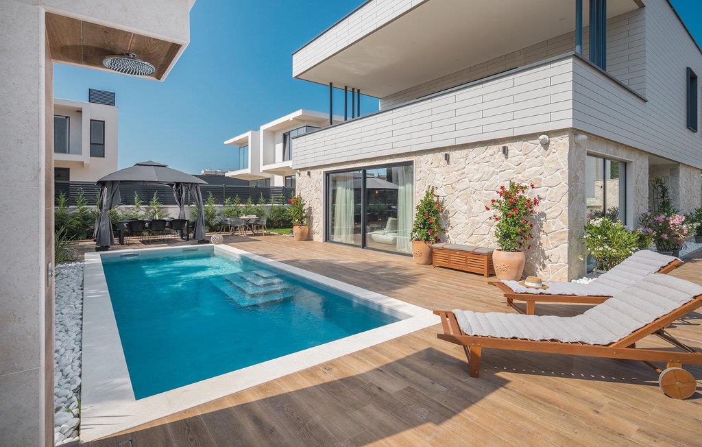 Tag en pause fra den hektiske hverdag i den vidunderlige Villa Golden Shine for 8+2 gæster. Nyd din ferie med familie og venner i denne villa med privat pool, omgivet af en anlagt have med masser af planter. Den udendørs terrasse ved poolen har alt hvad du behøver for at tilbringe tid udendørs. Tilbered dine daglige måltider på grillen og nyd dem sammen ved det overdækkede spisebord på terrassen. Et loungeområde ved poolen er også tilgængeligt til korte pauser med en kop kaffe eller cocktails. Den store glasvæg giver direkte indgang fra den udendørs terrasse til det åbne rum i stue, spisestue og køkken i stueetagen.