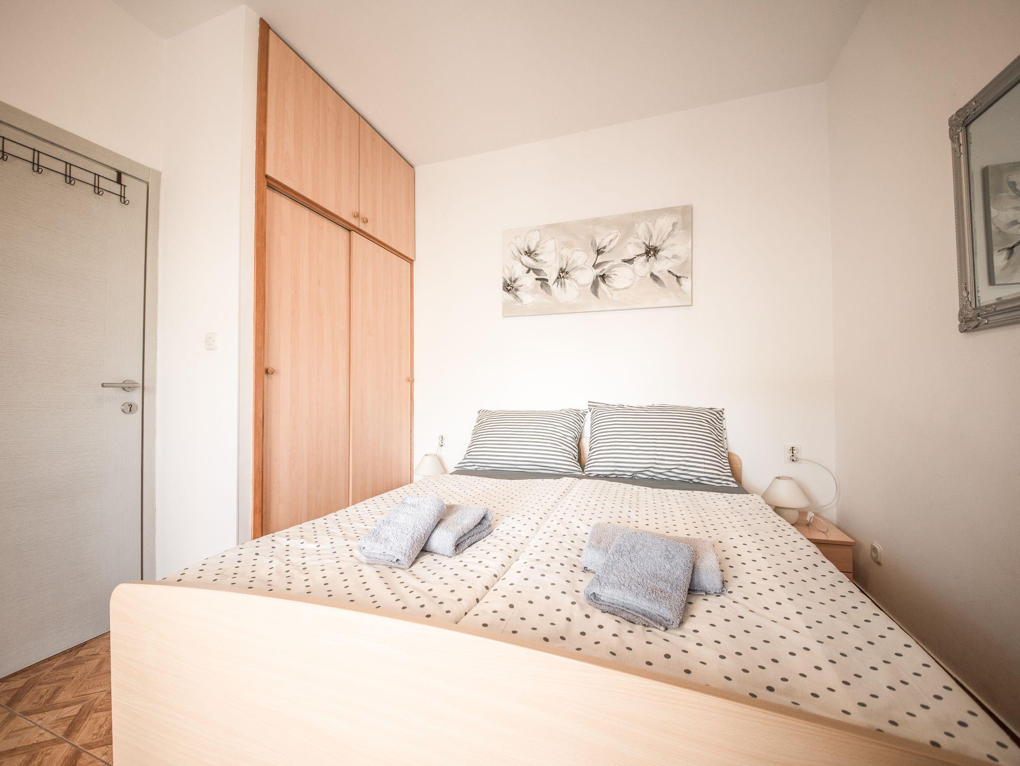Zimmer bietet Platz für 2 Gäste. Die Betten sind in Schlafzimmern, die es 1 gibt, innerhalb einer Gesamtfläche von 13m2, angeordnet. Die Gäste haben einen eigenen Balkon zur Verfügung, auf der sie in warmen Sommernächten genießen können. Es ist erlaubt, Speisen auf dem Gemeinschafts-Grill vorzubereiten. Die reservierte Unterkunftseinheit ist ein Zimmer mit eigenem Badezimmer ohne die Möglichkeit der Nutzung einer Küche. IM PREIS INBEGRIFFEN: Kurtaxe, Endreinigung, Klimatisierung, Parkplatz, Internet, Kinderbett, Bügeleisen, Bügelbrett, Föhn. VERBINDLICHE ZUSÄTZLICHE KOSTEN: Aufzahlung für Kurzaufenthalte (prozentualer Zuschlag pro Nächtigungsanzahl: 30% - 1, 20% - 2, 10% - 3). UNVERBINDLICHE ZUSÄTZLICHE KOSTEN: Wäschewaschen (5,00 € Waschen), Bootsanlegeplatz (10,00 € pro Nacht). Die Verfügbarkeit zusätzlicher Dienstleistungen in Ihrem reservierten Termin und die Preise derselben (falls nicht aufgeführt) müssen im Voraus überprüft werden. Zusätzliche Dienstleistungen die in der Zahlungsaufforderung nicht aufgeführt sind werden direkt beim Vermieter bezahlt, angenommen der Gast nutzt auch diese. Ermäßigung auf den Grundpreis: Gratistag 14=13 (bei einem Aufenthalt von 14 Tagen oder mehr erhalten Sie einen Gratistag für den Aufenthalt bis 31.12.26).