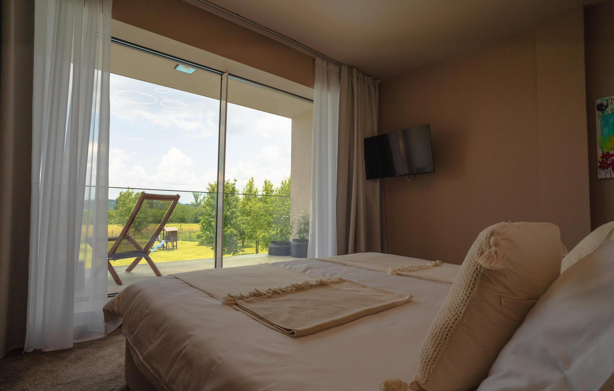 Denne stilfulde villa i Mokrice inviterer jer til en afslappende ferie midt i maleriske naturomgivelser. Den moderne indretning skaber en harmonisk atmosfære, mens de lysfyldte rum giver en luftig fornemmelse. I det veludstyrede køkken kan I tilberede lækre måltider, som I efterfølgende kan nyde på terrassen. Efter en aktiv dag kan I slappe af i det private spabad eller tage en forfriskende dukkert i den fælles swimmingpool. Det nærliggende feriehus kan, afhængigt af tilgængelighed, bookes som ekstra overnatningssted, hvilket gør det ideelt til en ferie med venner eller en stor familie.