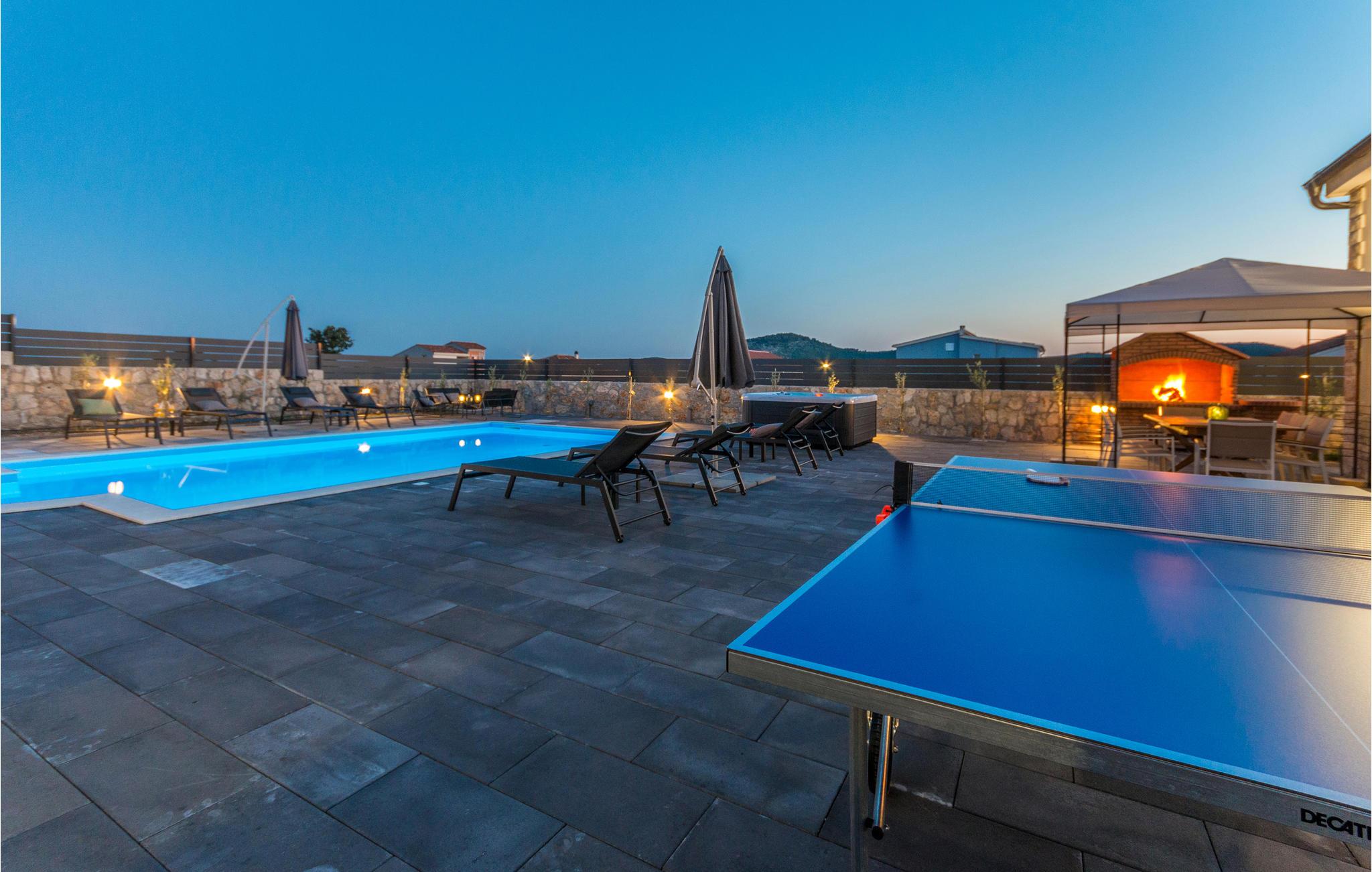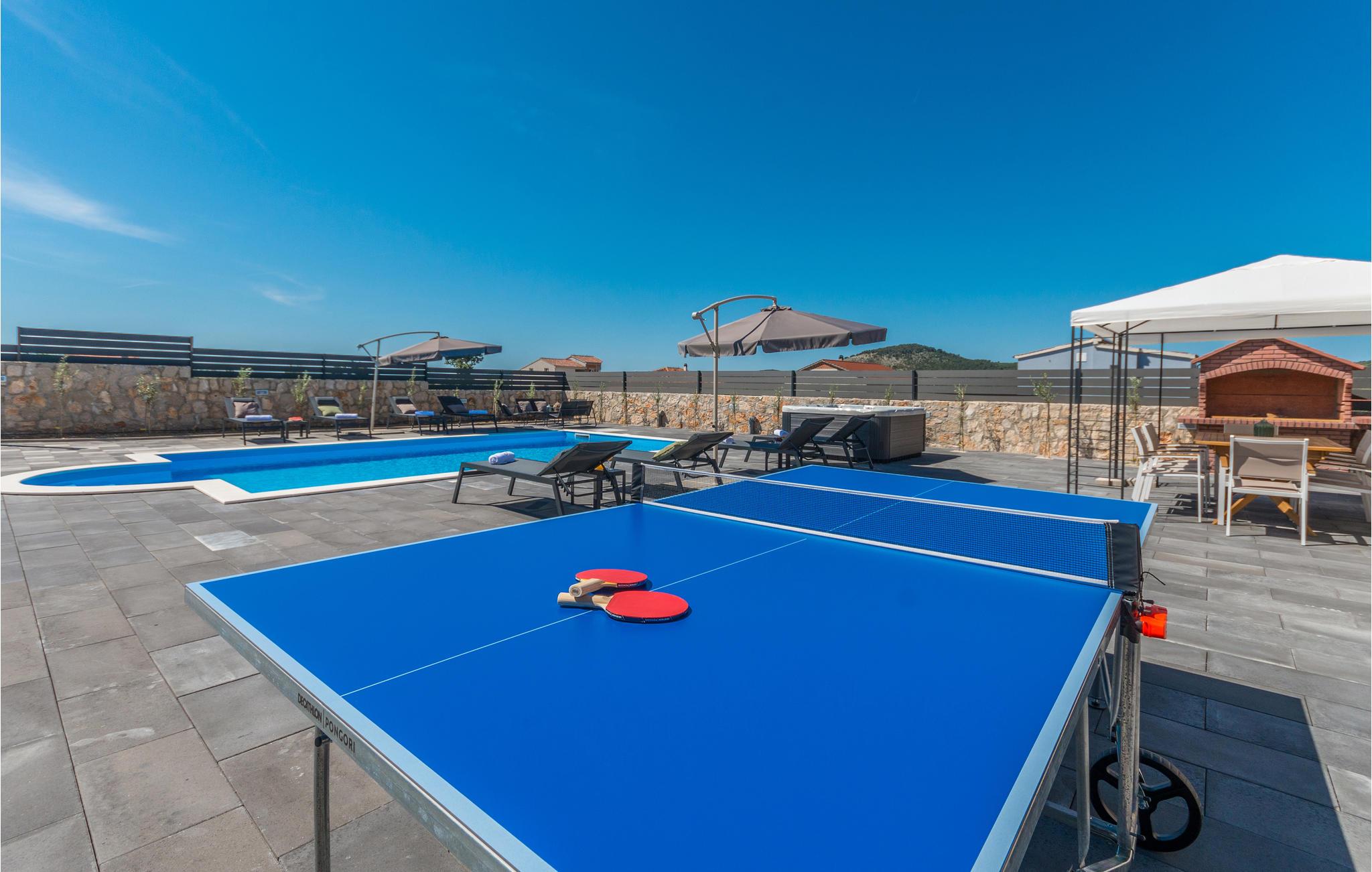 Kom til dette vidunderlige feriehus og tilbring skønne, varierede timer sammen med jeres kære. Uanset om I vil slappe af på liggestolene ved poolen eller i boblebadet, kan I tilbringe hyggelige aftener foran tv'et eller med en omgang billard. Eller har I mere lyst til at dyrke sportslige aktiviteter? Svøm et par baner om morgenen, brug fitnessrummet, tag et slag bordfodbold eller bordtennis, eller lad børnene slå sig løs på trampolinen. Her kommer I med garnanti ikke til at kede jer.