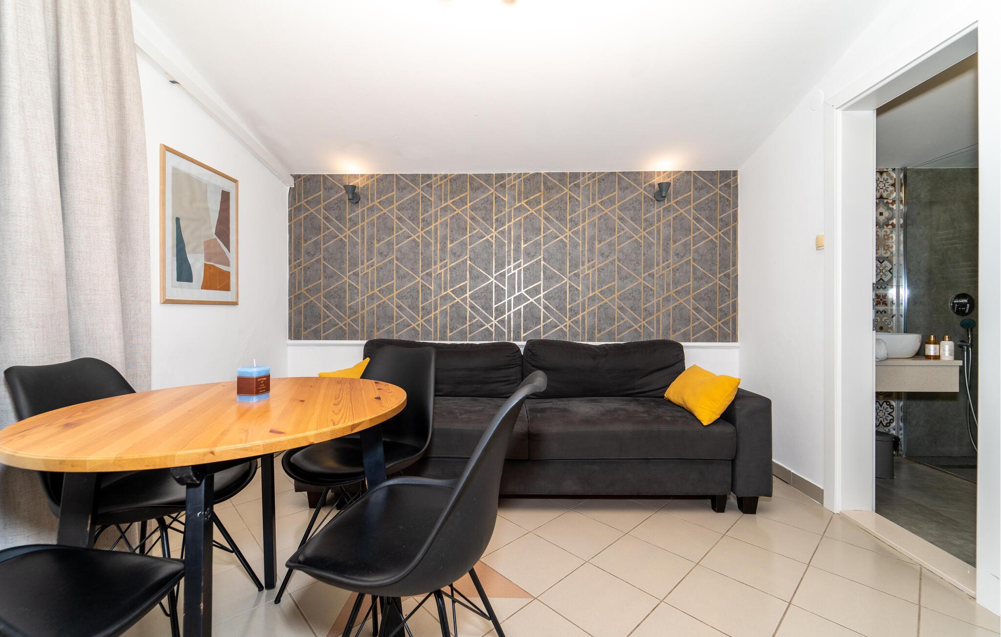 Glæd jer til afslappende feriedage i denne indbydende og hyggelige ferielejlighed, der er velegnet til par eller en lille familie. Lejlighedens elegante atmosfære lader intet tilbage at ønske og byder på nogle dejlige timer med film og fælles måltider omgivet af moderne indretning. Start morgenen med en dampende kop kaffe på altanen, og lad blikket vandre over vandet og landskabet.