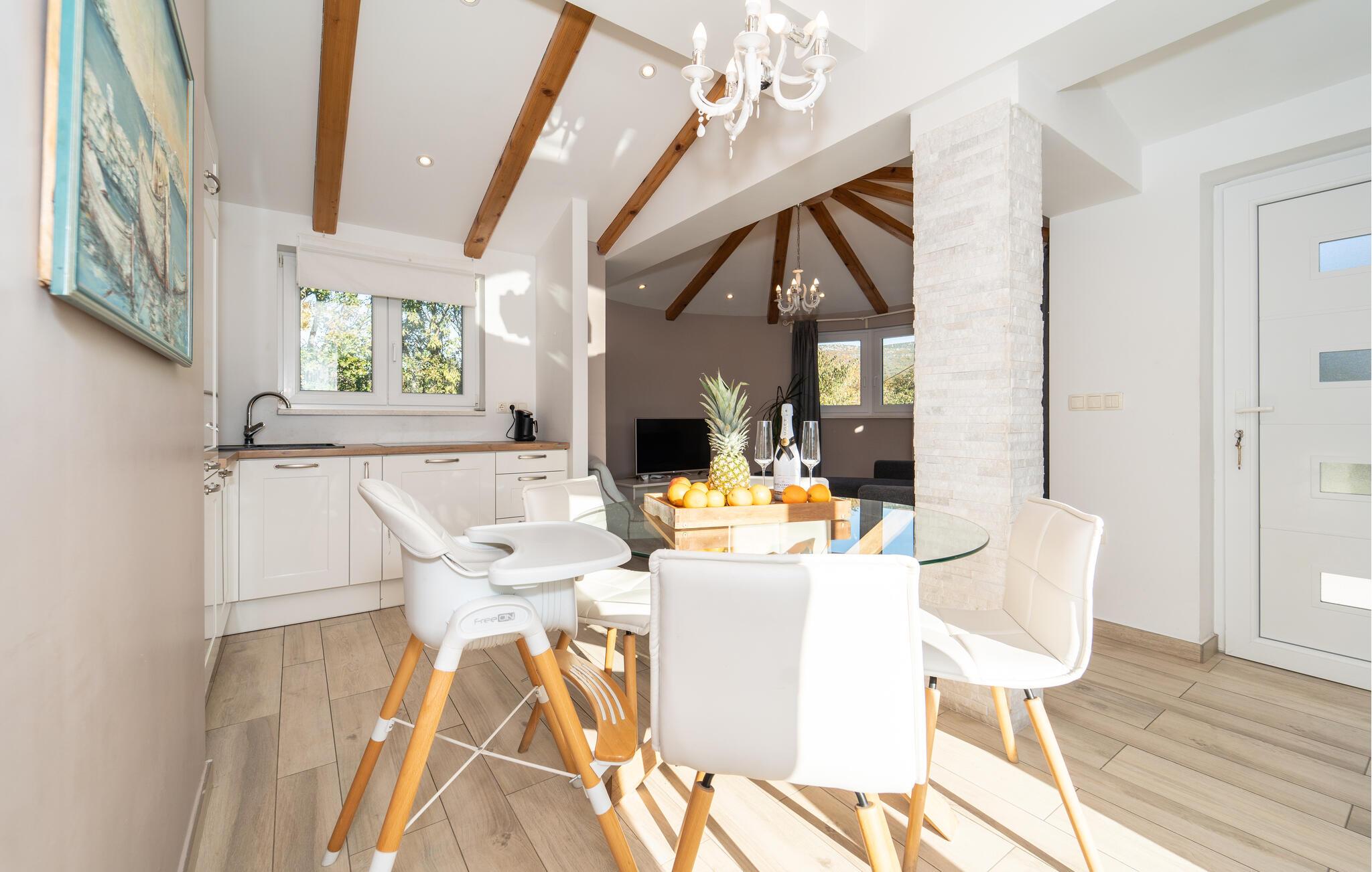Der er lagt op til en velfortjent og afslappende ferie som par eller med den lille familie i dette flotte og indbydende hus. Indretningen fremstår ganske elegant og skaber en behagelig atmosfære, hvor I kan hvile stængerne med lækre måltider og gode film om aftenen.