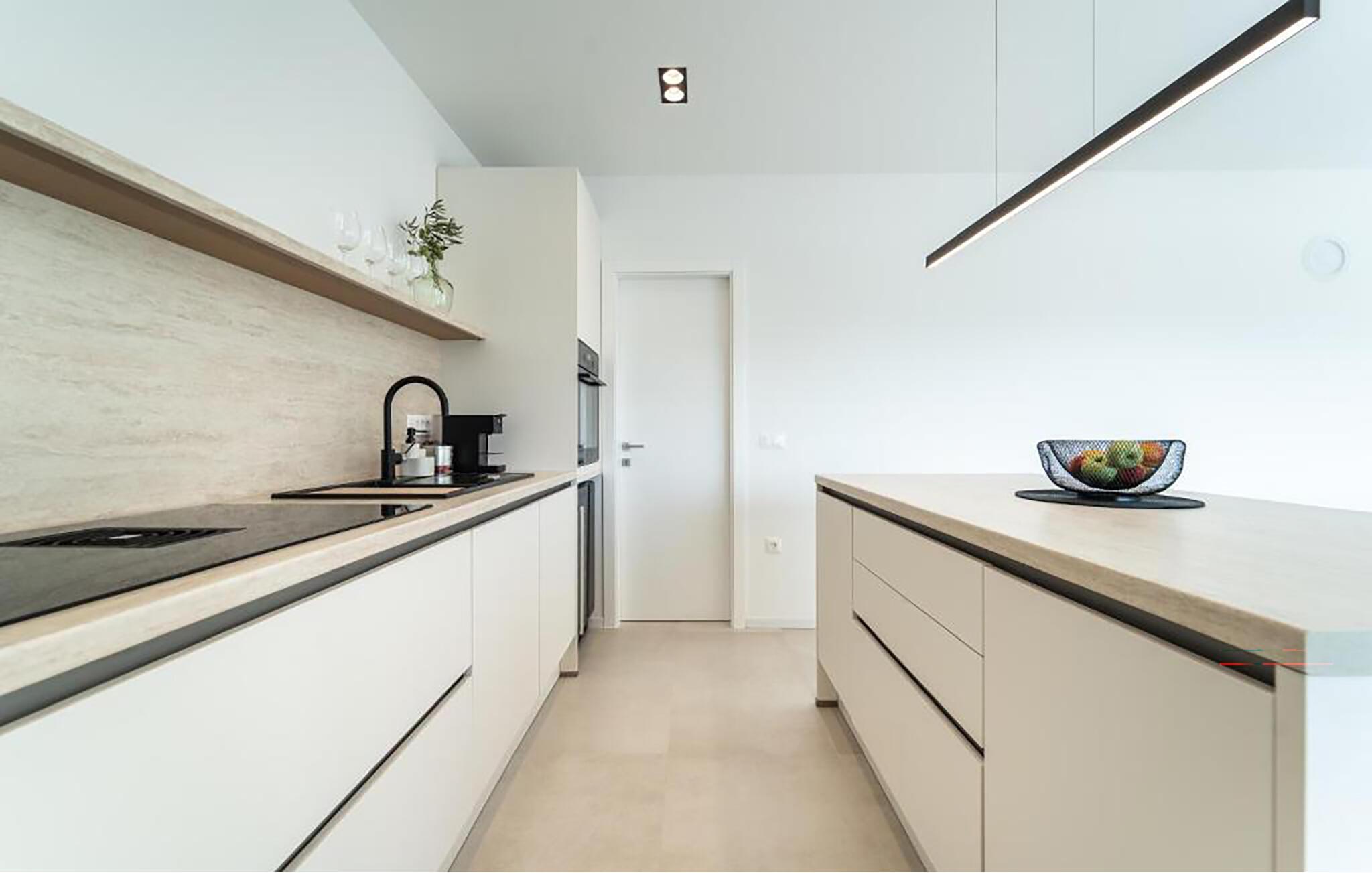 Træd ind i den lyse opholdsstue og sæt jer til rette i det stilfulde rum, der er møbleret med elegante, moderne møbler. Læn jer tilbage i den komfortable sofa og nyd panoramaudsigten gennem gulv-til-loft-vinduerne. Tilbered lækre retter i det fuldt udstyrede køkken og nyd dem ved det store spisebord, som tilbyder masser af plads til fælles måltider. Eller find sammen til en kop kaffe ved køkkenbordet.
