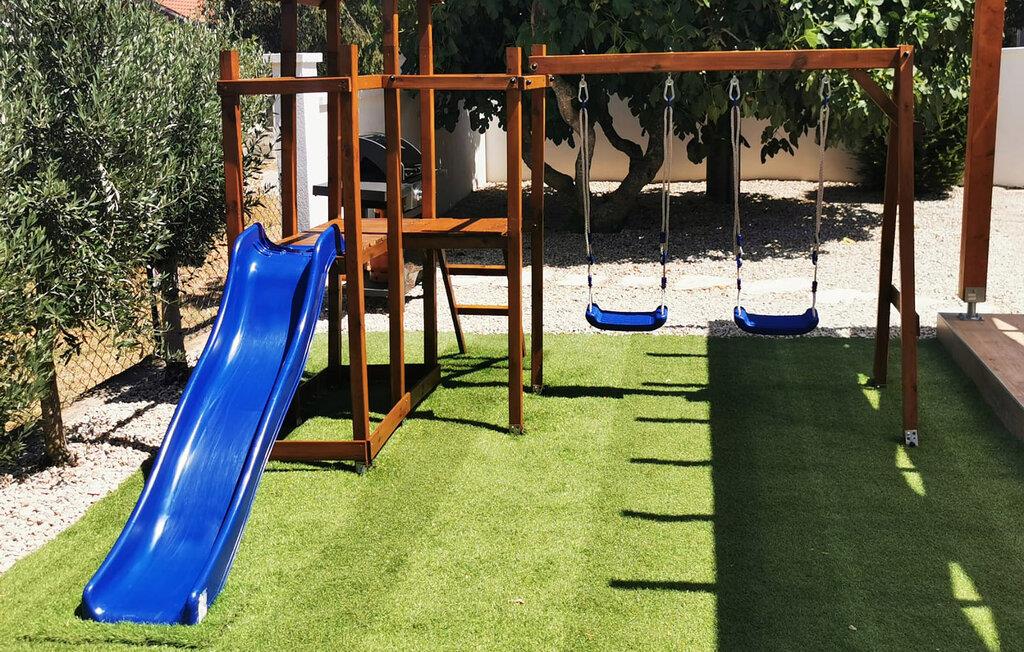Der er tale om et stenhus, som kombinerer rustikke og moderne møbler og tilbyder jer alle bekvemmeligheder, så I kan få et yderst behageligt ophold i den lille, charmerende by. Slap dejligt af i det rummelige hus, hvor de hjemlige og komfortable møbler i kombination med stilfulde dekorationer skaber en hyggelig atmosfære. Nyd jeres måltider inde eller ude og hold hyggelige grillaftener i gården - enten under taget eller i den skarpe sol. På terrassen kan I læse en god bog og nyde en kop kaffe eller et godt glas vin, afhængigt af tidspunktet på dagen. Plask rundt i poolen, slik sol fra liggestolene og betragt jeres børn gynge eller rutche på den indhegnede grund.
