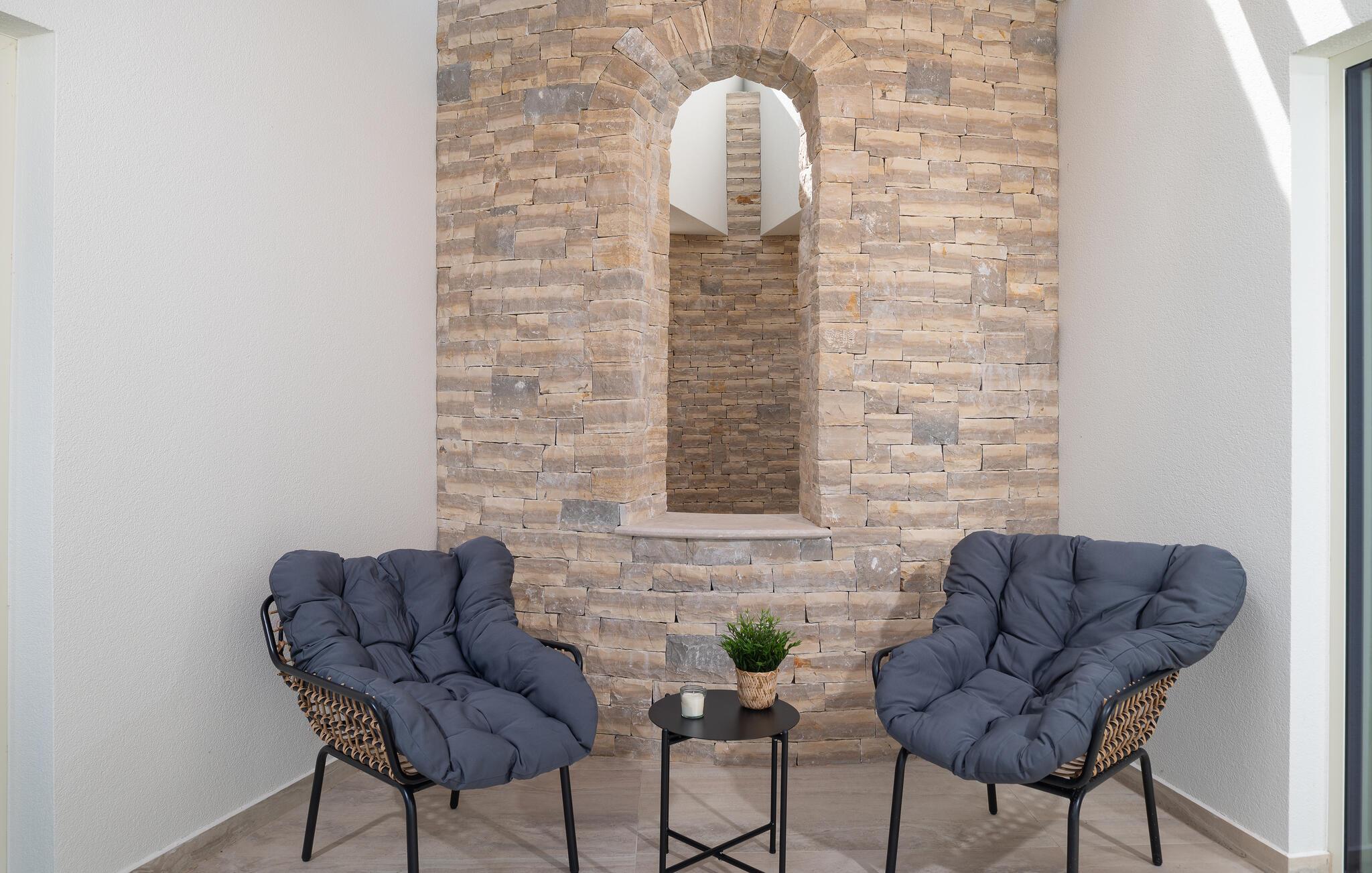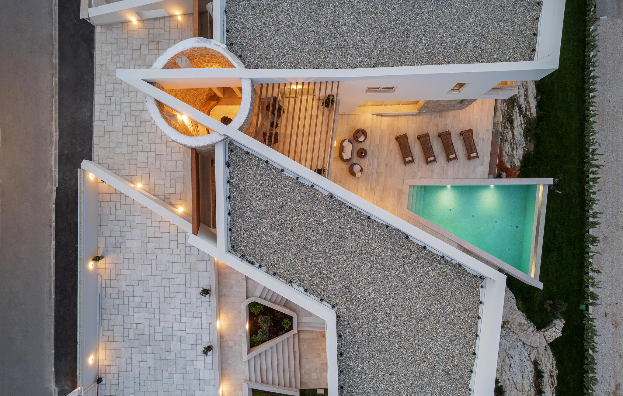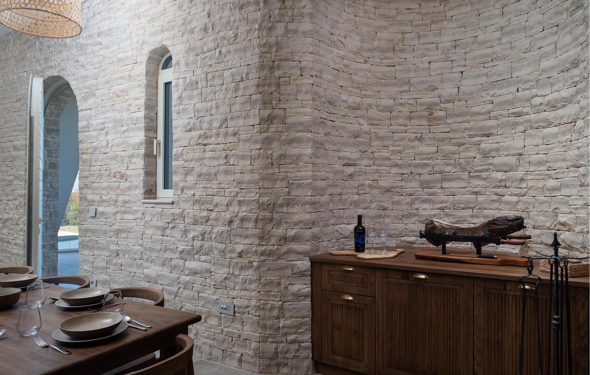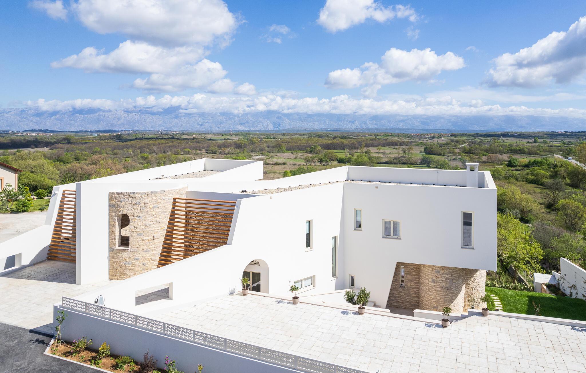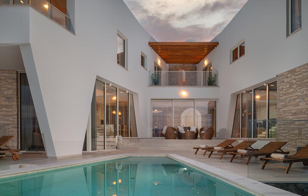 Dette moderne hus ligger i rolige omgivelser og byder jer velkommen med sin spændende arkitektur, der afspejler stilen fra de lokale kirker. Stilfulde designermøbler, natursten og varme trænuancer skaber en elegant, men indbydende atmosfære indenfor, der får jer til at føle jer hjemme. Det rummelige spa-område med sauna og spabad tilbyder den perfekte afslapning, og I kan nyde hyggelige aftener i villaens konoba (taverna).