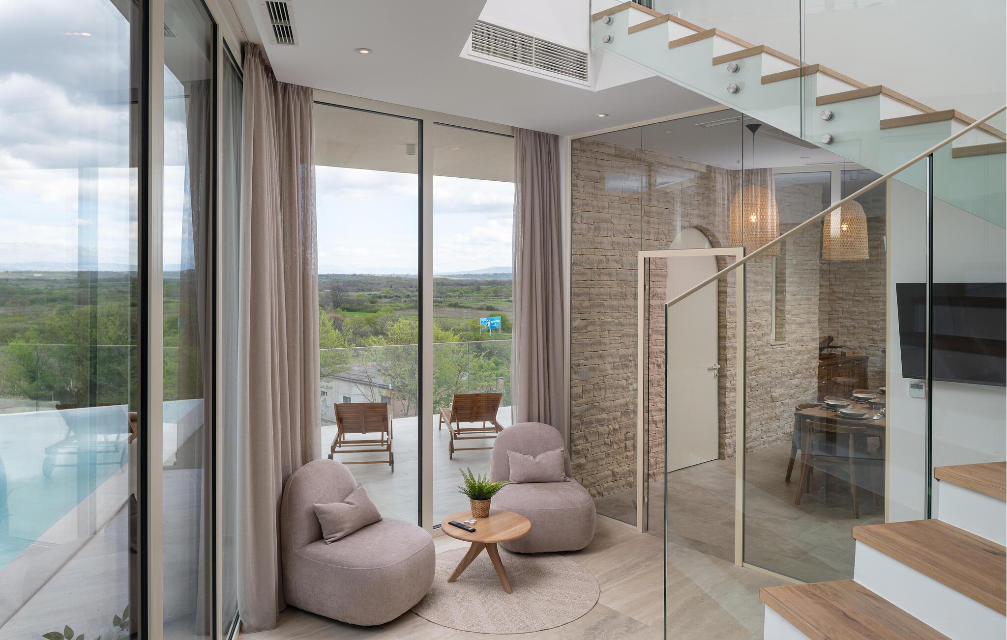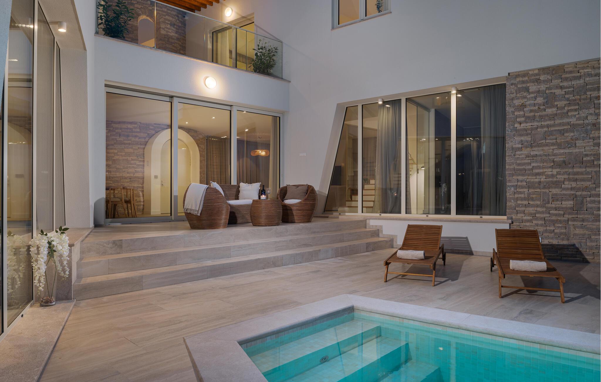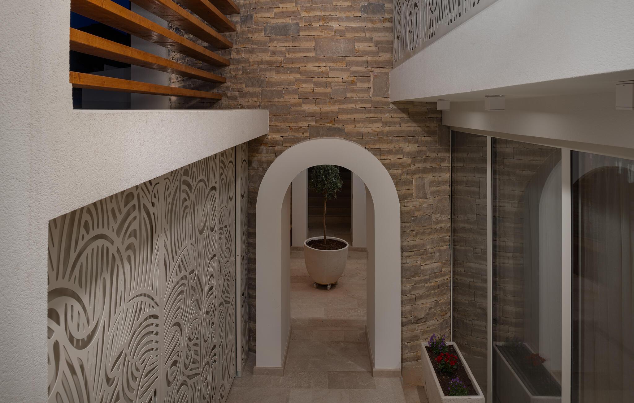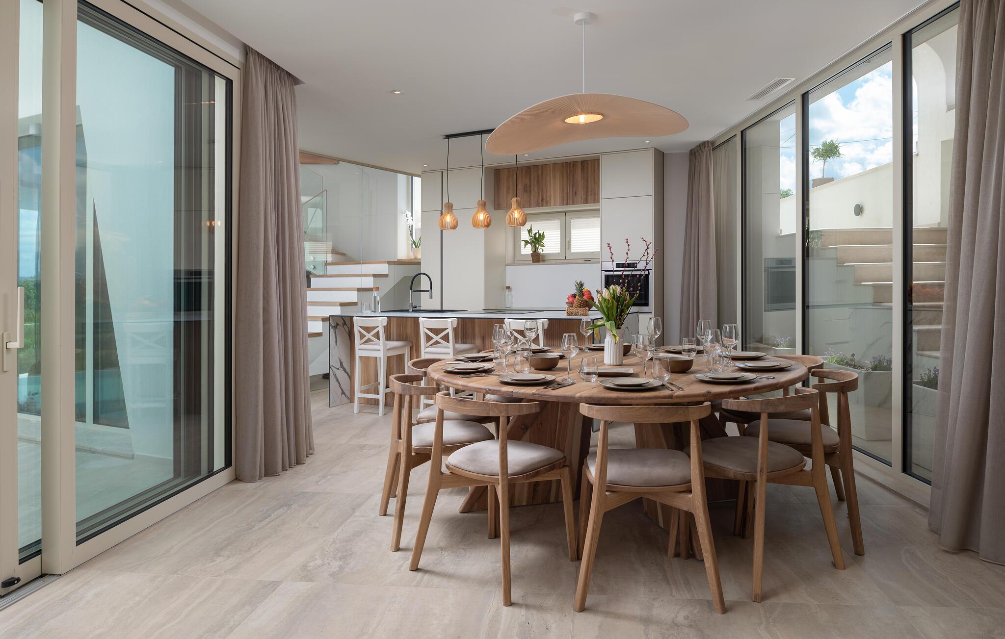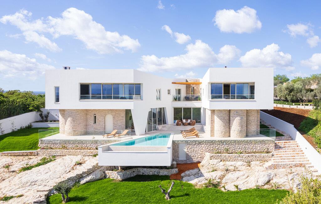 Dette moderne hus ligger i rolige omgivelser og byder jer velkommen med sin spændende arkitektur, der afspejler stilen fra de lokale kirker. Stilfulde designermøbler, natursten og varme trænuancer skaber en elegant, men indbydende atmosfære indenfor, der får jer til at føle jer hjemme. Det rummelige spa-område med sauna og spabad tilbyder den perfekte afslapning, og I kan nyde hyggelige aftener i villaens konoba (taverna).