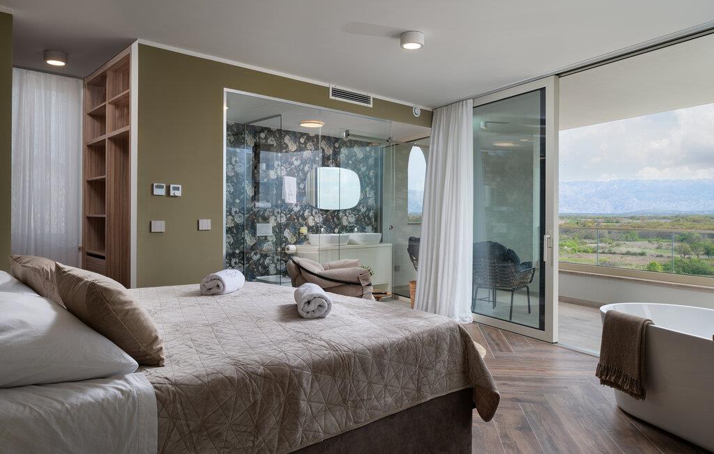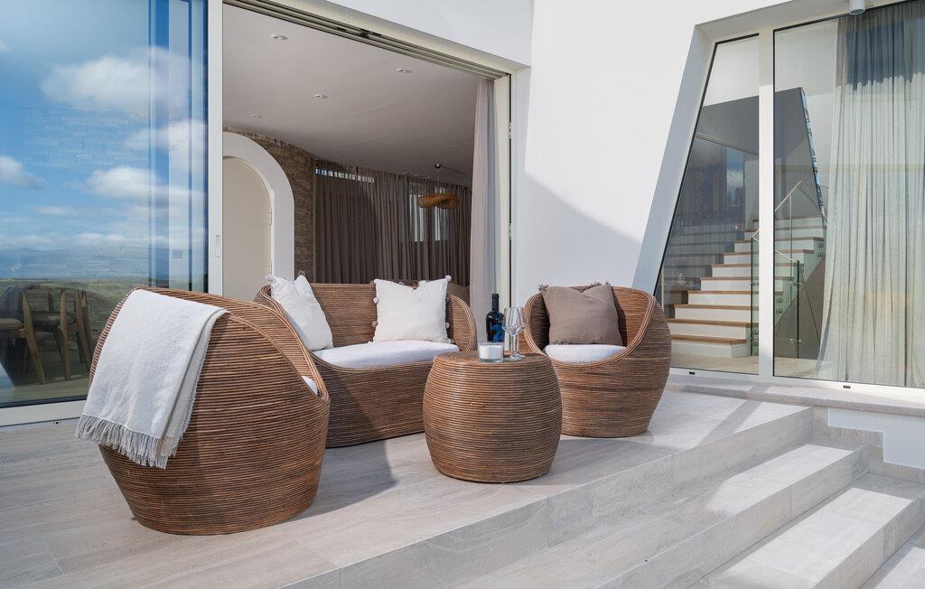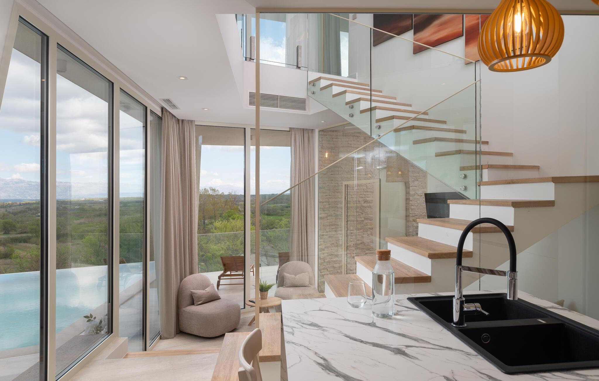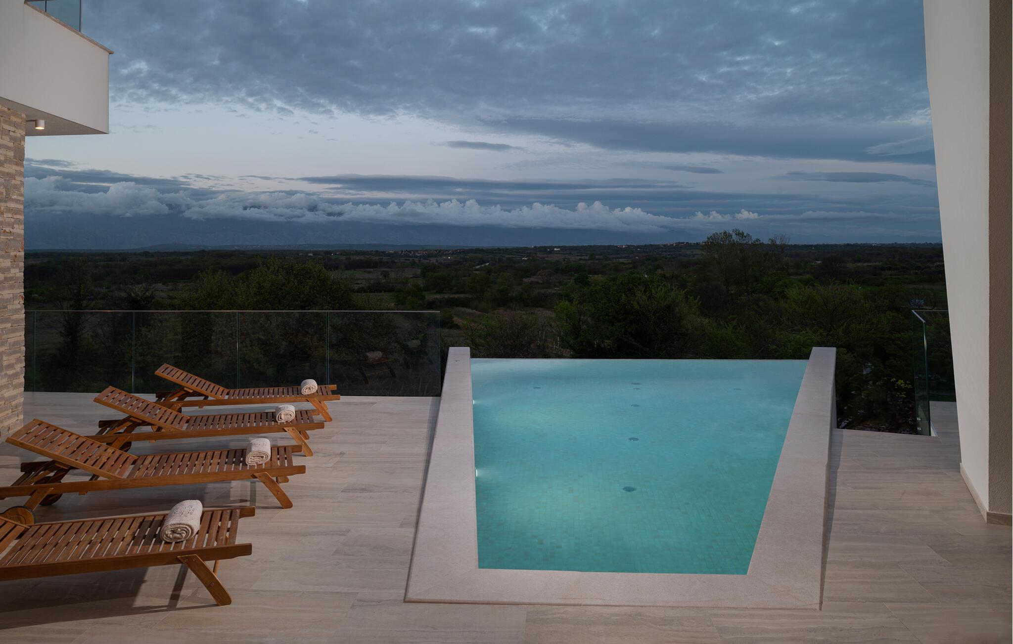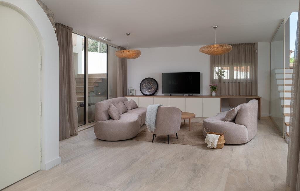 Dette moderne hus ligger i rolige omgivelser og byder jer velkommen med sin spændende arkitektur, der afspejler stilen fra de lokale kirker. Stilfulde designermøbler, natursten og varme trænuancer skaber en elegant, men indbydende atmosfære indenfor, der får jer til at føle jer hjemme. Det rummelige spa-område med sauna og spabad tilbyder den perfekte afslapning, og I kan nyde hyggelige aftener i villaens konoba (taverna).