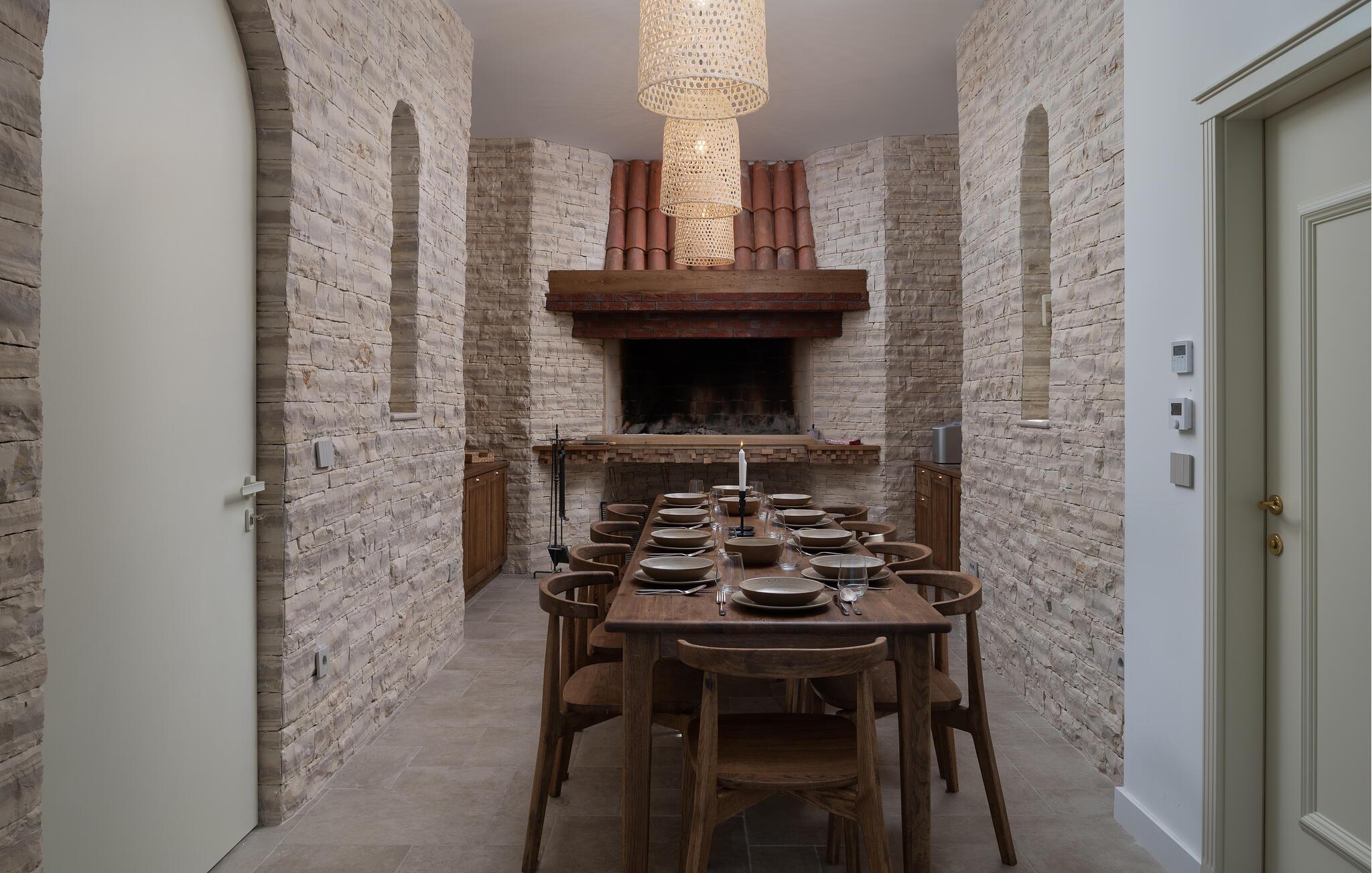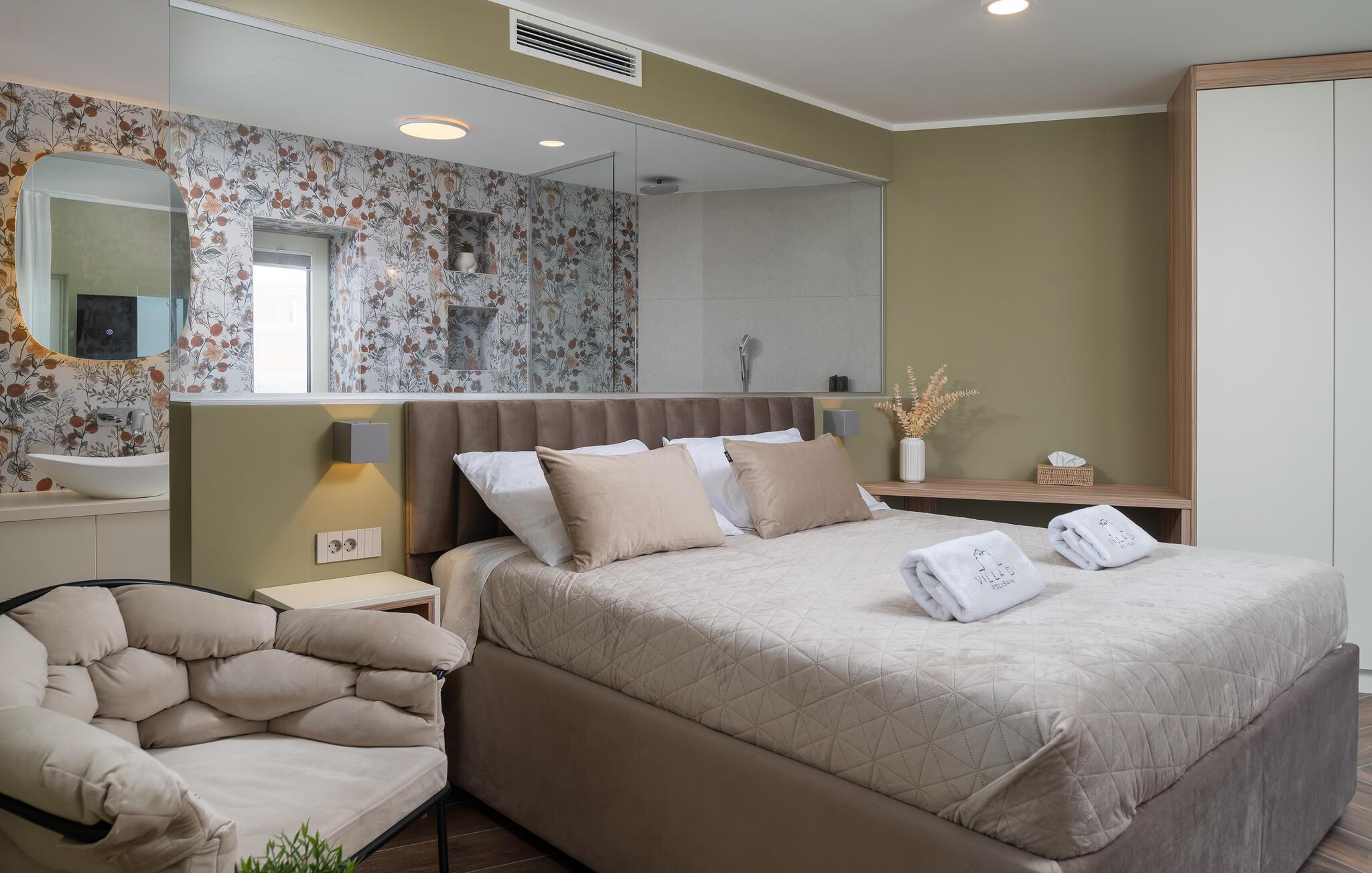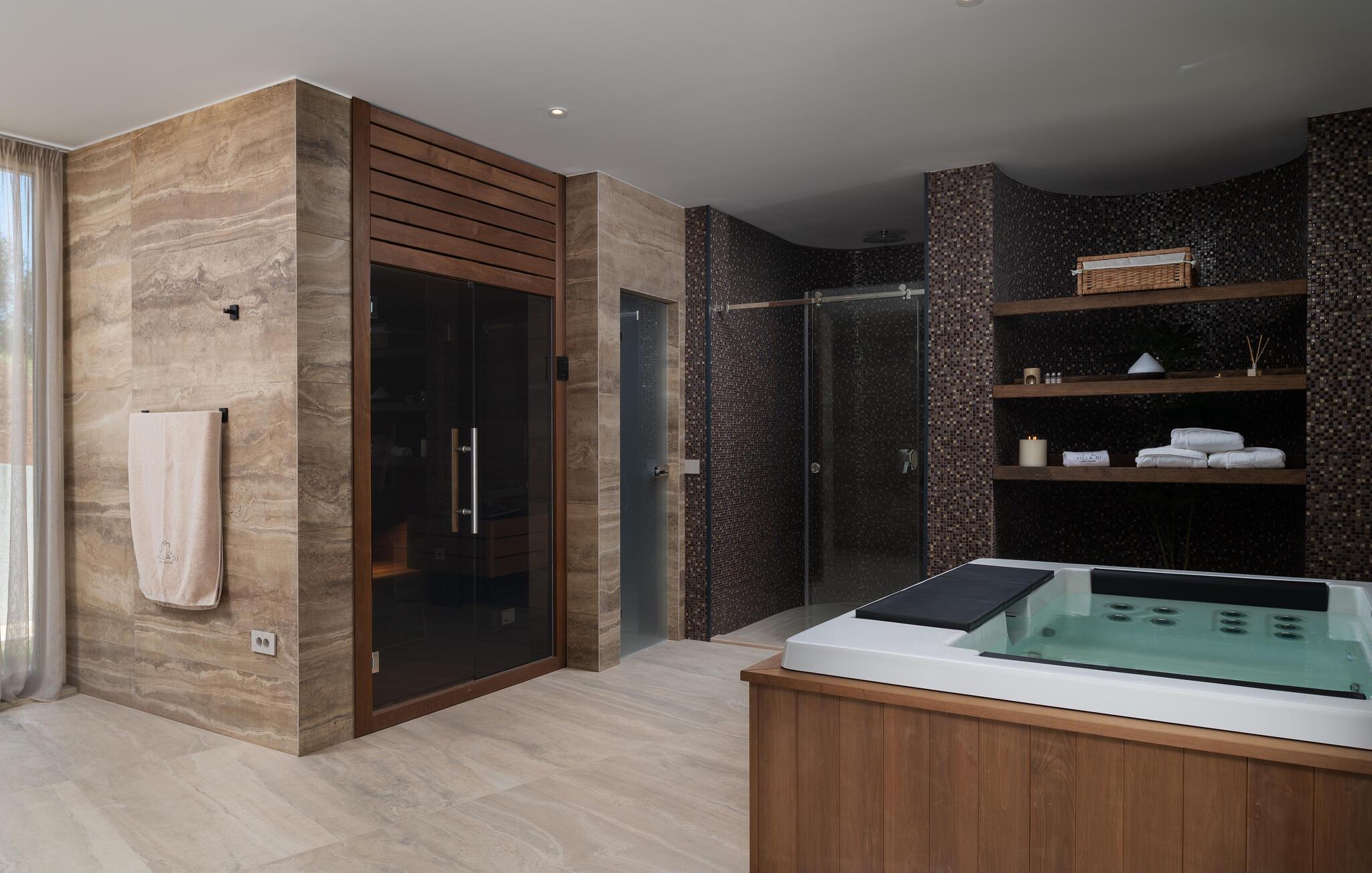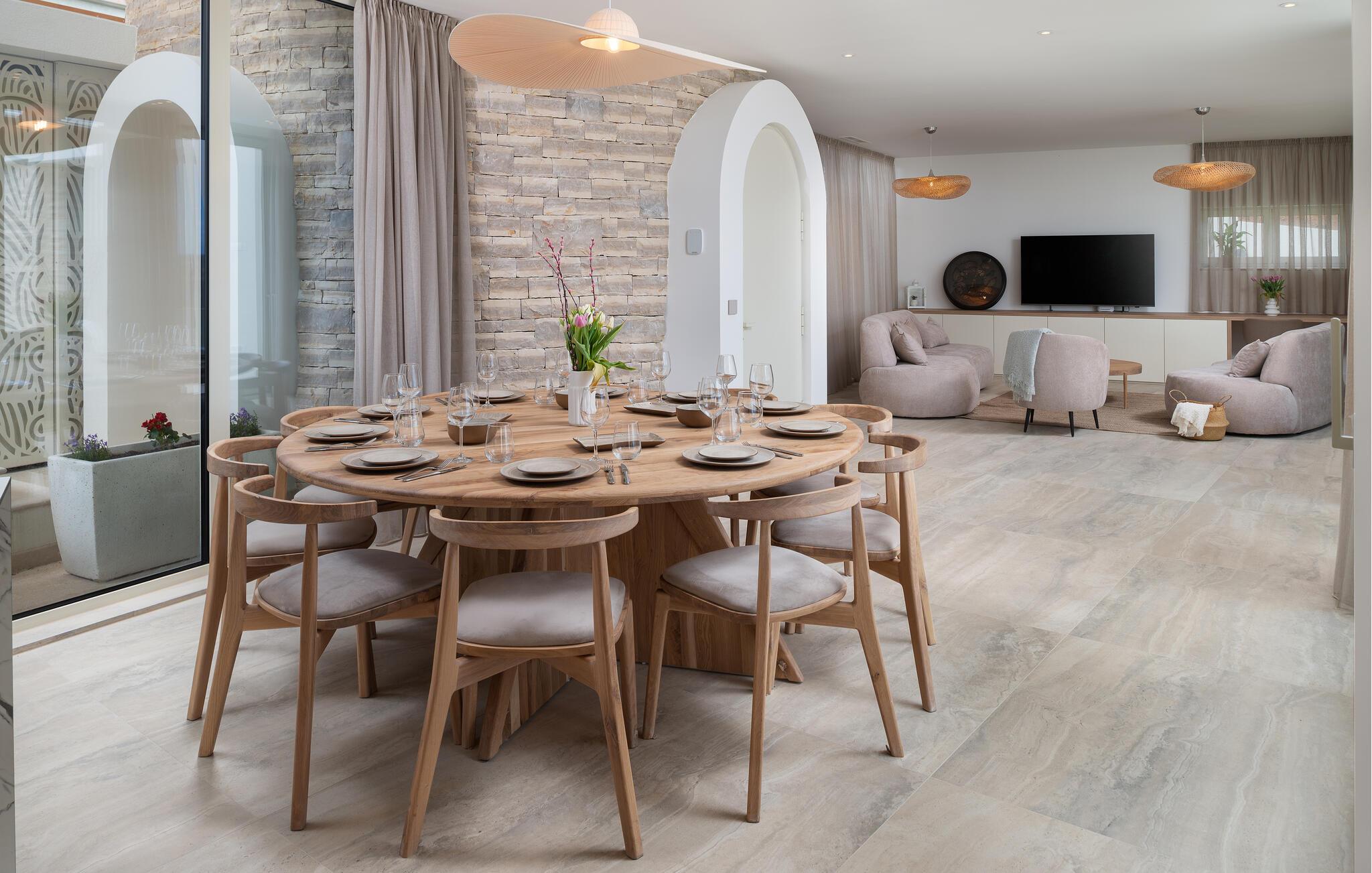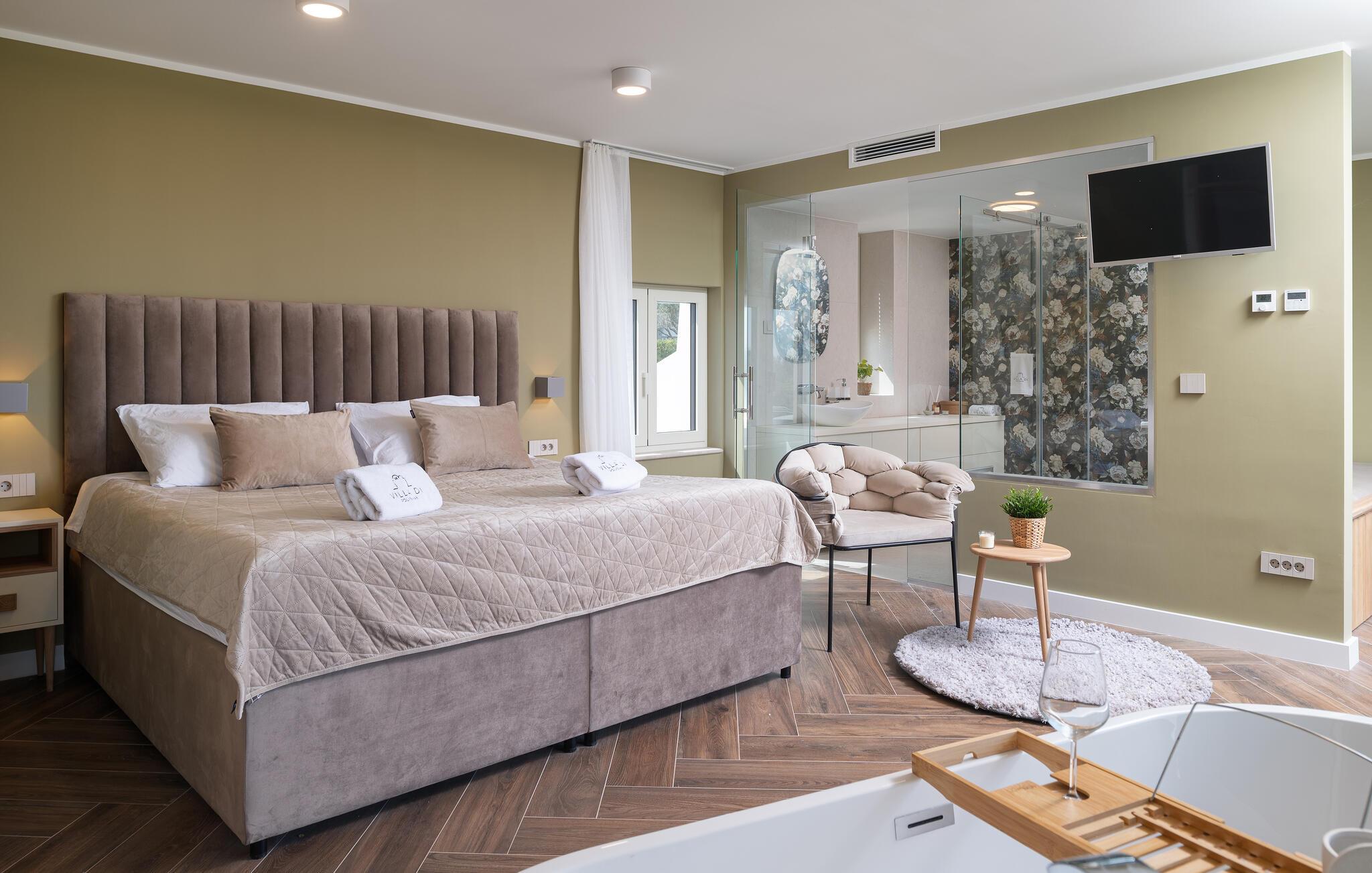 Dette moderne hus ligger i rolige omgivelser og byder jer velkommen med sin spændende arkitektur, der afspejler stilen fra de lokale kirker. Stilfulde designermøbler, natursten og varme trænuancer skaber en elegant, men indbydende atmosfære indenfor, der får jer til at føle jer hjemme. Det rummelige spa-område med sauna og spabad tilbyder den perfekte afslapning, og I kan nyde hyggelige aftener i villaens konoba (taverna).