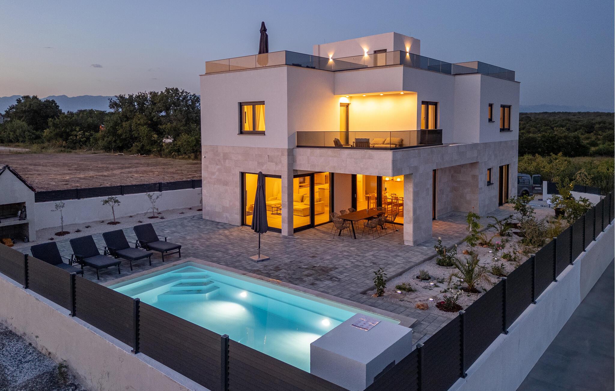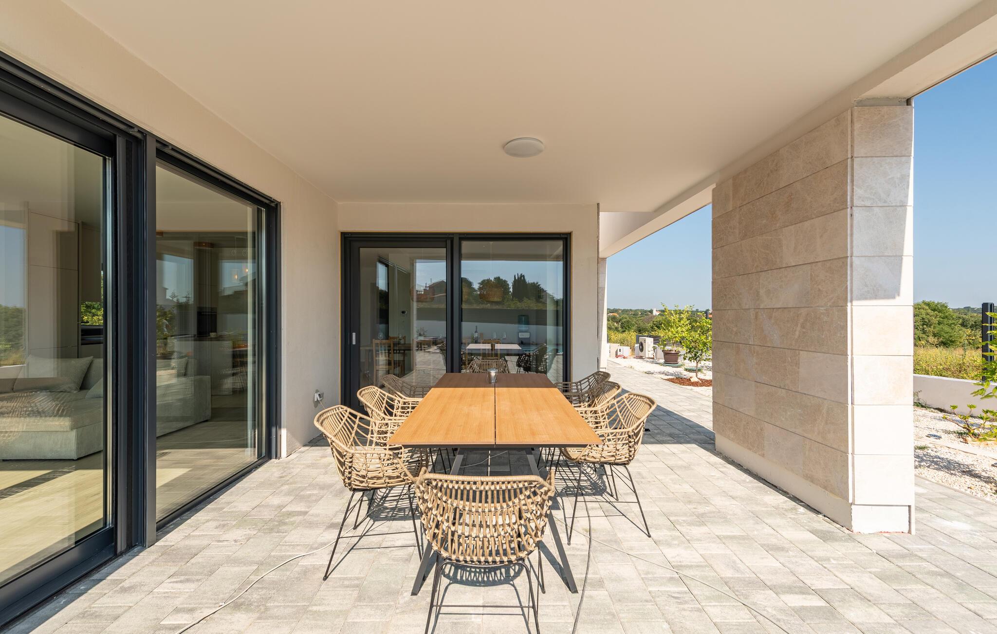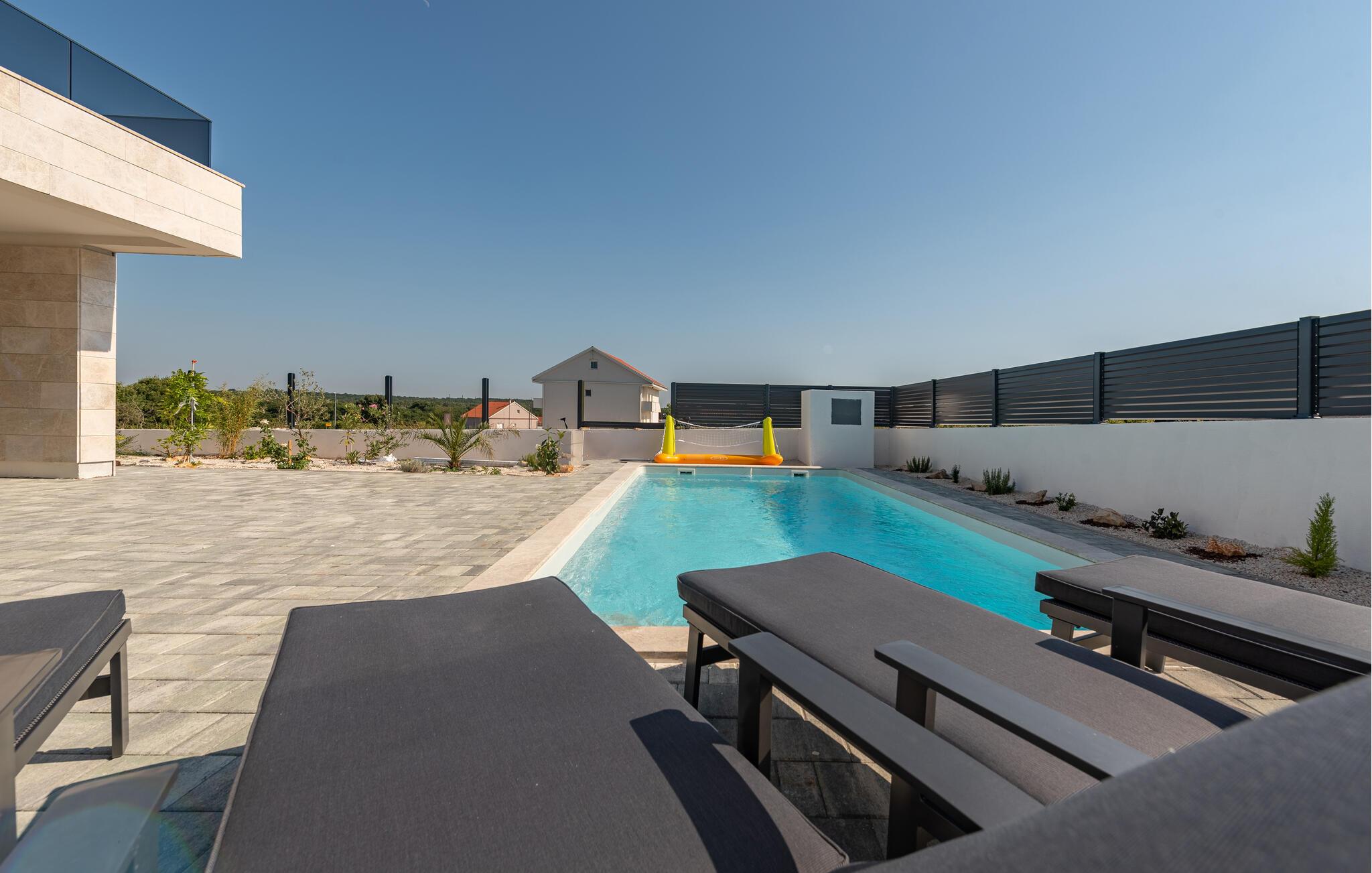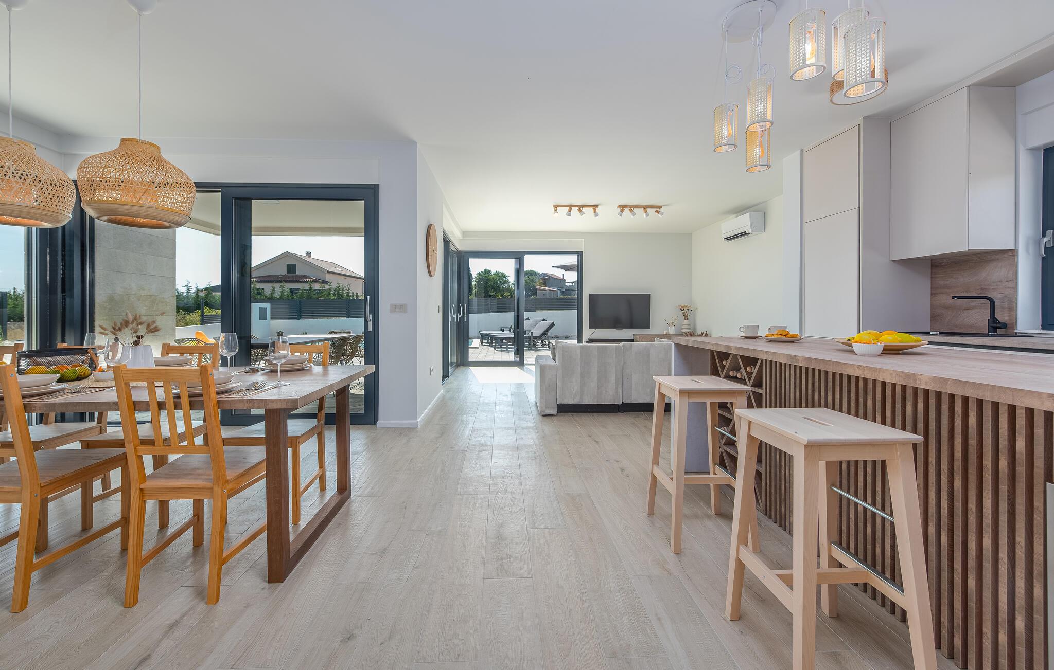 Glæd jer til en uforglemmelig ferie. Slap af i det rummelige poolområde, og nyd solen på de komfortable liggestole. Udendørsområdet er ideelt til solrige dage og hyggelige aftener under åben himmel. Indenfor venter et stilfuldt, åbent boligkoncept med masser af plads til hele familien. Nyd jeres måltider i det elegante spiseområde eller på den solrige terrasse med en pragtfuld udsigt over det omkringliggende landskab.