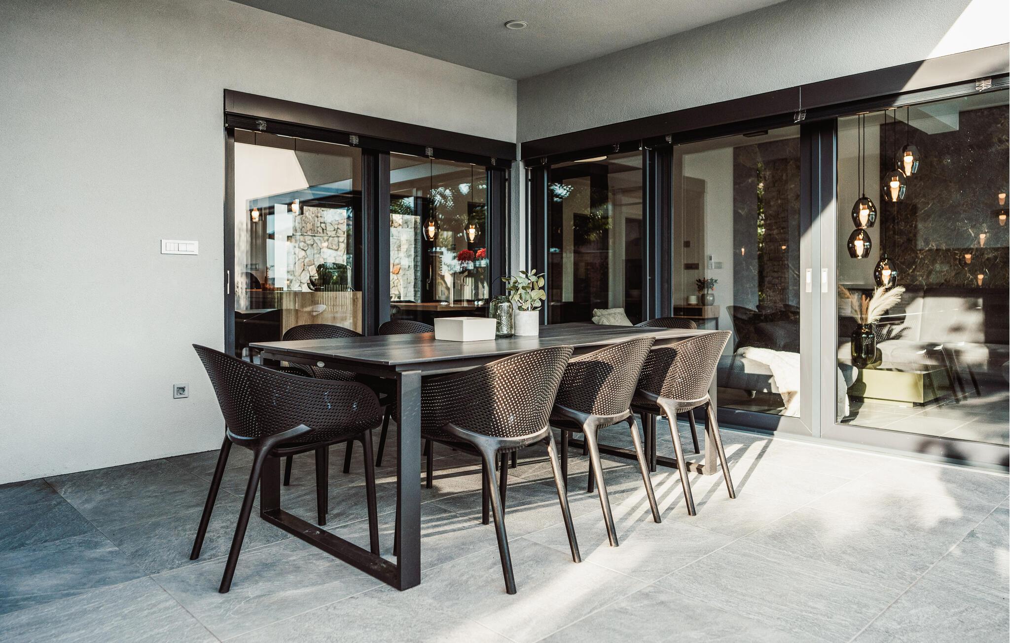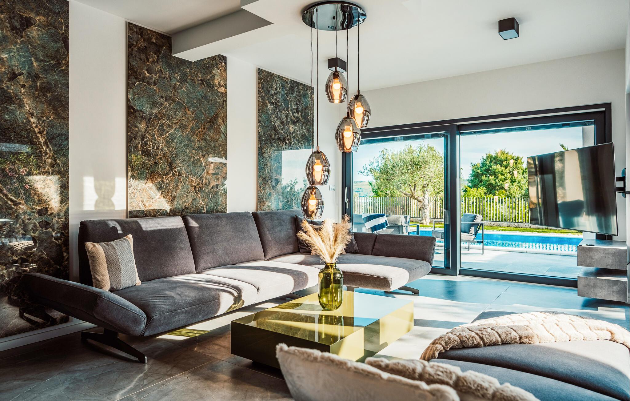 Det luksuriøse hus byder på mange smukke faciliteter. Slap af ved den private pool og nyd panoramaudsigten over det glitrende hav, der ligger lige foran jeres feriehus. Afslut dagen med en lækker grillmiddag på den overdækkede terrasse eller slap af på de komfortable liggestole.