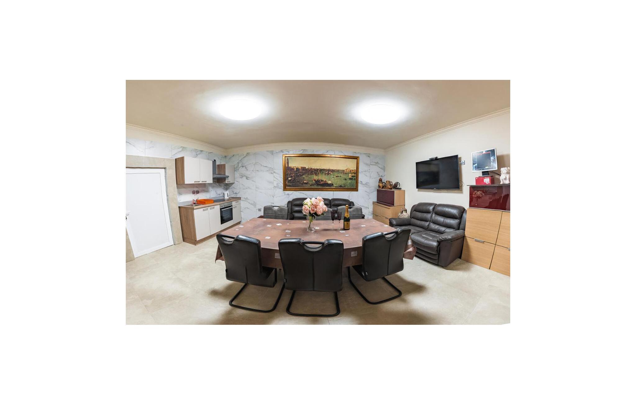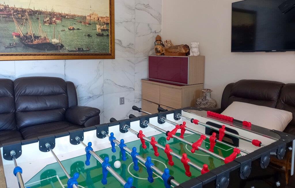 Dette hus kombinerer komfort og rustik charme på en behagelig måde. En komfortabel sofa, et tv og et moderne køkken skaber en hyggelig atmosfære, hvor I hurtigt kan slappe af og slappe af. Uanset om I streamer jeres yndlingsserier, spiller bordfodbold eller tilbereder lækre måltider sammen – her sætter I tempoet for dagen.
