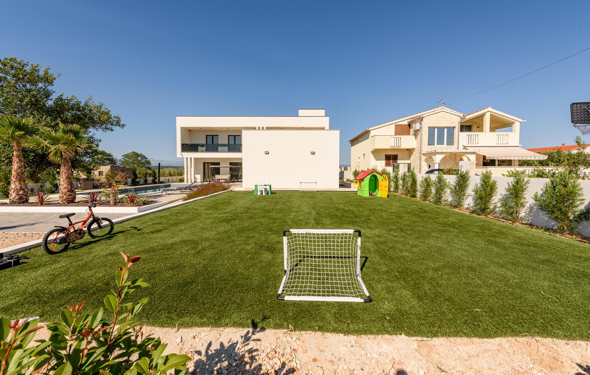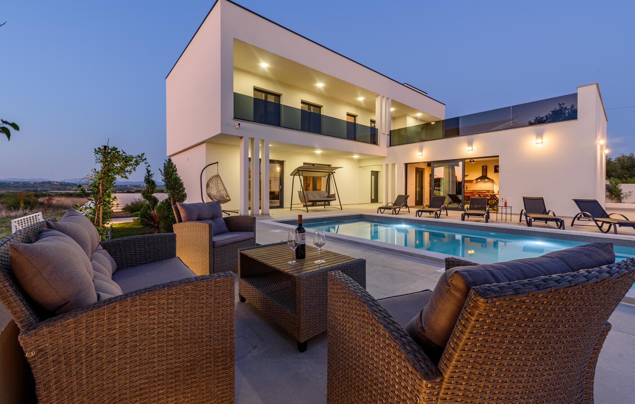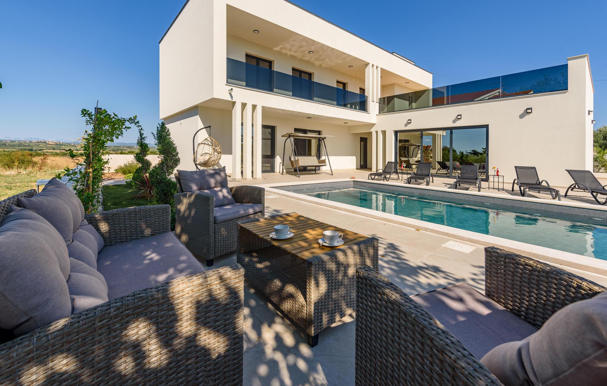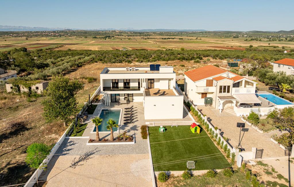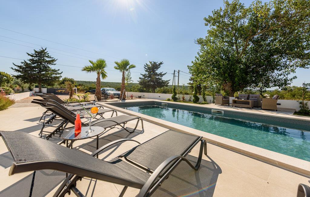 Oplev en afslappende ferie i dette komfortable feriehus med pool, beliggende tæt på havet. Dette moderne hus byder jer velkommen med en beroligende atmosfære, hvor komfort og elegance harmonisk forenes. Lyse værelser, en rummelig sofagruppe og et praktisk køkken sikrer, at I straks føler jer hjemme. Tilbered lækre måltider sammen og server dem med et glas kroatisk vin. Bagefter inviterer sofaen jer til at slappe af foran fjernsynet. Som det første om morgenen kan I hoppe i poolen og tage en forfriskende dukkert. Slap af på en af liggestolene med en kølig drink eller bladre i jeres ferieroman, mens jeres børn udforsker vippen og legehuset. Tilbring aftenen på terrassen og afslut dagen med en grillfest sammen. Svøm i det krystalklare hav på strandene i Zadar-regionen og nyd forfriskende timer ved Adriaterhavskysten. Udforsk den charmerende gamle bydel i Zadar med dens historiske bygninger, smalle gader og det berømte Havorgel. I nærheden ligger også et vandland, naturparken Vrana-søen og den kongelige by Biograd, der kan prale af kultur og historie. Tag på udflugter til baglandet, hvor olivenlunde, vinmarker og traditionelle landsbyer tilbyder et autentisk glimt af Dalmatien.