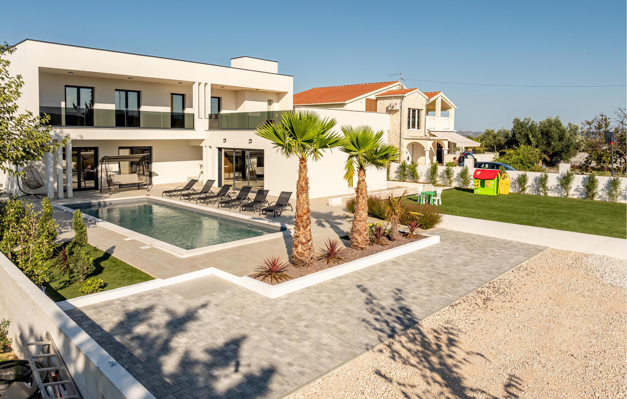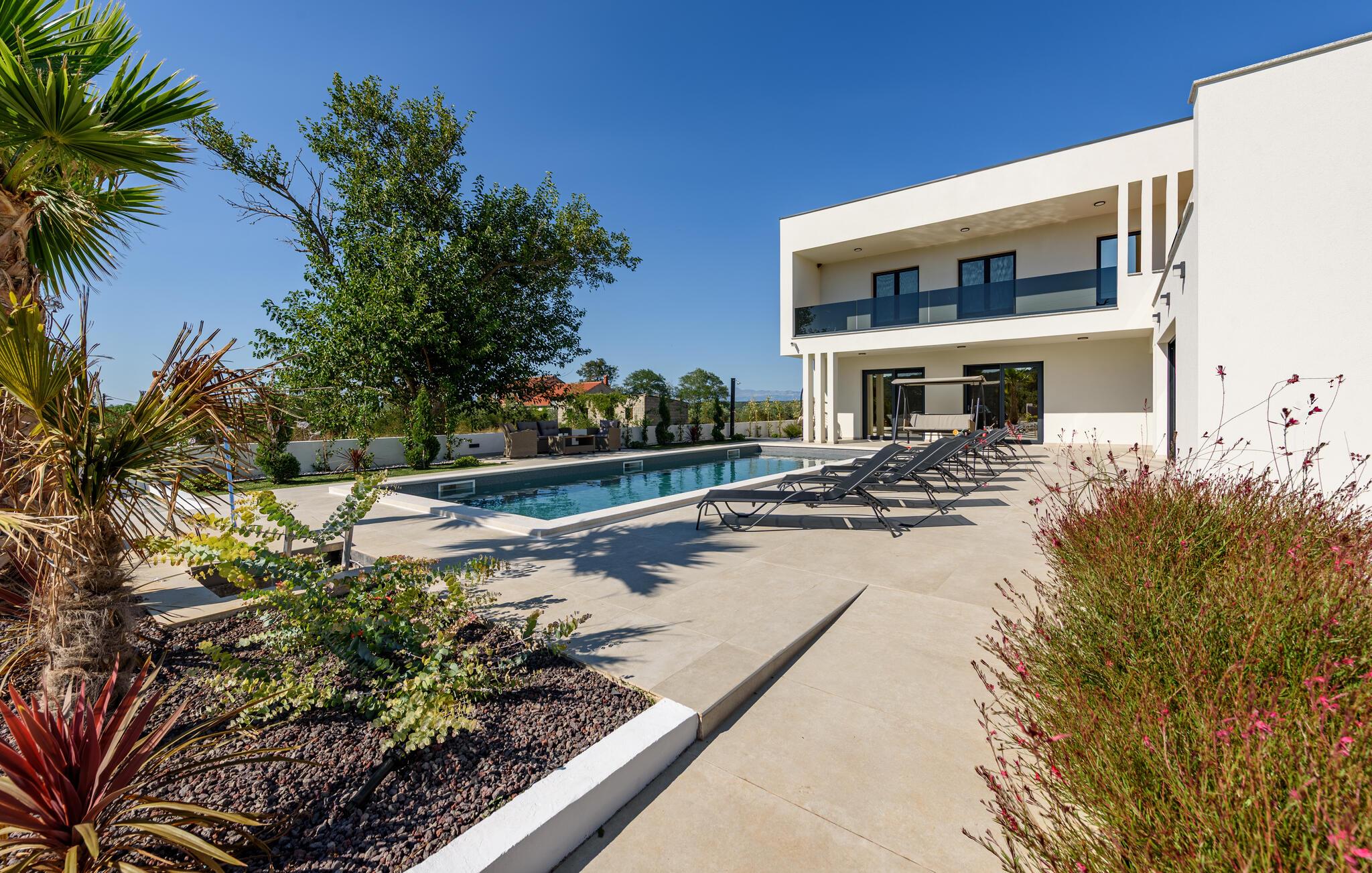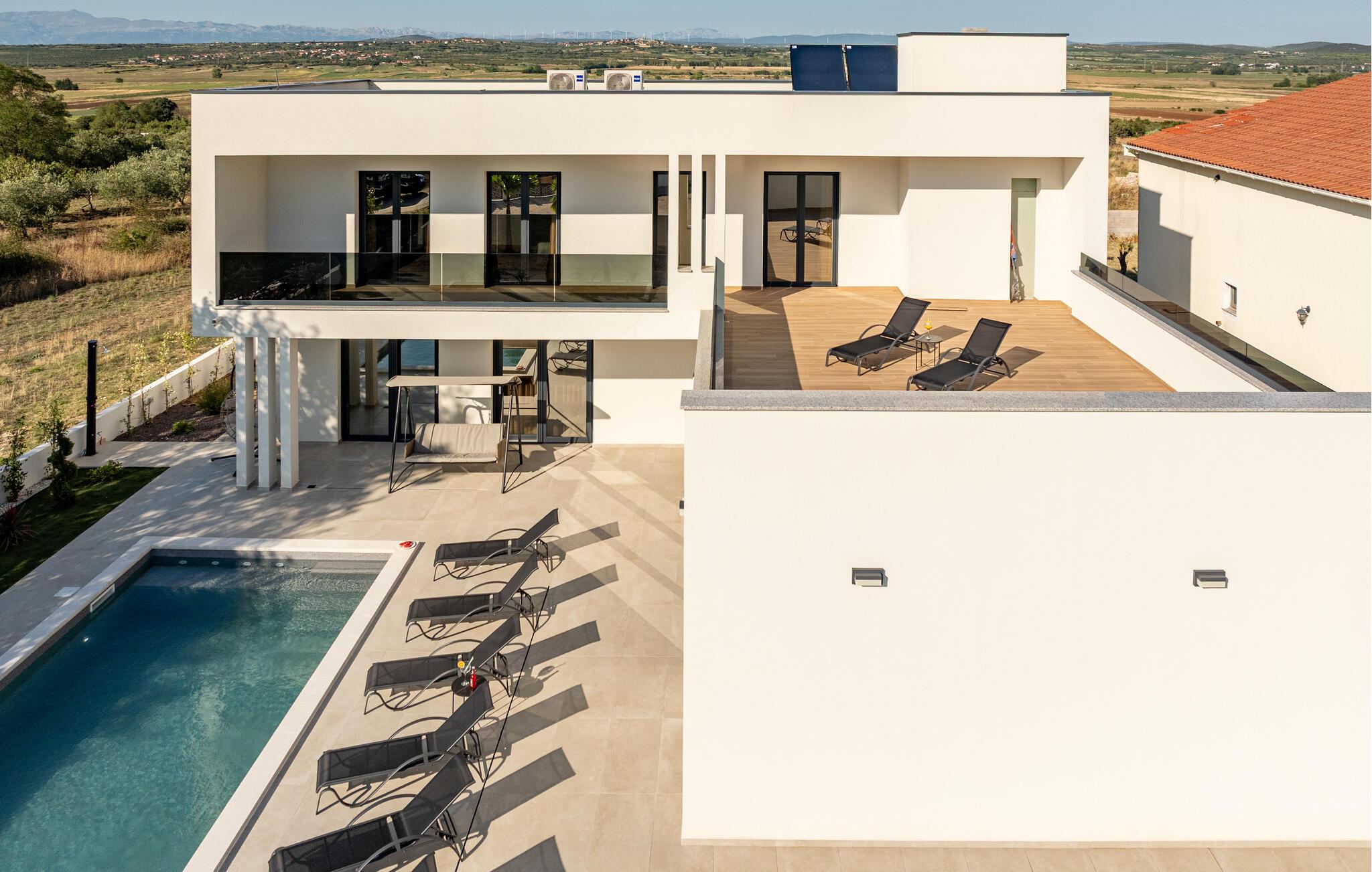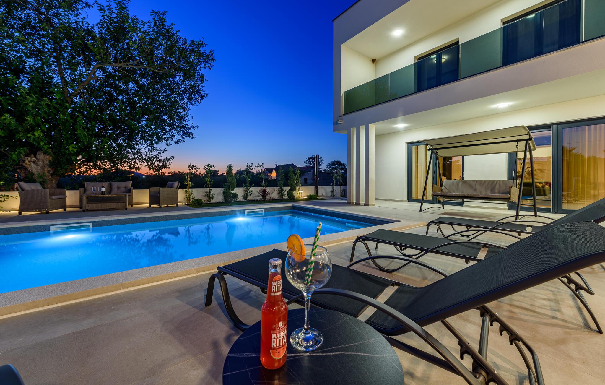 Oplev en afslappende ferie i dette komfortable feriehus med pool, beliggende tæt på havet. Dette moderne hus byder jer velkommen med en beroligende atmosfære, hvor komfort og elegance harmonisk forenes. Lyse værelser, en rummelig sofagruppe og et praktisk køkken sikrer, at I straks føler jer hjemme. Tilbered lækre måltider sammen og server dem med et glas kroatisk vin. Bagefter inviterer sofaen jer til at slappe af foran fjernsynet. Som det første om morgenen kan I hoppe i poolen og tage en forfriskende dukkert. Slap af på en af liggestolene med en kølig drink eller bladre i jeres ferieroman, mens jeres børn udforsker vippen og legehuset. Tilbring aftenen på terrassen og afslut dagen med en grillfest sammen. Svøm i det krystalklare hav på strandene i Zadar-regionen og nyd forfriskende timer ved Adriaterhavskysten. Udforsk den charmerende gamle bydel i Zadar med dens historiske bygninger, smalle gader og det berømte Havorgel. I nærheden ligger også et vandland, naturparken Vrana-søen og den kongelige by Biograd, der kan prale af kultur og historie. Tag på udflugter til baglandet, hvor olivenlunde, vinmarker og traditionelle landsbyer tilbyder et autentisk glimt af Dalmatien.