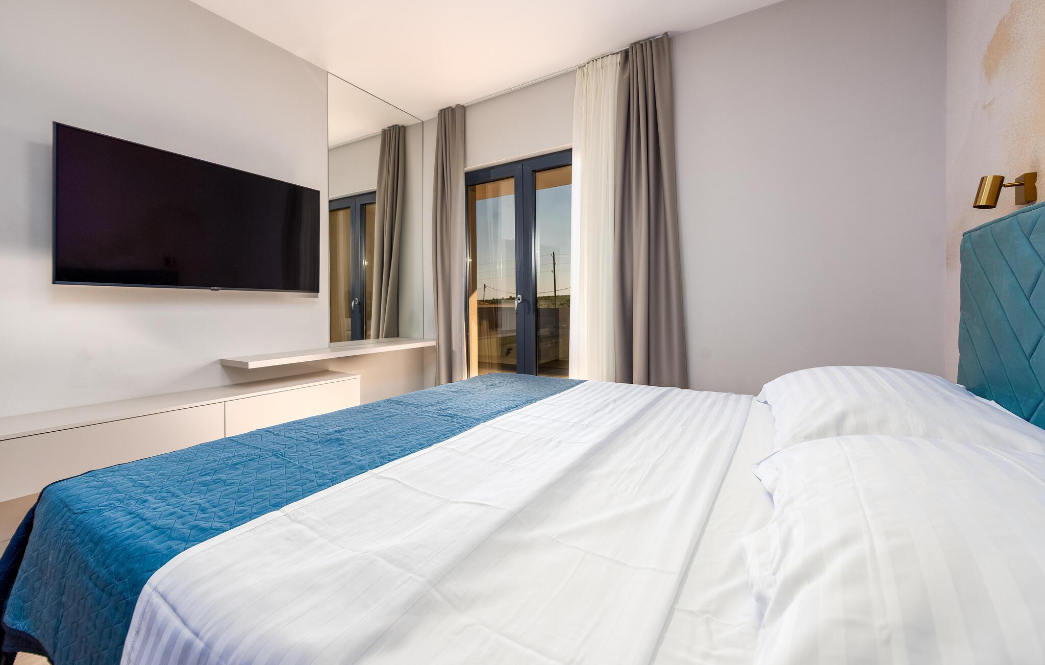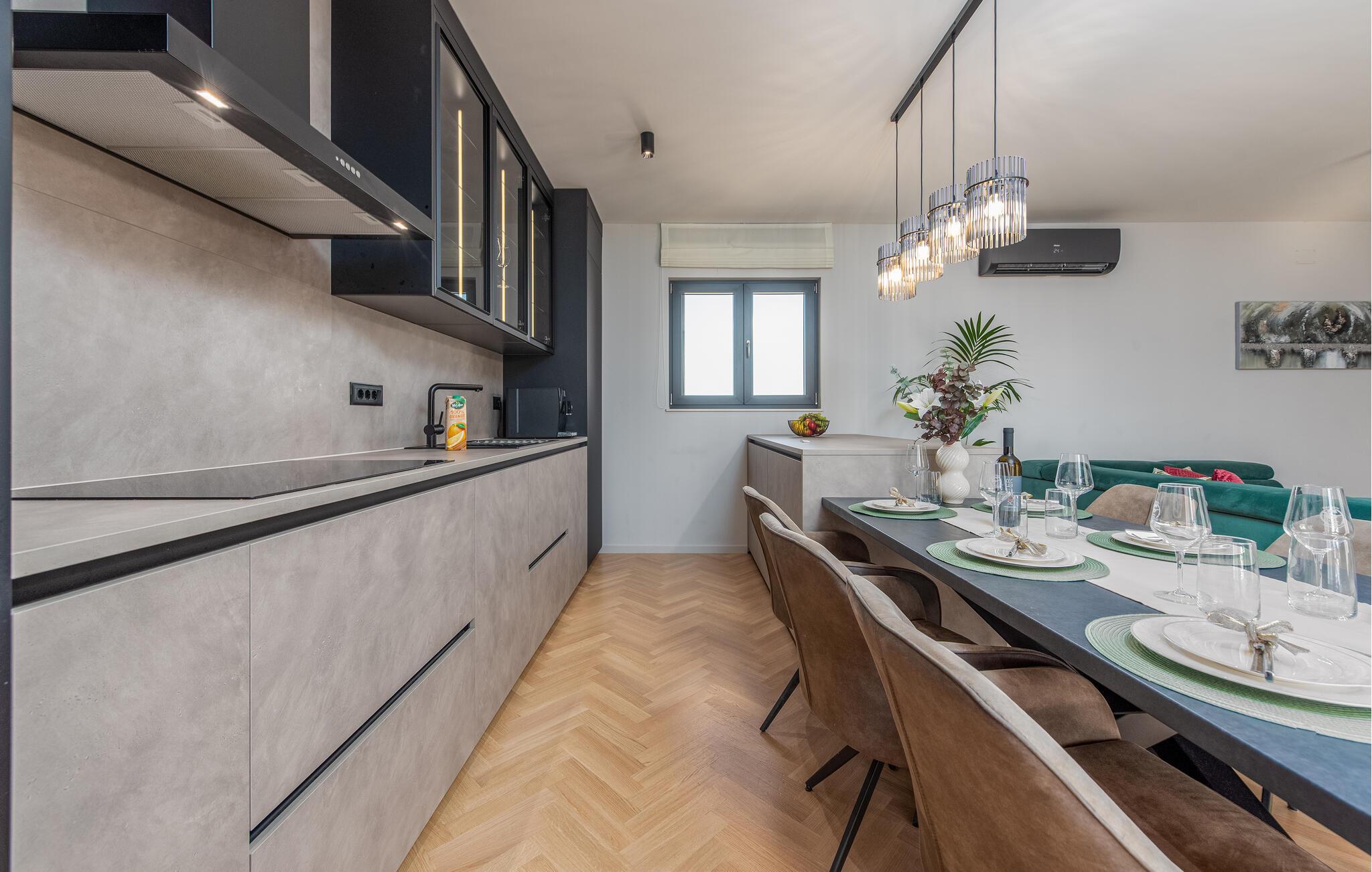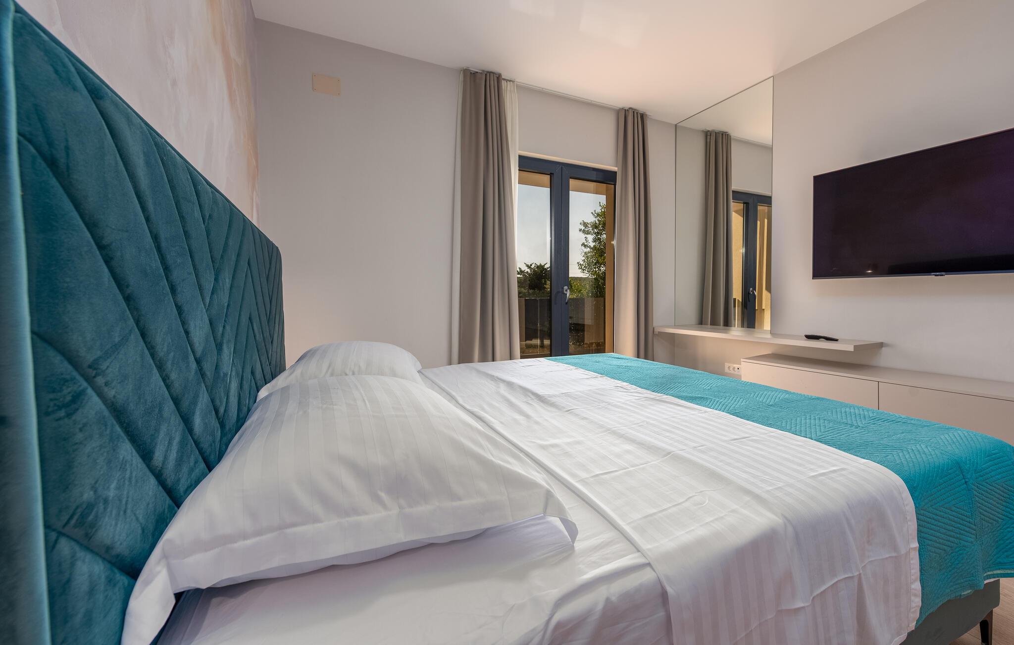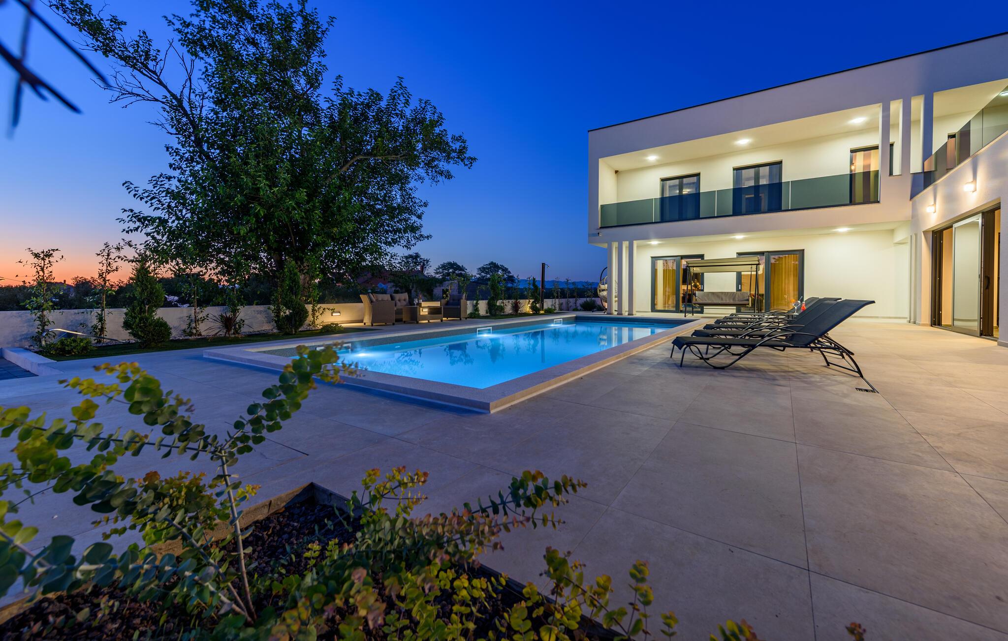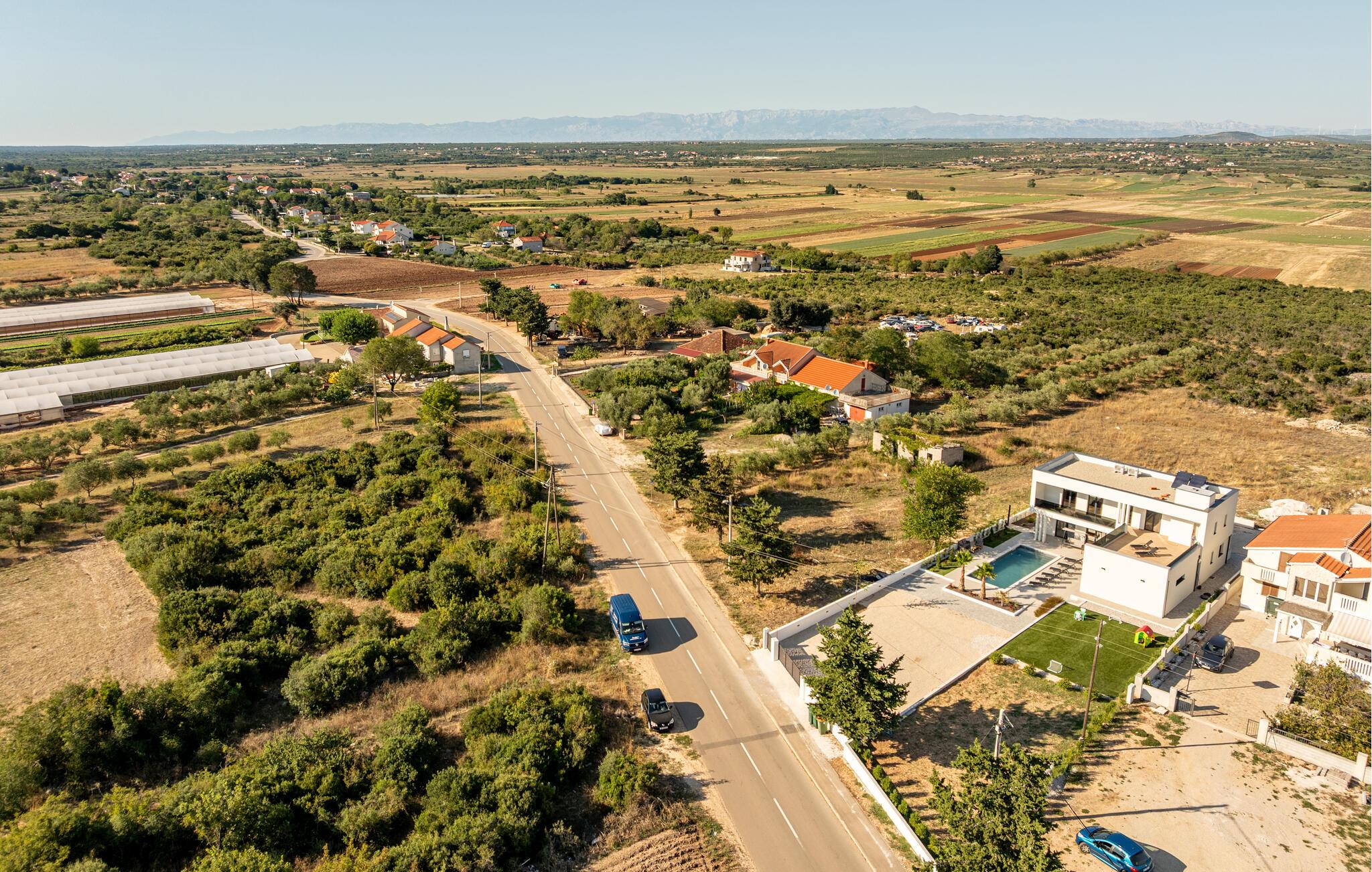 Oplev en afslappende ferie i dette komfortable feriehus med pool, beliggende tæt på havet. Dette moderne hus byder jer velkommen med en beroligende atmosfære, hvor komfort og elegance harmonisk forenes. Lyse værelser, en rummelig sofagruppe og et praktisk køkken sikrer, at I straks føler jer hjemme. Tilbered lækre måltider sammen og server dem med et glas kroatisk vin. Bagefter inviterer sofaen jer til at slappe af foran fjernsynet. Som det første om morgenen kan I hoppe i poolen og tage en forfriskende dukkert. Slap af på en af liggestolene med en kølig drink eller bladre i jeres ferieroman, mens jeres børn udforsker vippen og legehuset. Tilbring aftenen på terrassen og afslut dagen med en grillfest sammen. Svøm i det krystalklare hav på strandene i Zadar-regionen og nyd forfriskende timer ved Adriaterhavskysten. Udforsk den charmerende gamle bydel i Zadar med dens historiske bygninger, smalle gader og det berømte Havorgel. I nærheden ligger også et vandland, naturparken Vrana-søen og den kongelige by Biograd, der kan prale af kultur og historie. Tag på udflugter til baglandet, hvor olivenlunde, vinmarker og traditionelle landsbyer tilbyder et autentisk glimt af Dalmatien.