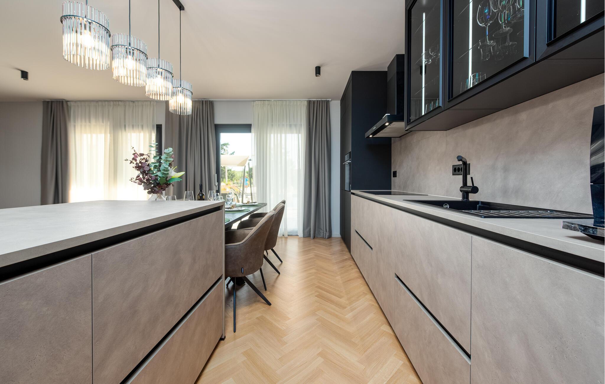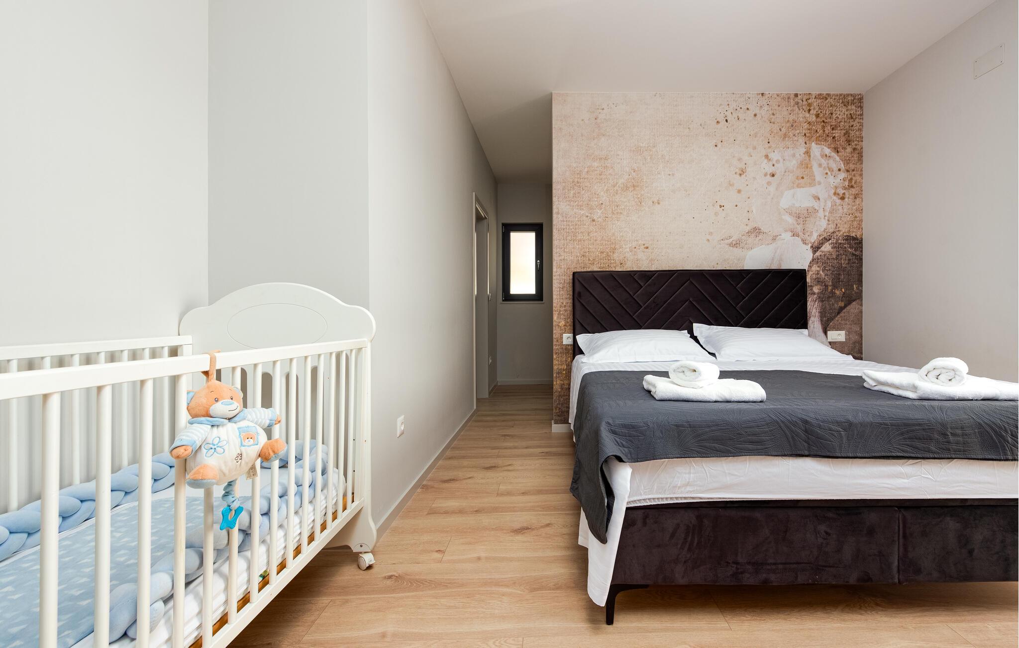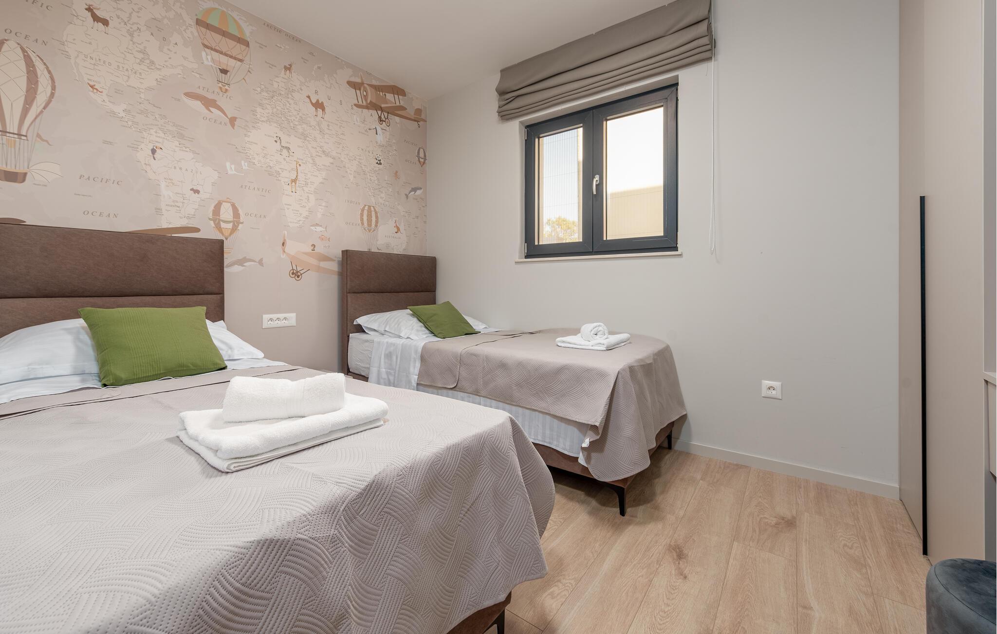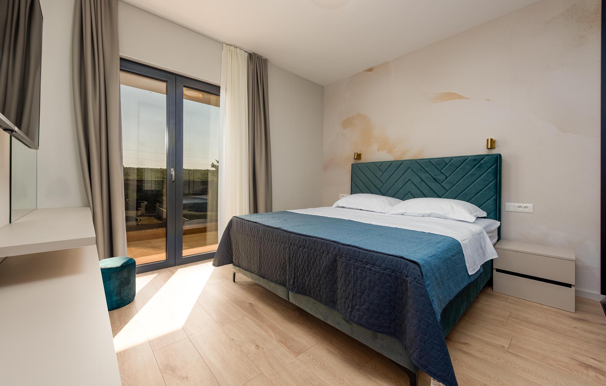 Oplev en afslappende ferie i dette komfortable feriehus med pool, beliggende tæt på havet. Dette moderne hus byder jer velkommen med en beroligende atmosfære, hvor komfort og elegance harmonisk forenes. Lyse værelser, en rummelig sofagruppe og et praktisk køkken sikrer, at I straks føler jer hjemme. Tilbered lækre måltider sammen og server dem med et glas kroatisk vin. Bagefter inviterer sofaen jer til at slappe af foran fjernsynet. Som det første om morgenen kan I hoppe i poolen og tage en forfriskende dukkert. Slap af på en af liggestolene med en kølig drink eller bladre i jeres ferieroman, mens jeres børn udforsker vippen og legehuset. Tilbring aftenen på terrassen og afslut dagen med en grillfest sammen. Svøm i det krystalklare hav på strandene i Zadar-regionen og nyd forfriskende timer ved Adriaterhavskysten. Udforsk den charmerende gamle bydel i Zadar med dens historiske bygninger, smalle gader og det berømte Havorgel. I nærheden ligger også et vandland, naturparken Vrana-søen og den kongelige by Biograd, der kan prale af kultur og historie. Tag på udflugter til baglandet, hvor olivenlunde, vinmarker og traditionelle landsbyer tilbyder et autentisk glimt af Dalmatien.