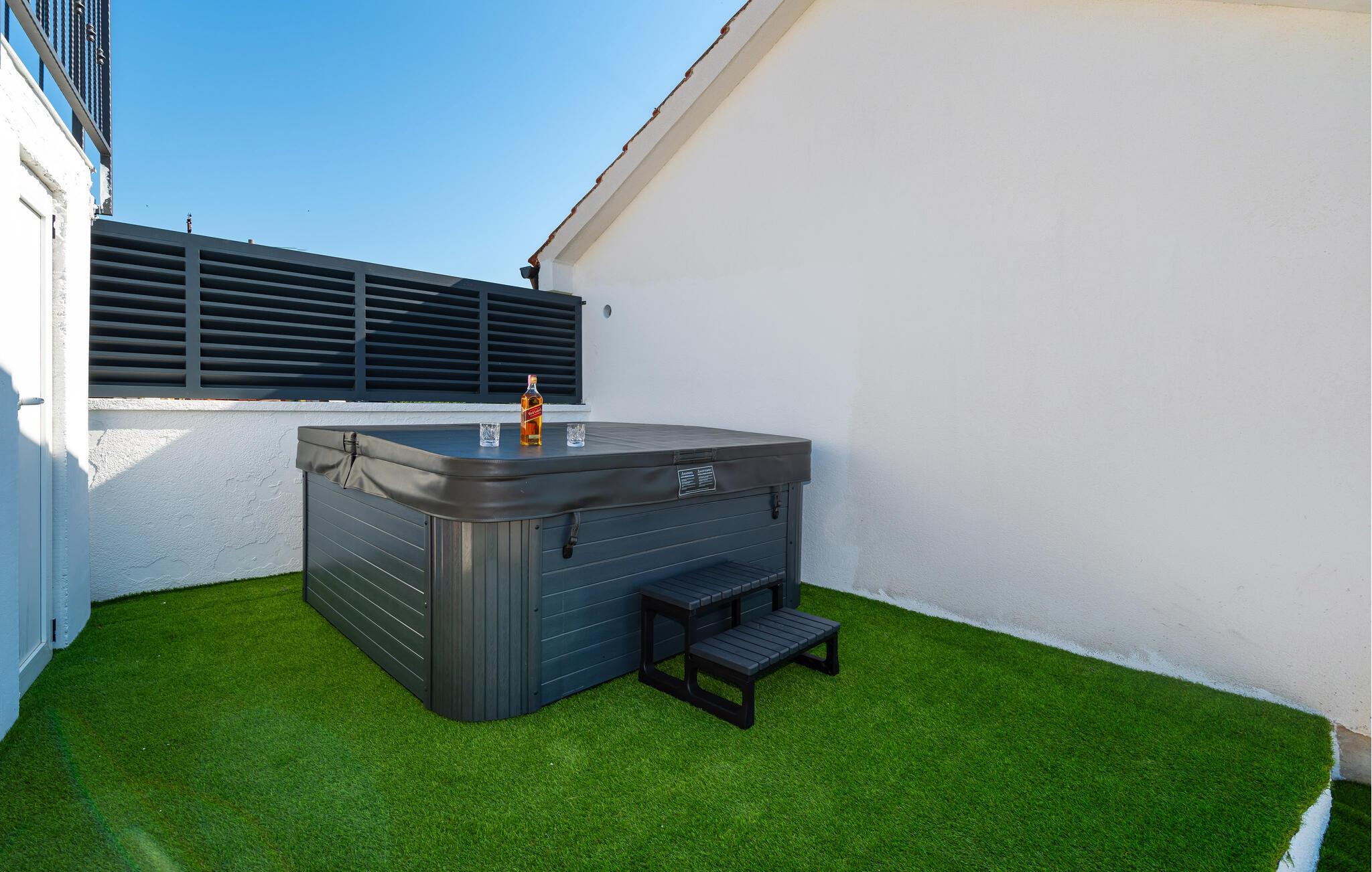 Til huset hører en skøn have, hvor udsigten er ekstra god, og hvor I kan runde en smuk sommeraften af med en tur i spabadet med en kølig drink.