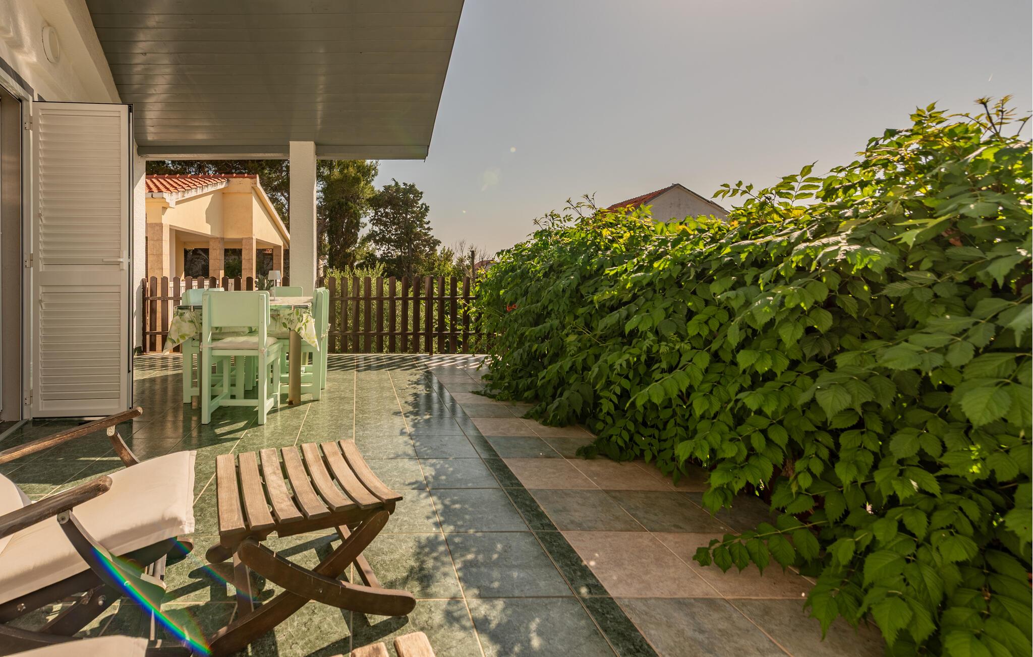 Dæk op til en lækker morgenmad i den milde morgensol, fordyb jer i jeres ferielæsning på de behagelige liggestole, og forbered alt til en stemningsfuld grillaften på den skyggefulde, overdækkede terrasse.