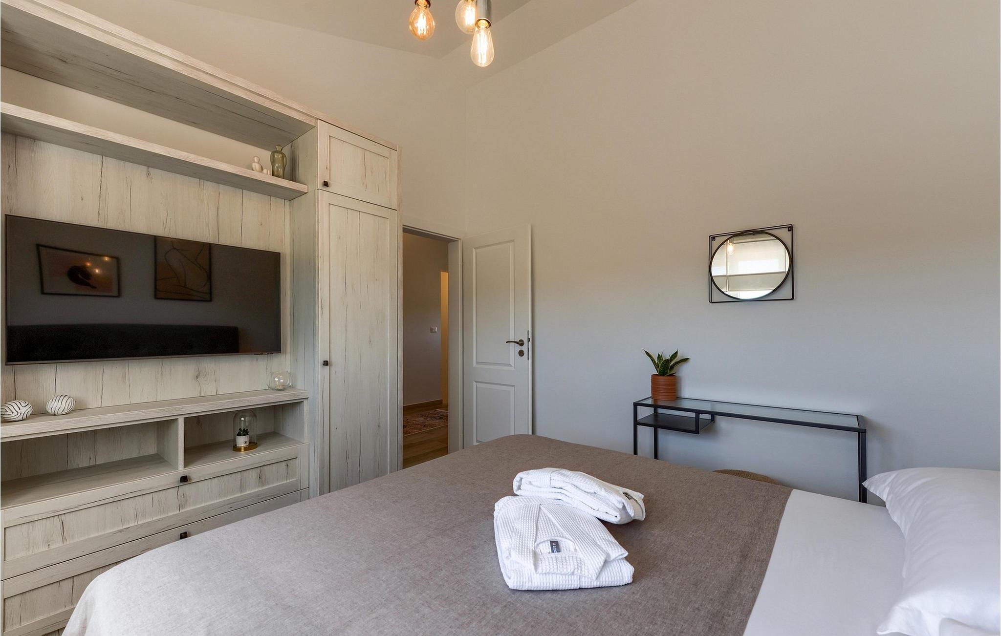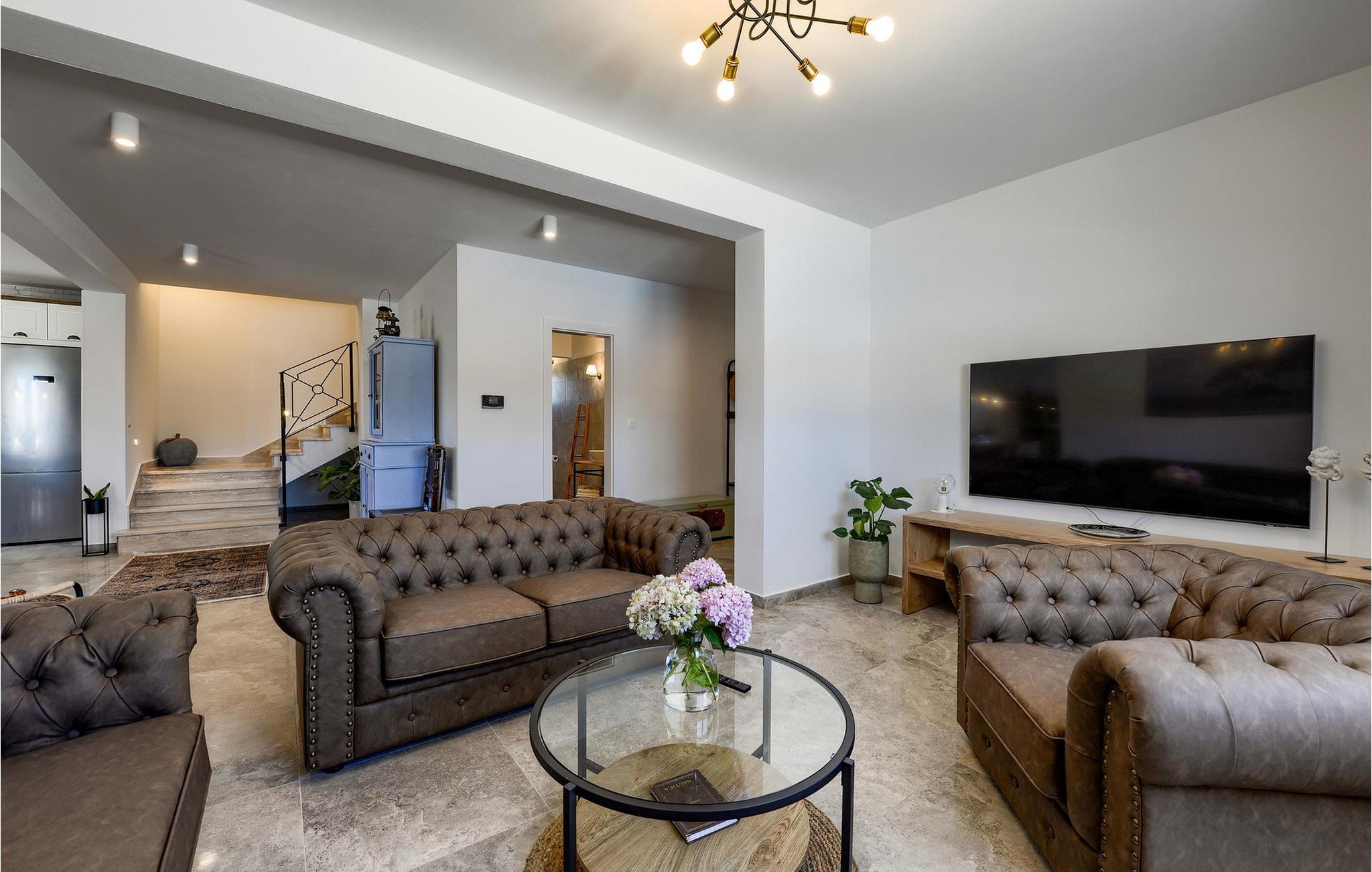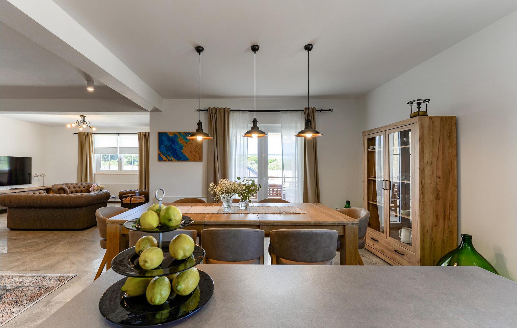 Villa Tesoro har en varm og indbydende atmosfære, hvor naturlige materialer, bløde farver og gennemtænkte detaljer skaber en harmonisk opholdsoplevelse. Tilbring hyggelige timer i den elegante stue, hvor komfortable sofaer og et stort tv lægger op til at nyde filmaftener. Brug de forskellige siddeområder til at læse, snakke eller spille kort. Arranger en hyggelig madlavningskonkurrence i det rummelige køkken og nyd måltider sammen ved det store træbord.