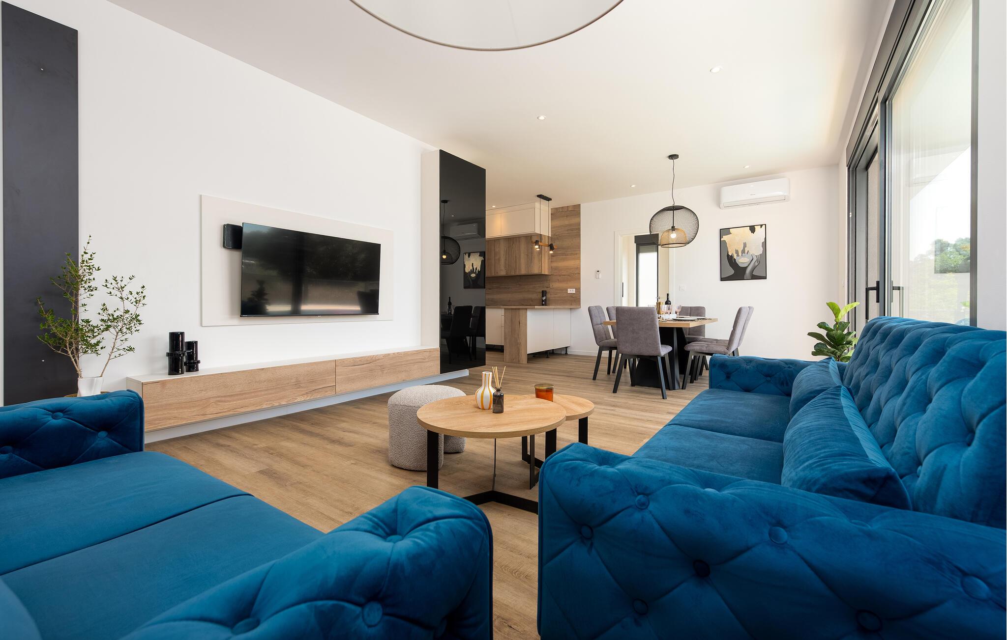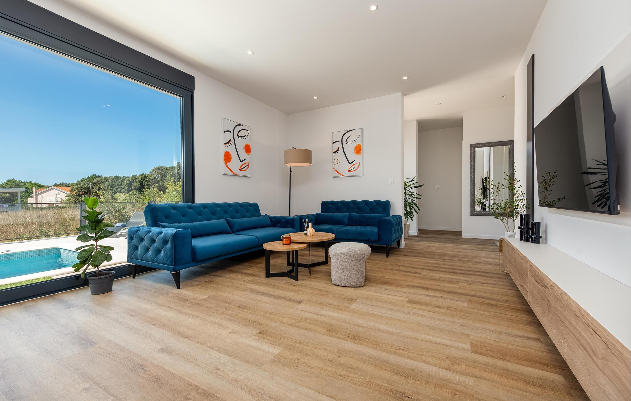Dette moderne hus kombinerer elegance og komfort på harmonisk vis. gulv til loft-vinduer lader masser af varmt naturligt lys komme ind, samtidig med at de tilbyder en fantastisk udsigt over det omkringliggende landskab. Et varmt trælook og et elegant sofaområde sikrer yderligere et afslappende ophold. Uanset om I streamer jeres yndlingsserie eller lytter til en interessant podcast, sætter I selv tempoet for jeres dag her.
