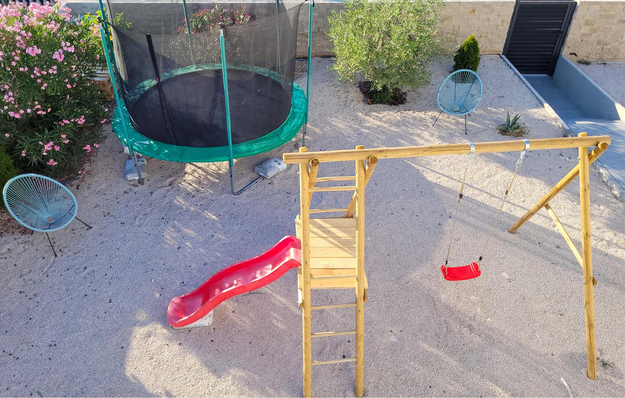 Begynd dagene på terrassen med en aromatisk kop kaffe. Nyd en afslappet morgenmad her, mens I nyder udsigten over træerne og den blide havbrise. Tag en forfriskende dukkert i den fælles pool, og slap derefter af på en af ??liggestolene. børnene kan boltre sig på trampolinen eller gynge og klatre efter hjertens lyst.
