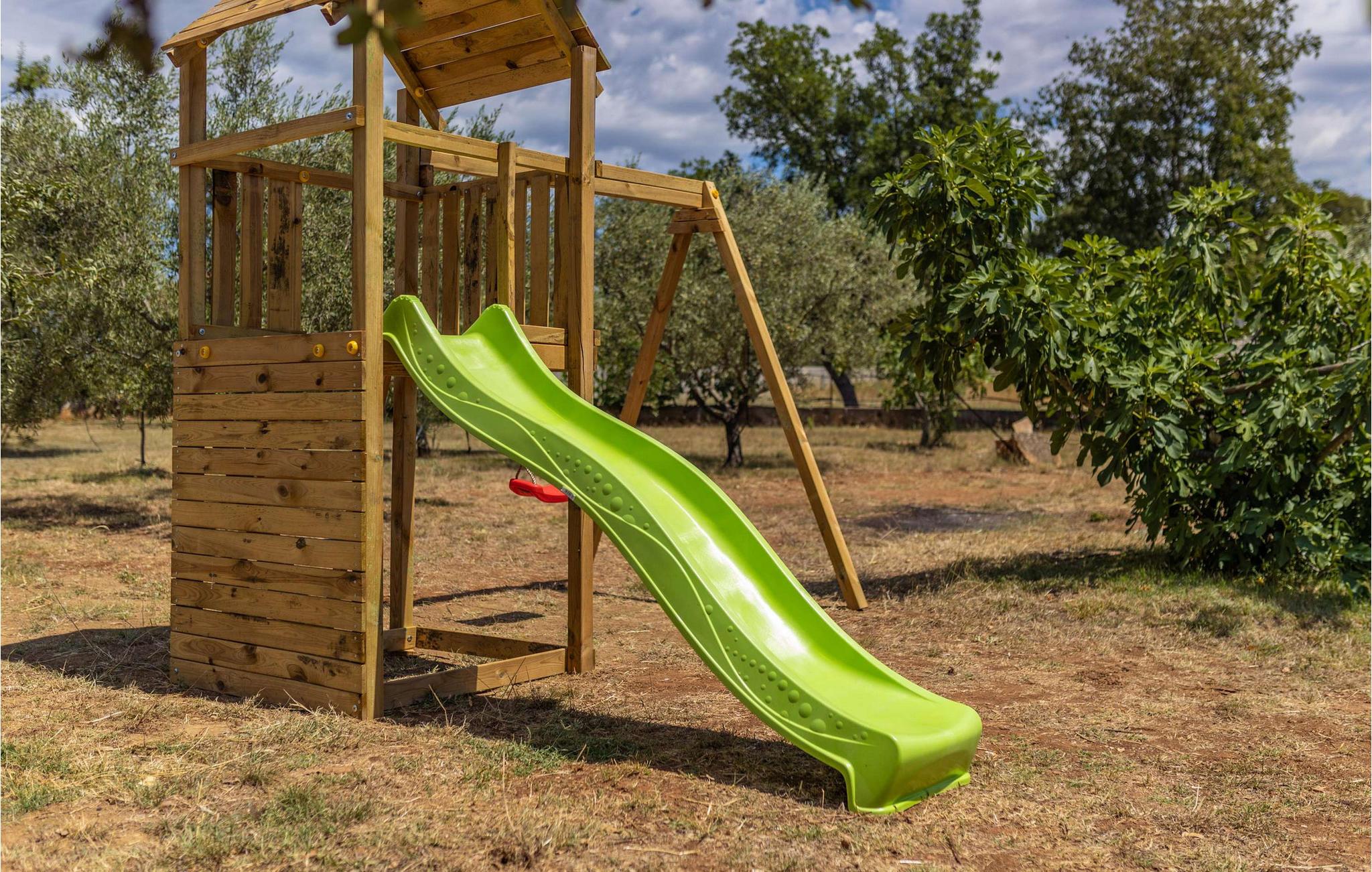 Nyd jeres første kaffe på balkonen og fordyb jer i en god bog. Snup en frisk dukkert i den storslåede pool og genoplad på liggestolene. Til stemningsfulde grillaftener med vin og stearinlysets skær står den rustikke taverna eller terrassen med sommerkøkken til jeres rådighed. Spil bordtennis og lad børnene have det sjovt på rutsjebanen og gyngerne.