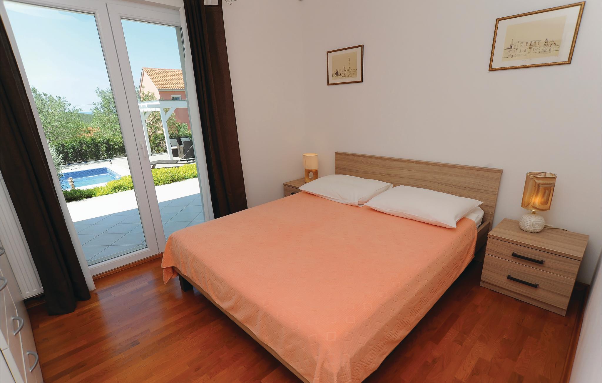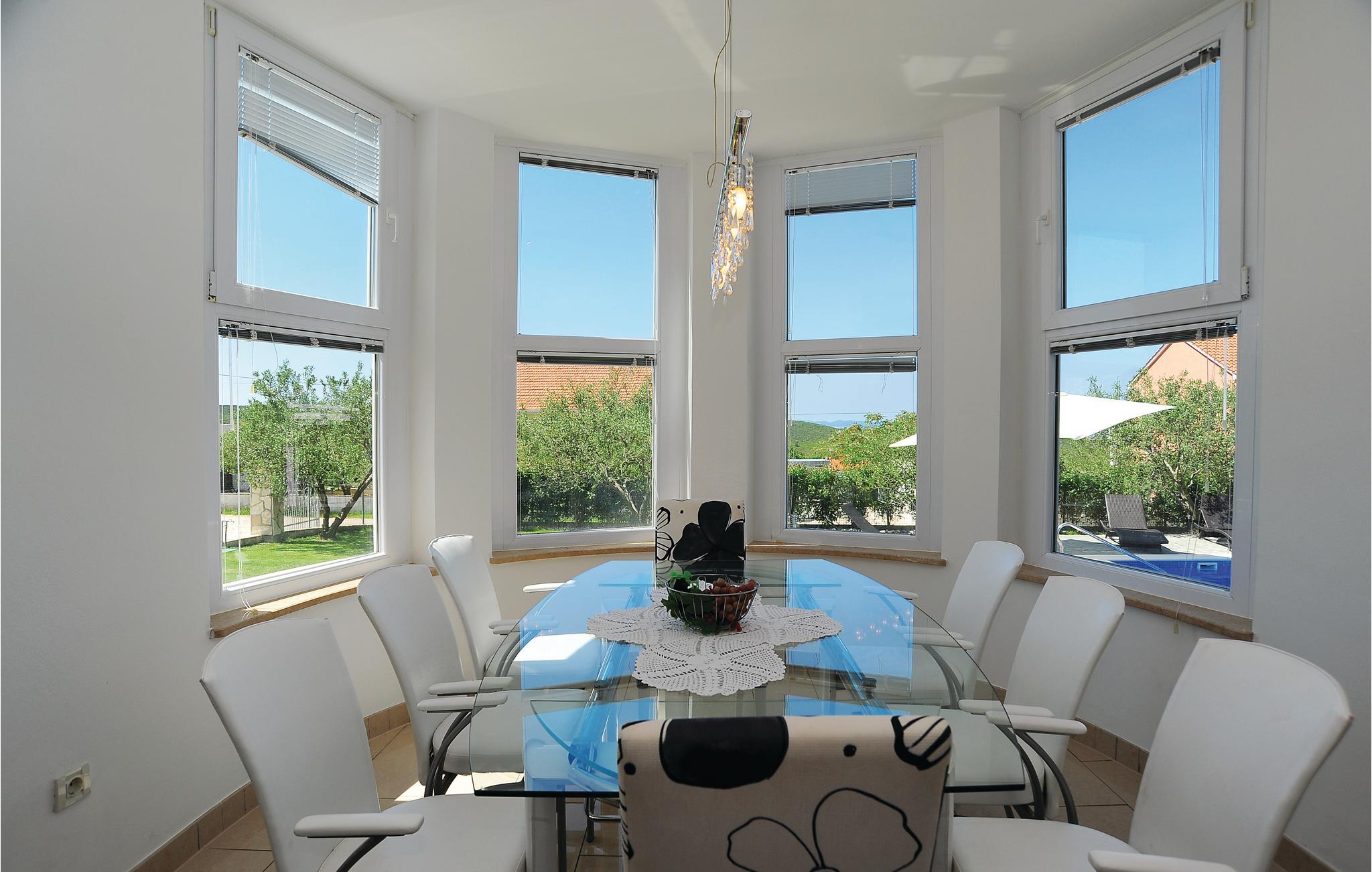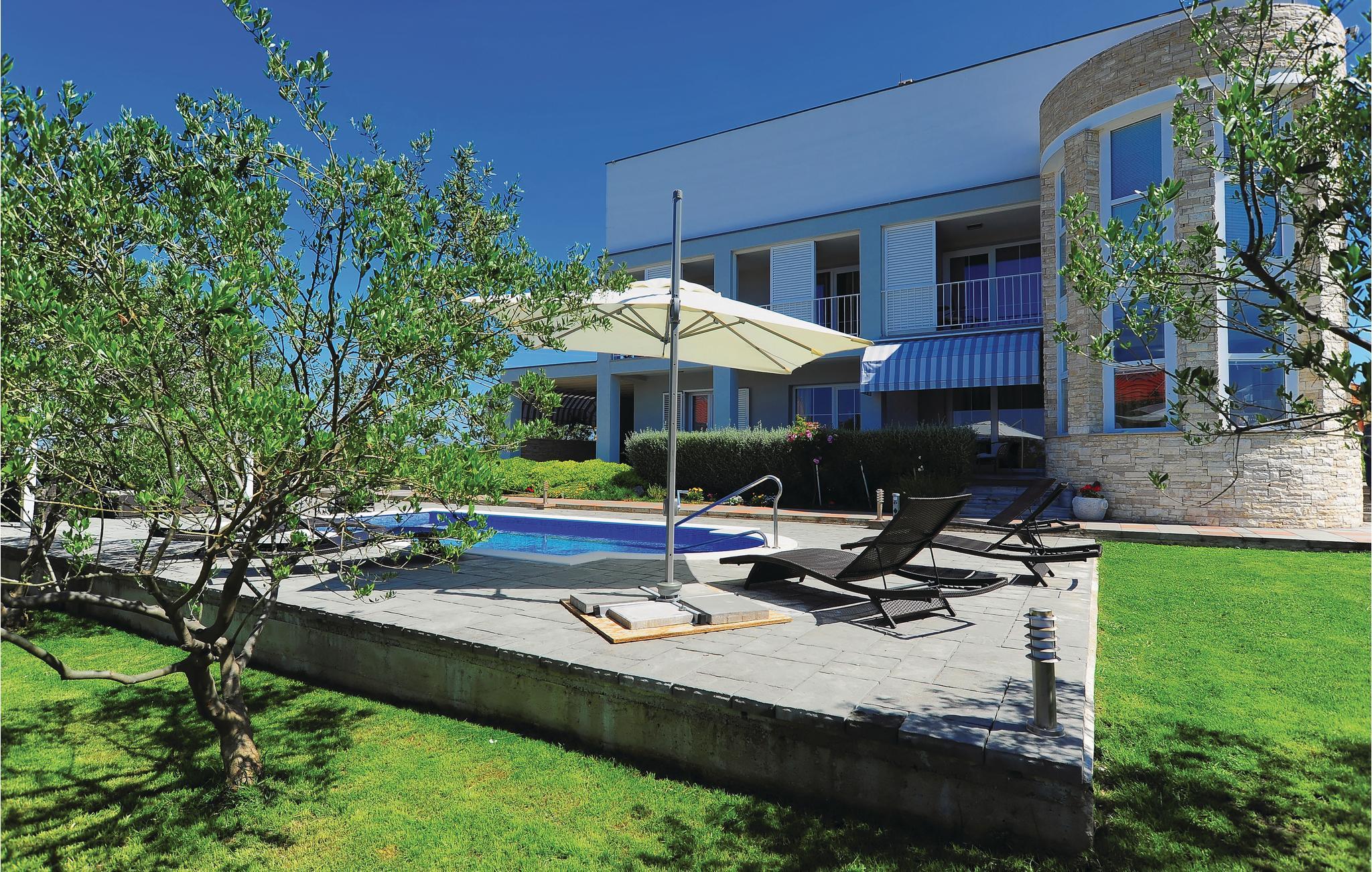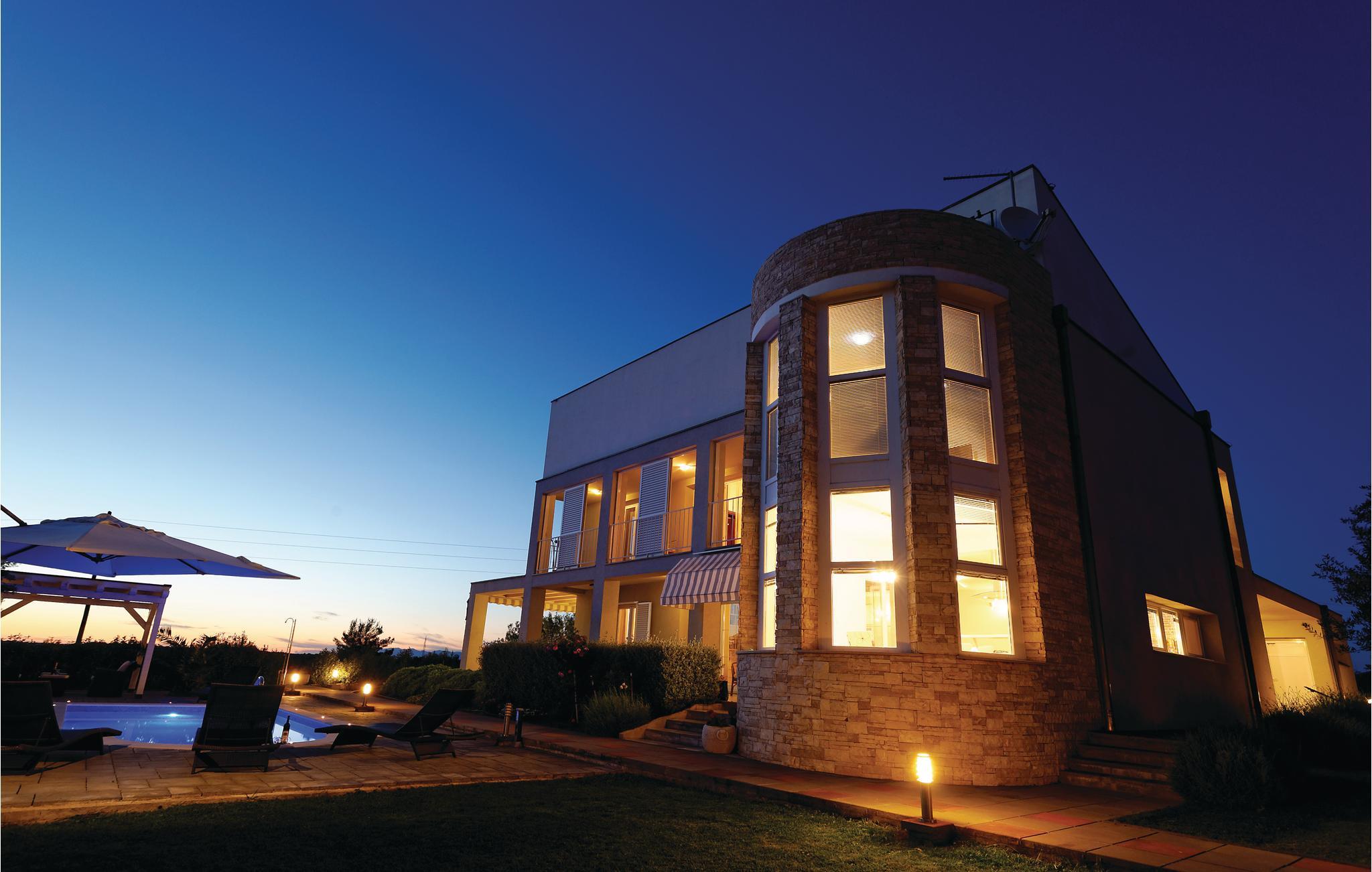 Dette komfortable og smagfuldt indrettede feriehus ligger i en lille rolig by tæt på Zadar. Feriehuset indeholder fem soveværelser, to badeværelser, et gæstetoilet, køkken, stue samt et aktivitetsrum. Boligen er meget velegnet til børnefamilier, da haven er indhegnet og der findes mange muligheder for gode lege. Hop en tur i poolen (udstyret med modstrømanlæg) og bliv dejlig nedkølet på en varm sommerdag. Bagefter kan I sidde i skyggen under pavillonen eller parasollen eller slappe af i en liggestol og nyde solen med noget køligt at drikke og en god bog.