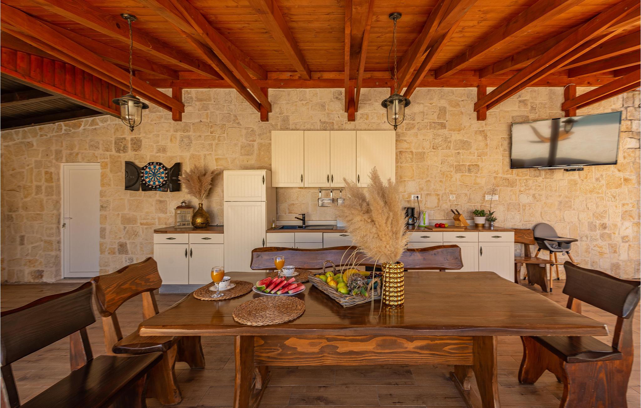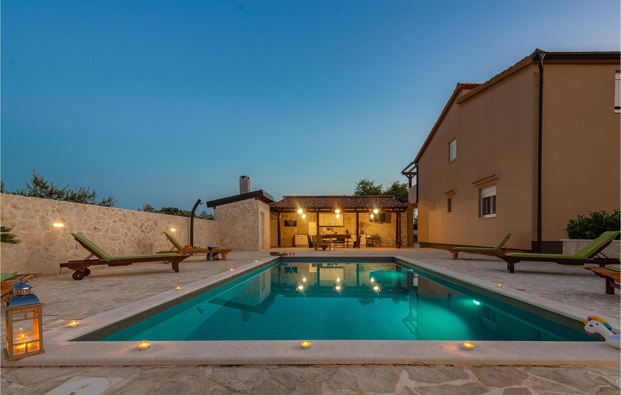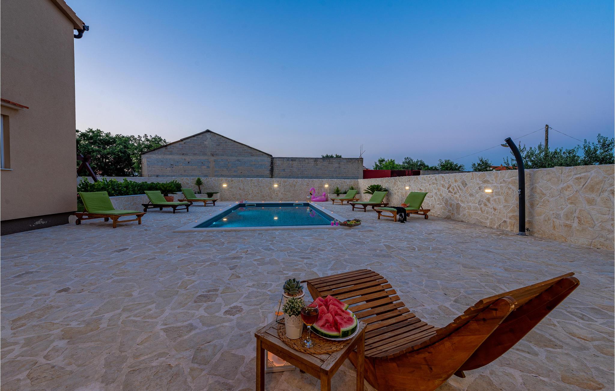 På en 2.700 m² stor, indhegnet grund ligger dette feriehus, som består af to boligeenheder. De er forbundet af en udendørs trappe. Ved siden af den opvarmede udendørs pool ligger der også et udendørskøkken, hvor I kan se frem til at tilberede jeres lækre måltider under åben himmel. Børnene kan se frem til at hygge sig med legeredskaberne på grunden. For de aktive feriegæster er der et badminton/volleyball net. megen morskab får I også ved bordtennisbordet, og med playstation4 og dart. Her er der ingen der keder sig. De eventyrlystne kan se frem til at besøge eventyrparken i Debeljak kun fem km fra huset. Zadar med det berømte havorgel og de spændende ruiner fra et romersk forum ligger kun 14 km fra huset.