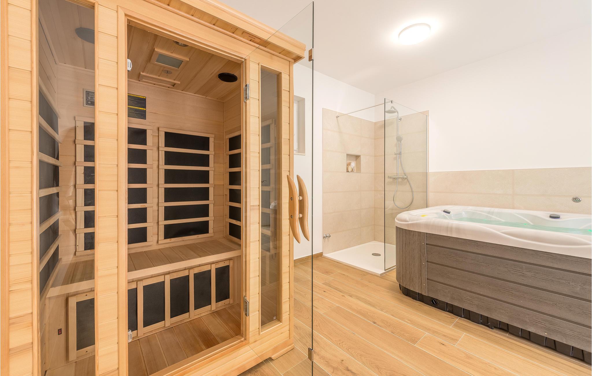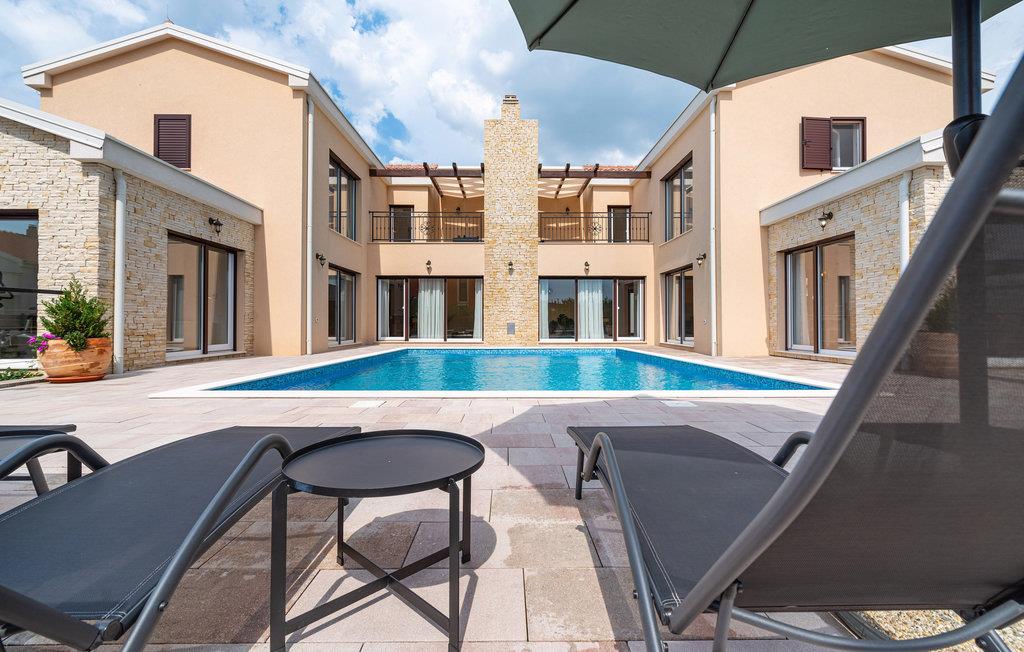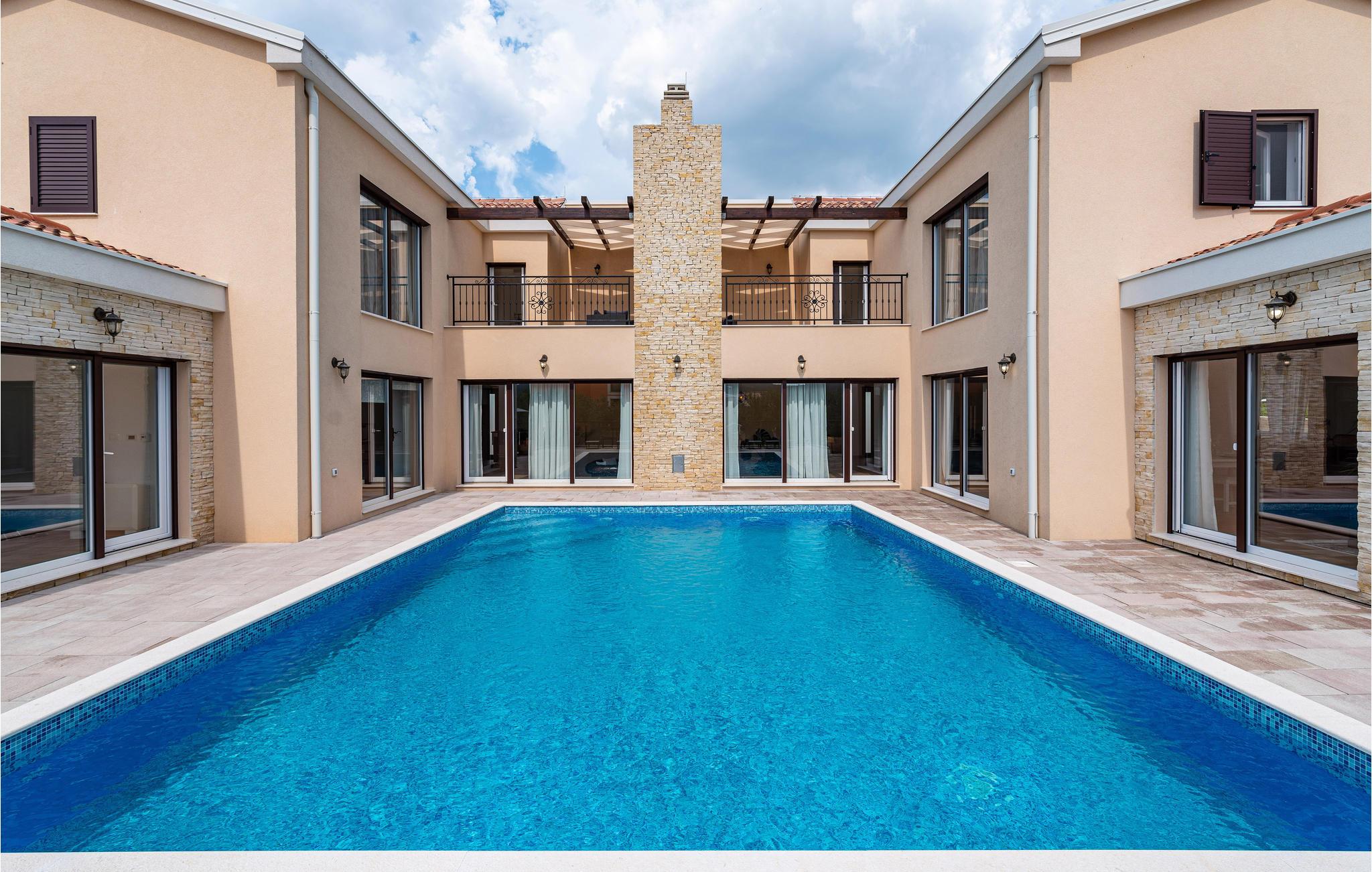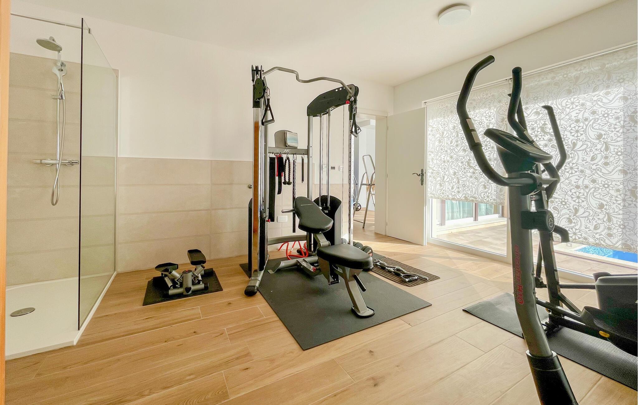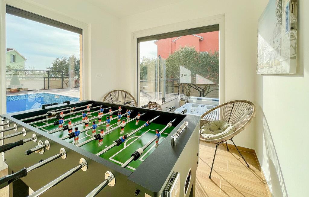 Fra terrassen kan du se den smukke have og poolen på 48 m². I de glaserede værelser er der boblebad , Sauna, fitness og billardrum.
