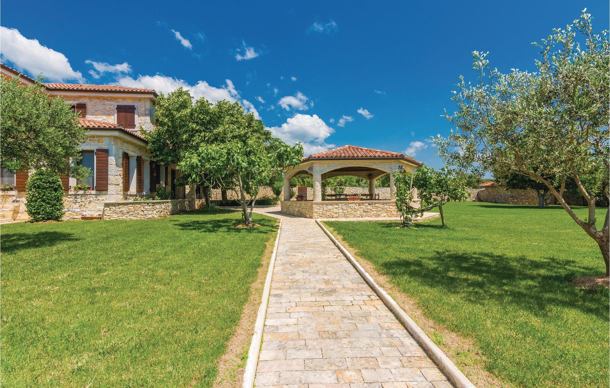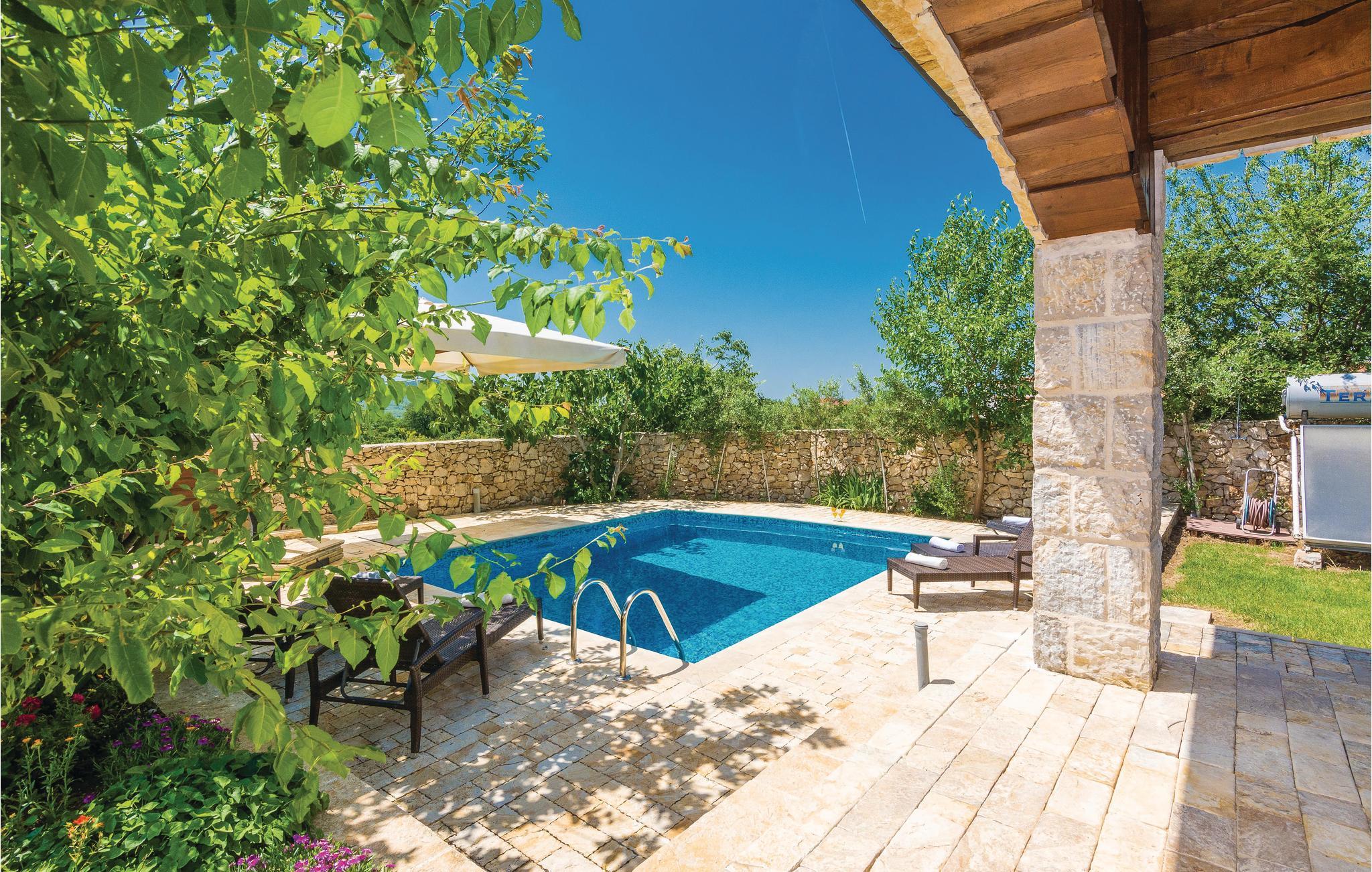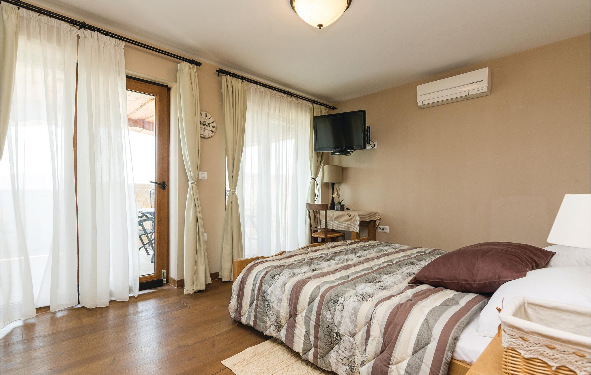 På en stor grund i Gorica, i nærheden af Zadar, ligger dette smukke og luksuriøse stenhus. I stueetagen er der en stor stue med spisestue, fuld udstyret køkken, et soveværelse og et badeværelse. For enden af gangen er der et vaskerum, hvor der er adgang til altanen. Fra stuen kan I gå ud til den overdækkede terrasse og swimmingpoolen. Her kan I slappe af og nyde en god bog, eller tage en forfriskende svømmetur i swimmingpoolen. Ovenpå er der yderligere 3 soveværelser med klimaanlæg og eget bad. I haven står en pavillon, hvor I kan tilbringe hyggelige og afslappende timer sammen. Familiens yngste kan trygt lege på plænerne der omgiver huset. De sidste 300 m af tilkørslen til huset, er ikke asfalteret.