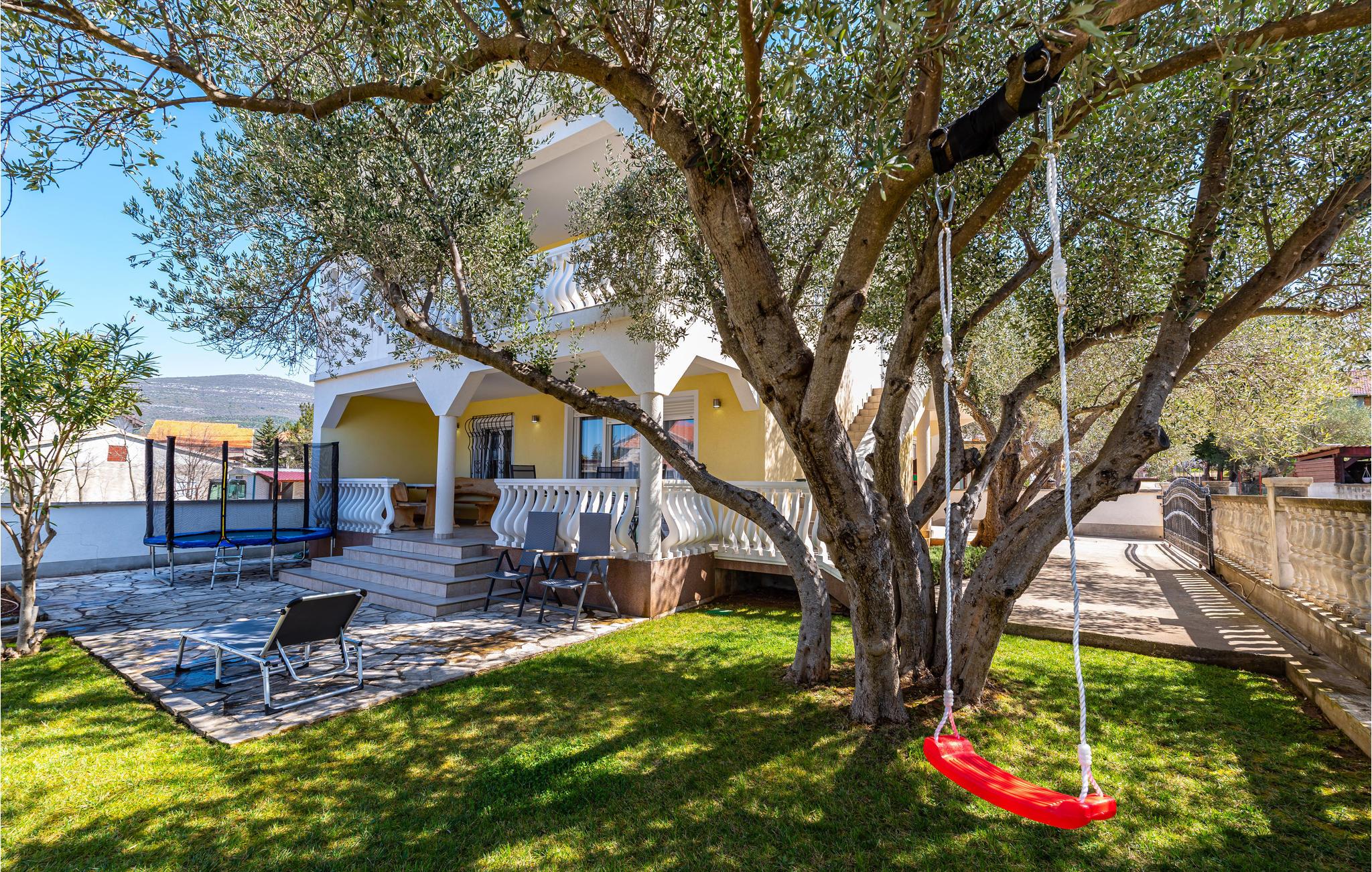 Udenfor finder I en overdækket terrasse, hvor morgenmaden kan nydes, samt liggestole til solbadning i det grønne område. Tilbered lækre feriemåltider på grillen herude, mens børnene leger i legetårnet, gynger eller hopper på trampolin.