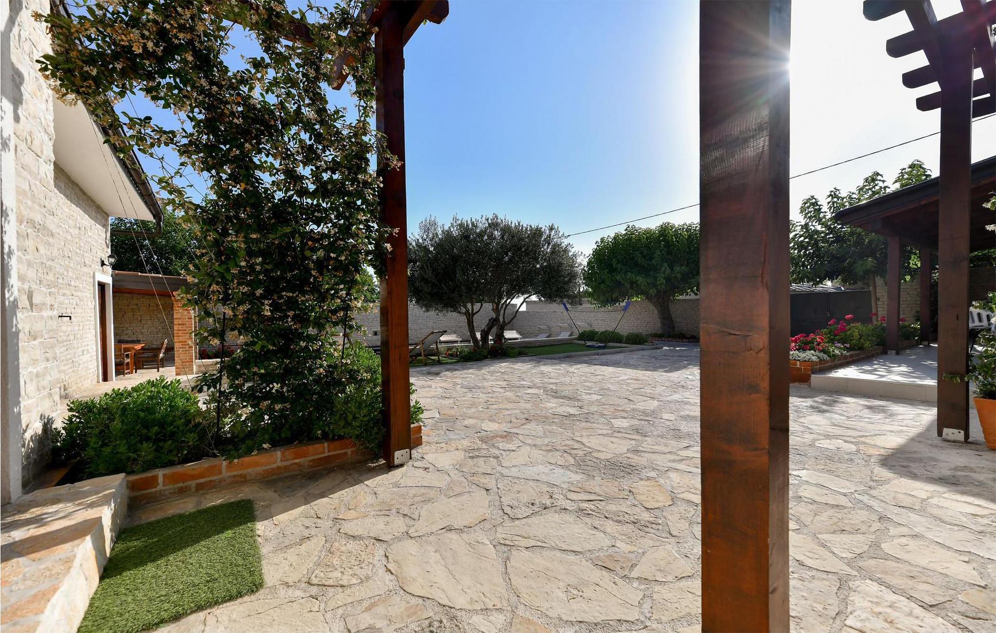 I olivenlunden ved siden af ??huset er der en bowlingbane, fodboldmålstolper, badmintonnet, gynge, vippe, rutsjebane og sandkasse.