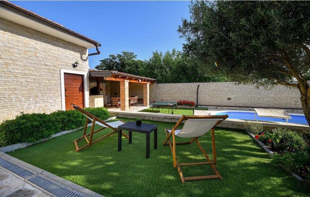 Gør jer komfortable i det attraktive udendørs område af sommerhuset ved poolen. Der er også et sommerkøkken med grill, et lille køkken og et bord til socialt samvær, og I kan spille bordtennis udendørs.