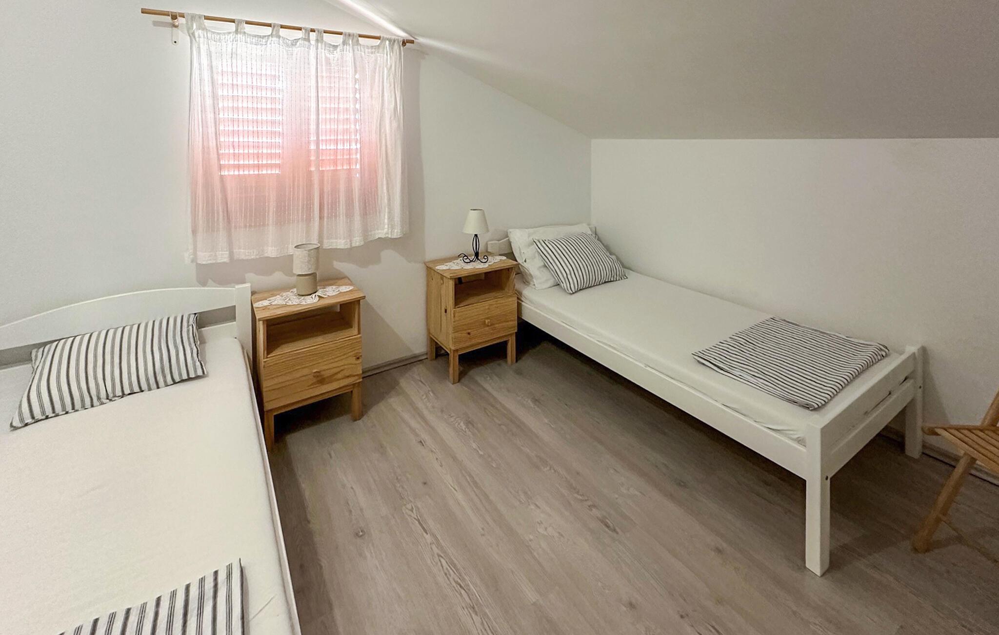 Denne moderne indrettede halvdel af et dobbelthus ligger i Maslenica. Huset strækker sig over stueplan og på første sal, hvor laveste loftshøjde er 140 cm. I stueplan ligger stuen med køkken, samt sove- og badeværelse. På første sal er der yderligere tre soveværelser, et badeværelse og en overdækket balkon med havudsigt. Tag på udflugt i denne skønne region med bl.a. nationalparken Paklenica og naturparken Velebit. Der er 300 m grusvej op til huset. . Tag også på udflugt til Zadar, med en skøn havnepromenade hvor I kan se ’Havorgelet’ og ’Solhilsen’.