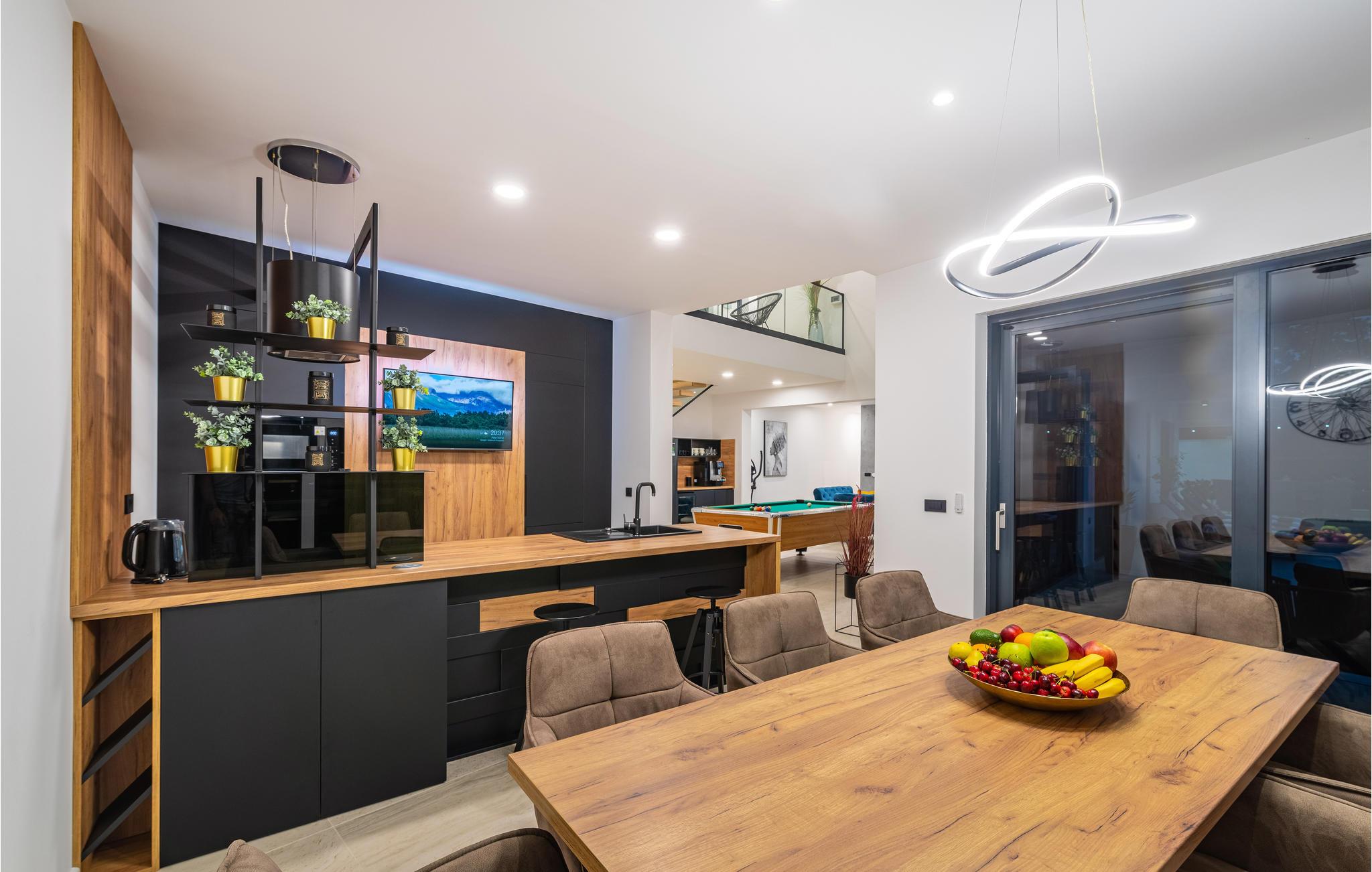 Villa Hill har en åben, lys atmosfære, hvor moderne arkitektur og store vinduer tilbyder en betagende udsigt over landskabet og havet. De stilfulde møbler med bløde lænestole, rene linjer og bløde farveaccenter skaber en elegant, men afslappende atmosfære. Nyd filmaftener, afslappede samtaler eller blot roen i disse eksklusive omgivelser i den rummelige opholdsstue. Tilbring hyggelige timer ved poolbordet og skål for vinderen med et glas vin.