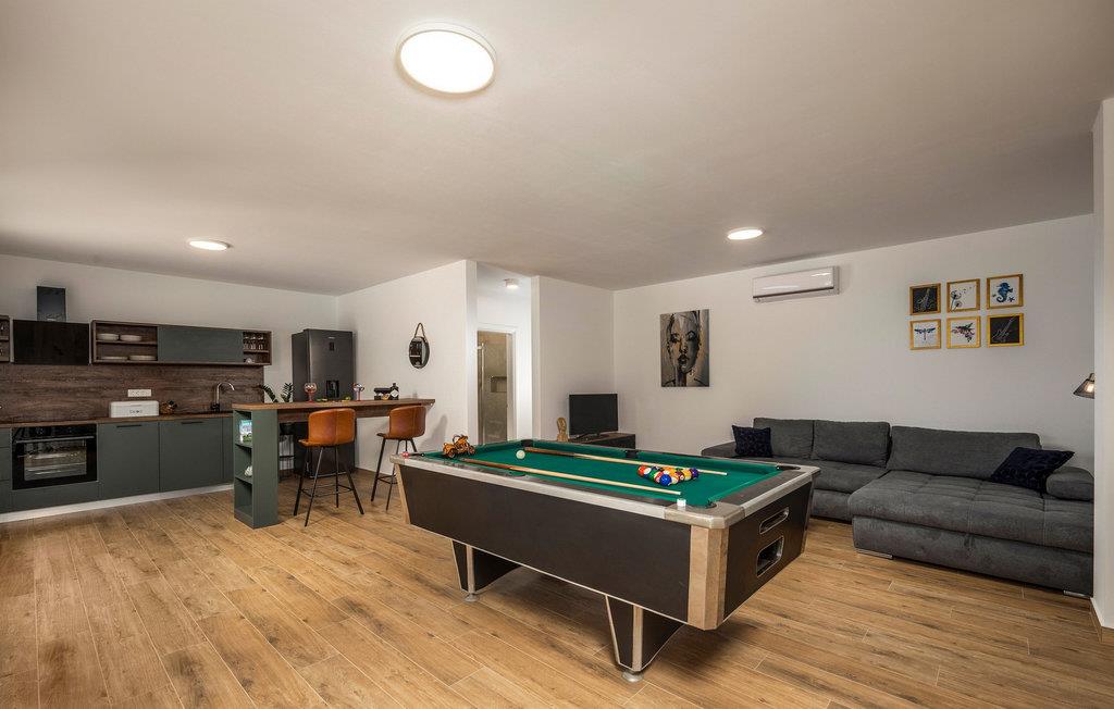 Villa Deep Green har en varm, moderne atmosfære, hvor naturlige materialer og stilfulde detaljer skaber et harmonisk opholdsmiljø. Nyd hyggelige timer omkring poolbordet eller slap af i den hyggelige opholdsstue til film- og spilleaftener. Del måltider ved det rummelige spisebord, og brug det åbne køkken til at afprøve nye opskrifter sammen. Find fred og ro i de forskellige siddeområder, hvor I kan læse en god bog eller lytte til en interessant podcast.