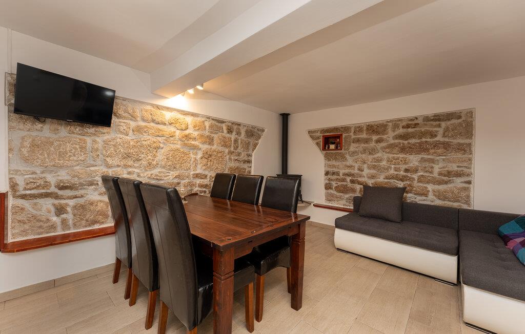 Velkommen til dette smagfuldt renoverede feriehus, hvor rustikke naturstensvægge kombineres med moderne møbler for at skabe en hyggelig atmosfære. I det åbne køkken kan I trylle lækre retter frem, som I kan nyde ved spisebordet, mens I planlægger jeres aktiviteter eller snakker om jeres oplevelser over et glas vin. Dediker tid til familien til en sjov spilleaften eller stream en film, som alle nyder.