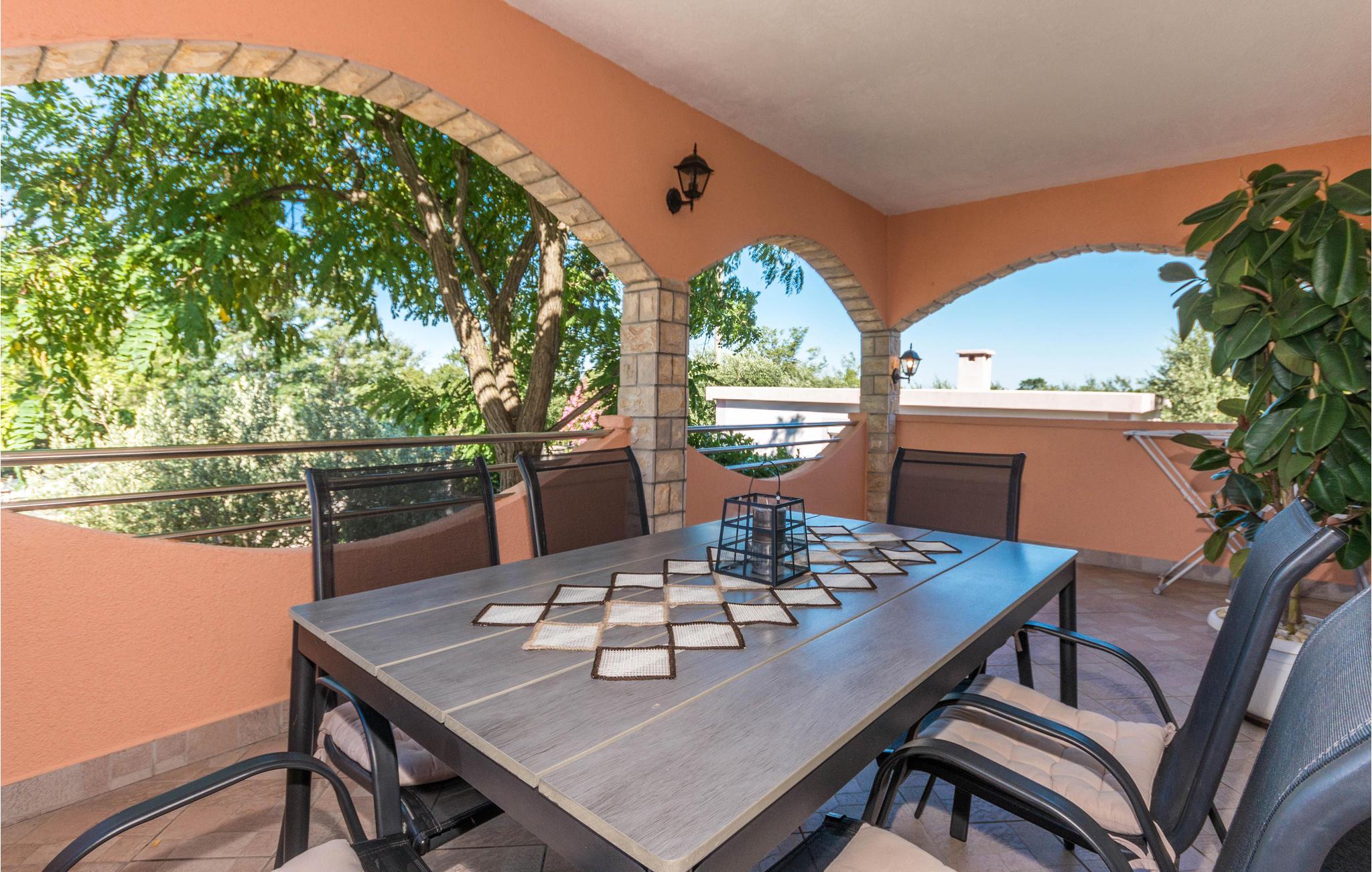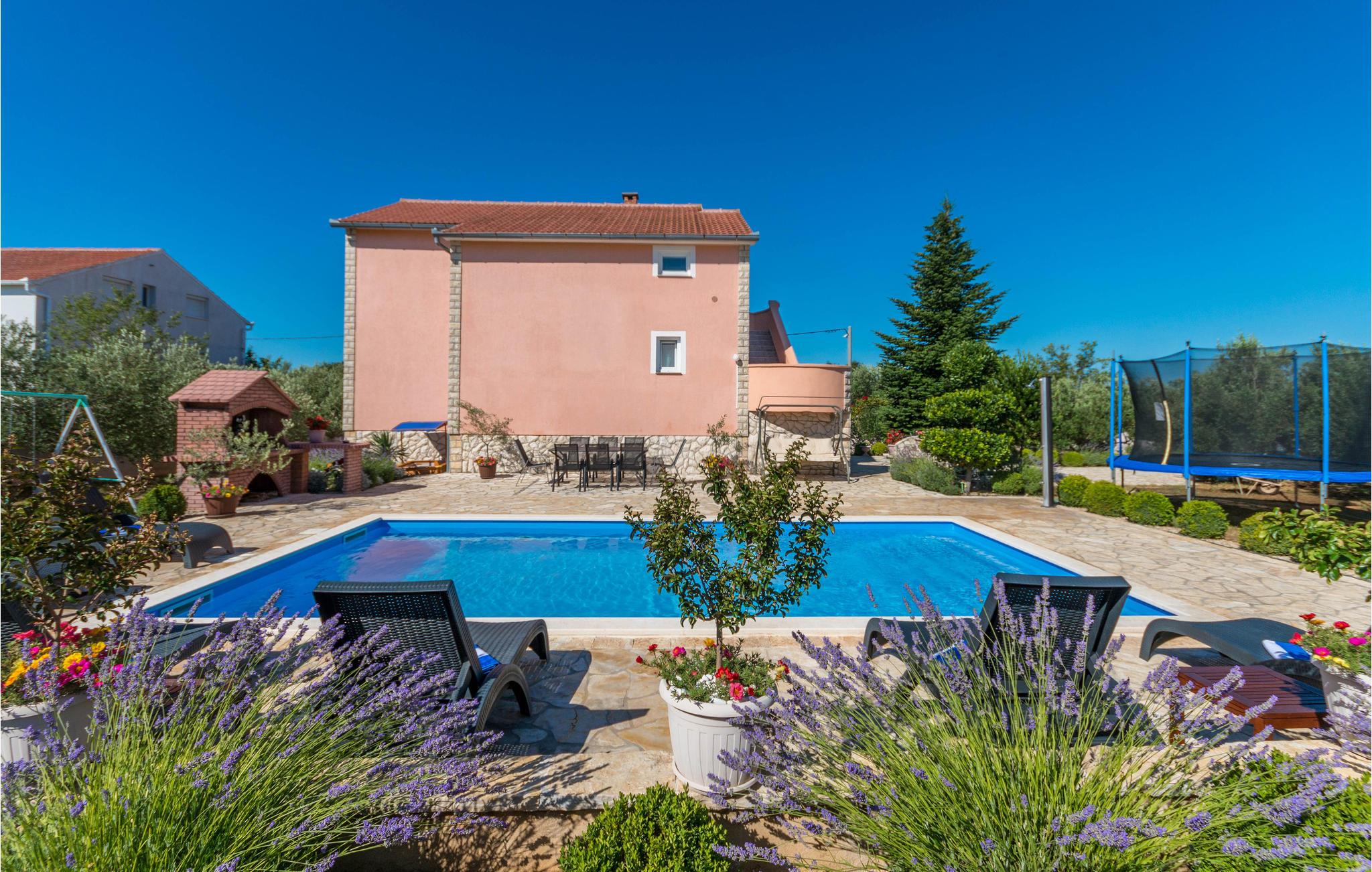Dette rummelige feriehus med pool ligger i byen Miranje på en stor privat grund. Huset rummer to separate ferielejligheder, der er tilgængelige via en udendørs trappe. På den fælles grund er der en pool, havemøbler, samt flere former for legeredskaber. Ejer bor også på grunden, i et lille helårshus. Nærmeste by er Biograd, med hele to marinaer, som er meget populære blandt bådfolket. Nautrligvis kan I også besøge Zadar med sin gamle bydel og utallige moderne bygninger og former for kunst og naturparken Vranasøen, er der udnævnt til fuglebeskyttelsesområde.