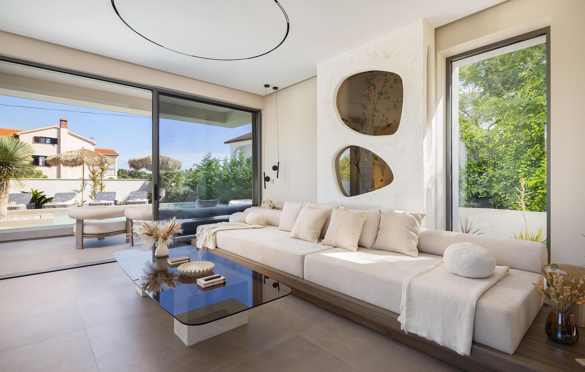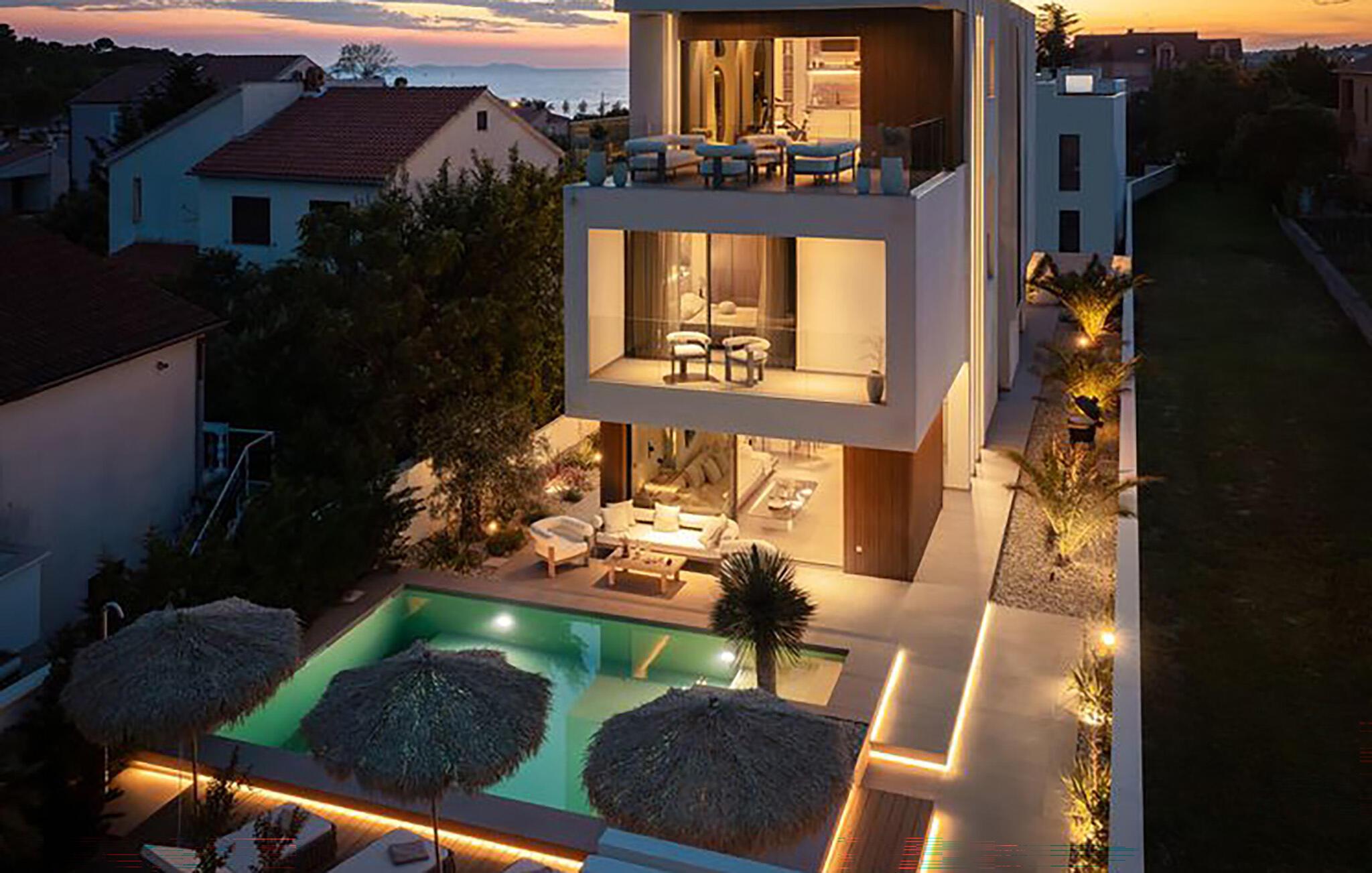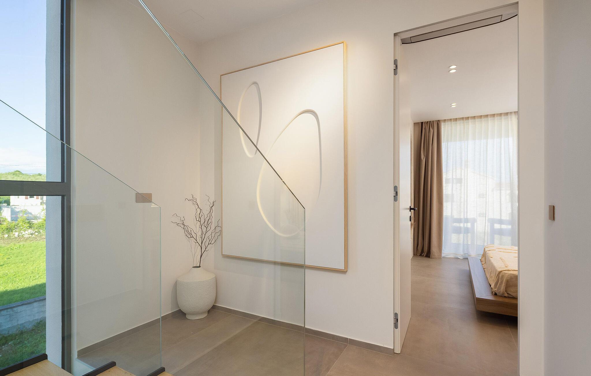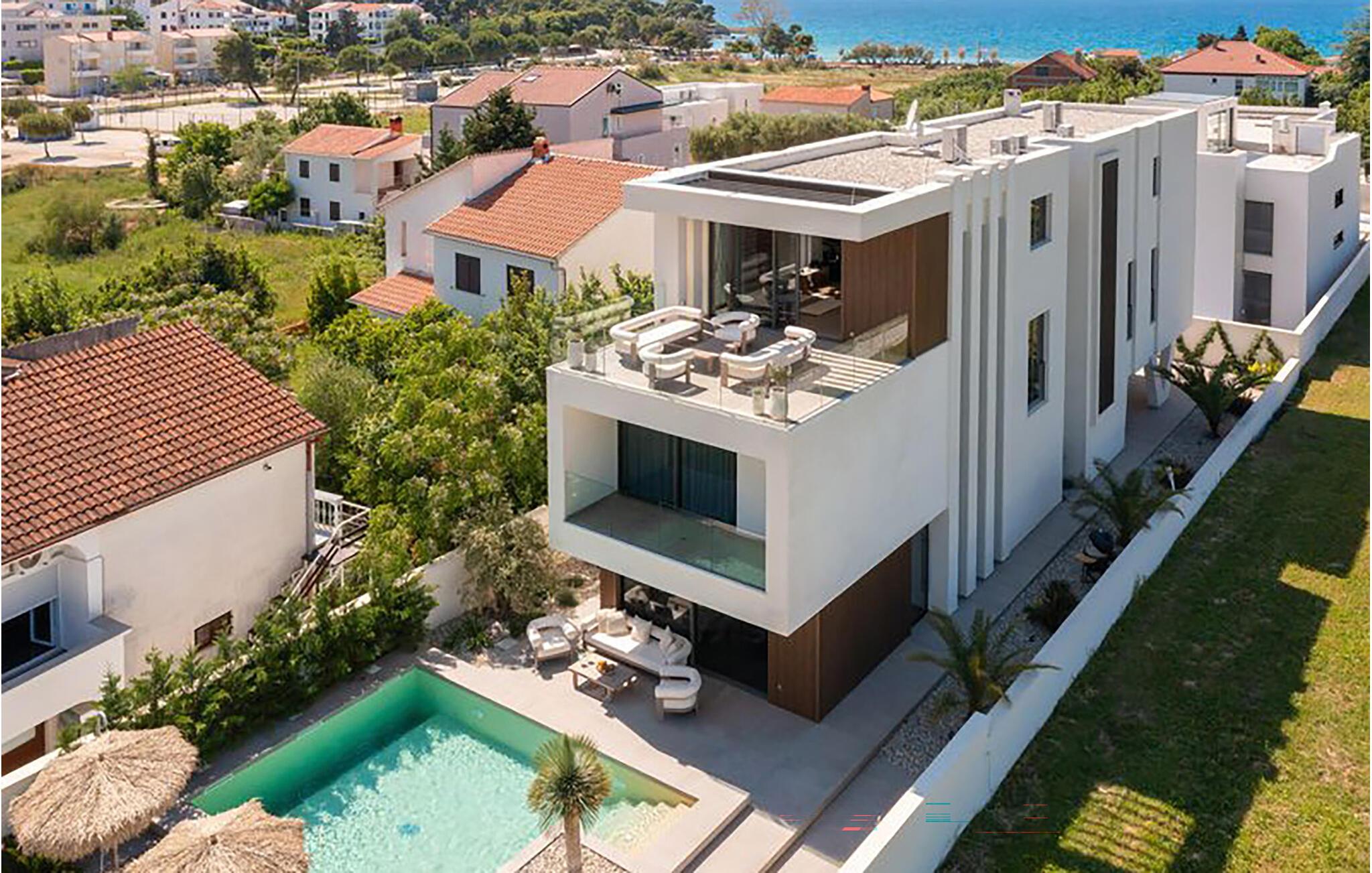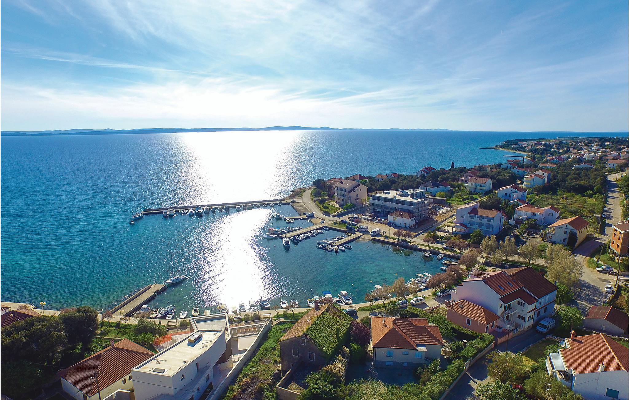 Tilbring jeres velfortjente ferie i dette stilfulde feriehus med privat pool. Rene linjer og tidløs elegance mødes i dette hus. Hyg jer sammen i de behagelige sofaer, nyd et glas vin, eller slap af med jeres yndlings-tv-program. At lave mad sammen i det moderne designerkøkken er dobbelt så sjovt, perfekt til hyggelige aftener med familie eller venner. For motion og velvære er der et fitnessrum og en sauna til rådighed. Start dagen med en kop kaffe på den solrige terrasse og nyd omgivelsernes ro. En dukkert i den forfriskende pool vil genoplade jeres batterier. Bagefter inviterer de komfortable liggestole jer til at læse, døse eller drømme. Afslut dagen med at slappe af med en grill og lav planer for de kommende feriedage. Den nærliggende strand er ideel til svømning, solbadning og afslapning. Oplev den fantastiske kystlinje på en kajak- eller bådtur og find skjulte bugter. Besøg den nærliggende gamle bydel i Zadar med højdepunkter som Havorglet og lysshowet "Hilsen til solen". Naturelskere vil få valuta for pengene med udflugter til nationalparkerne Plitvice, Kornati eller Paklenica.