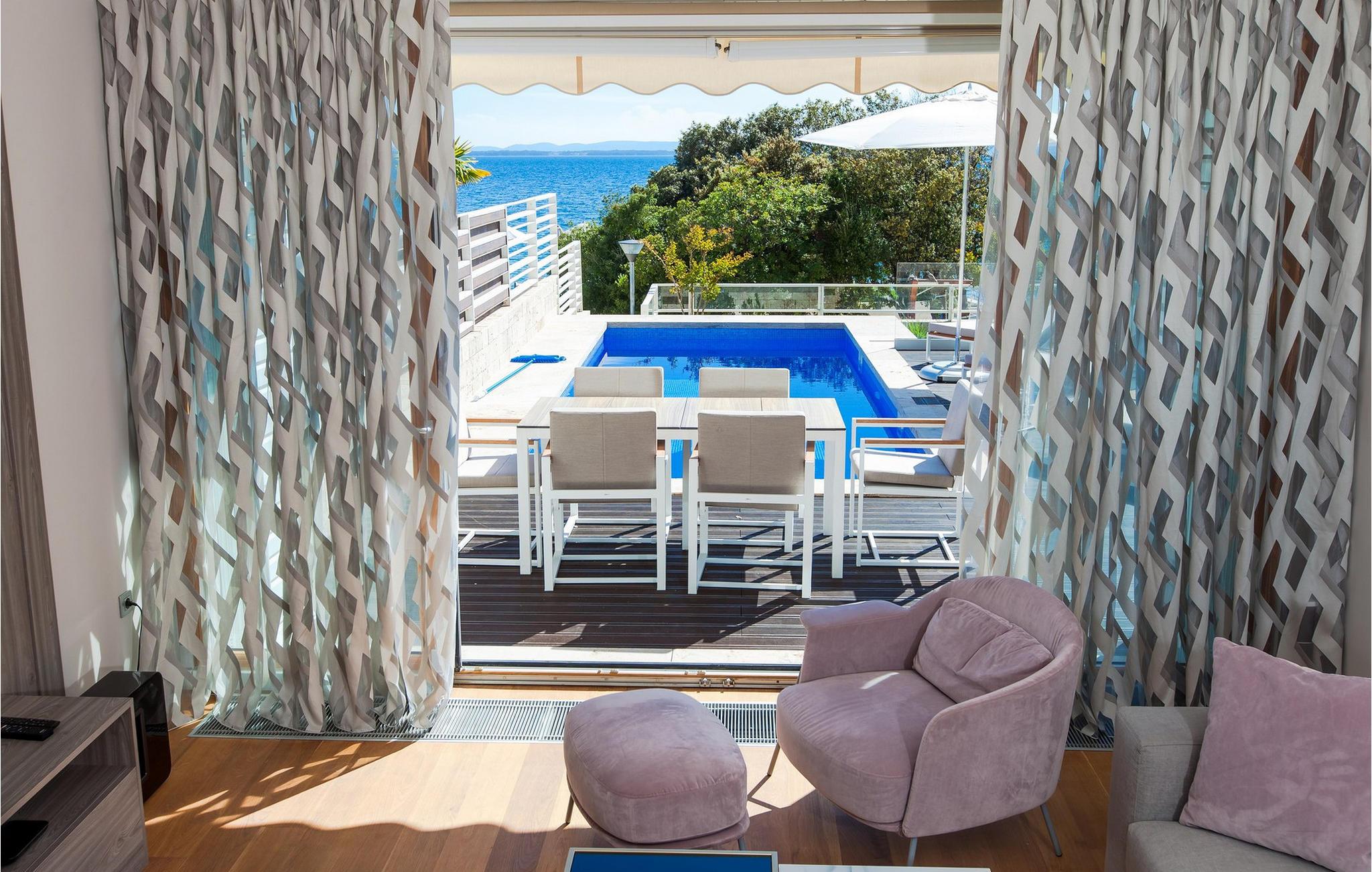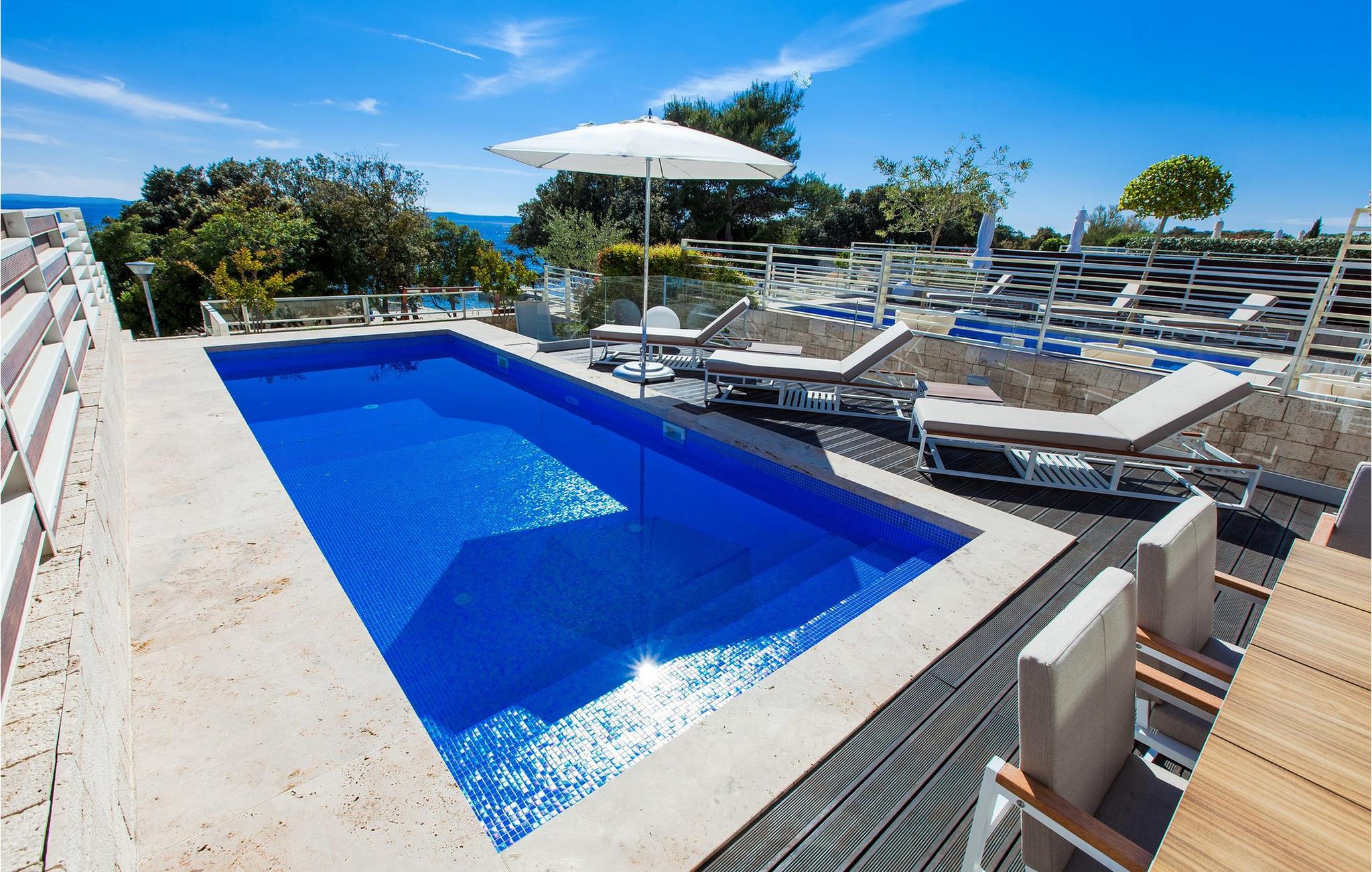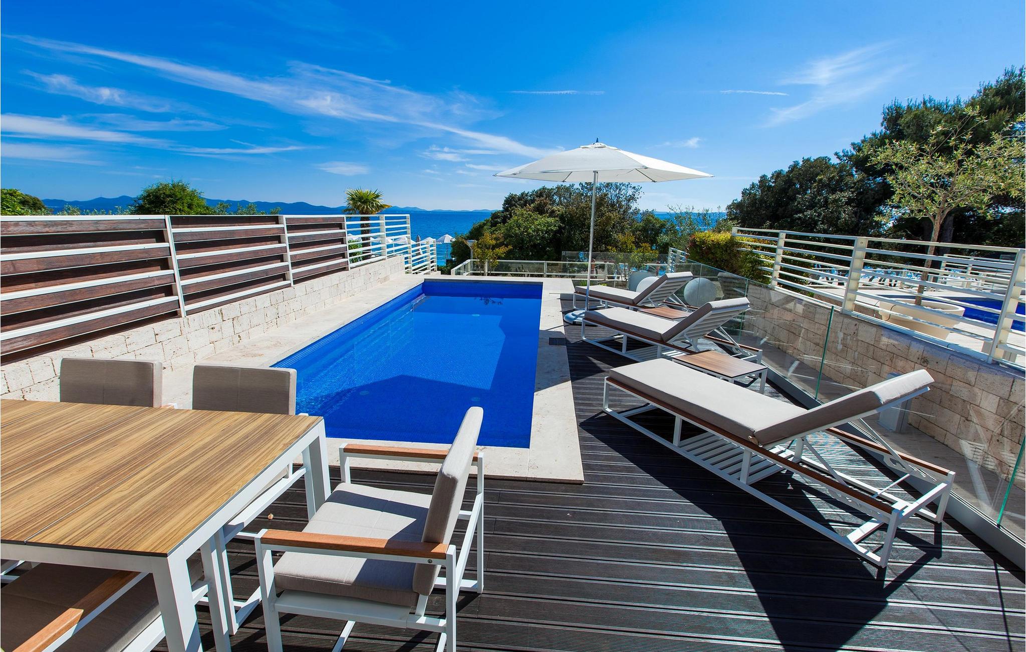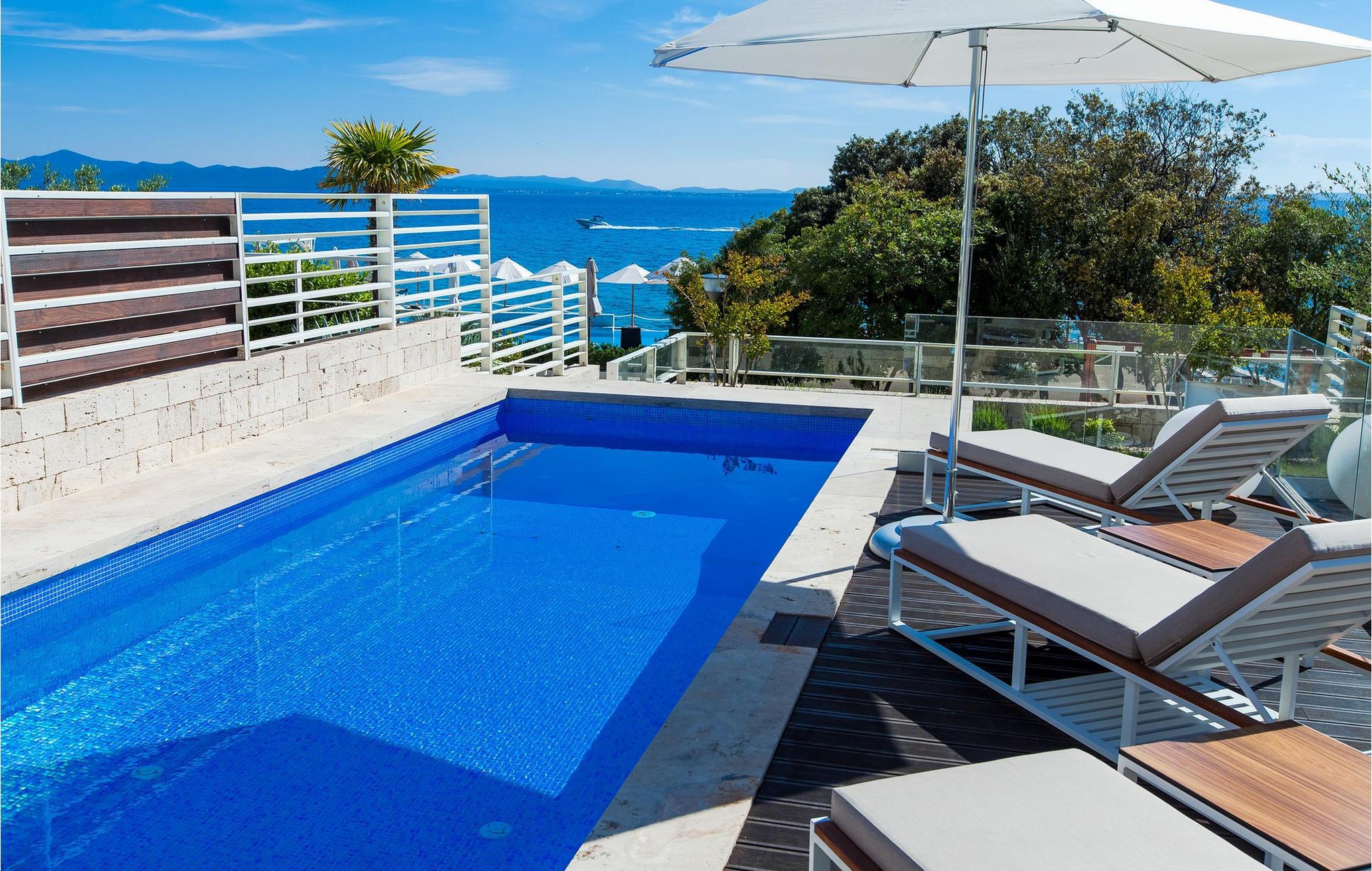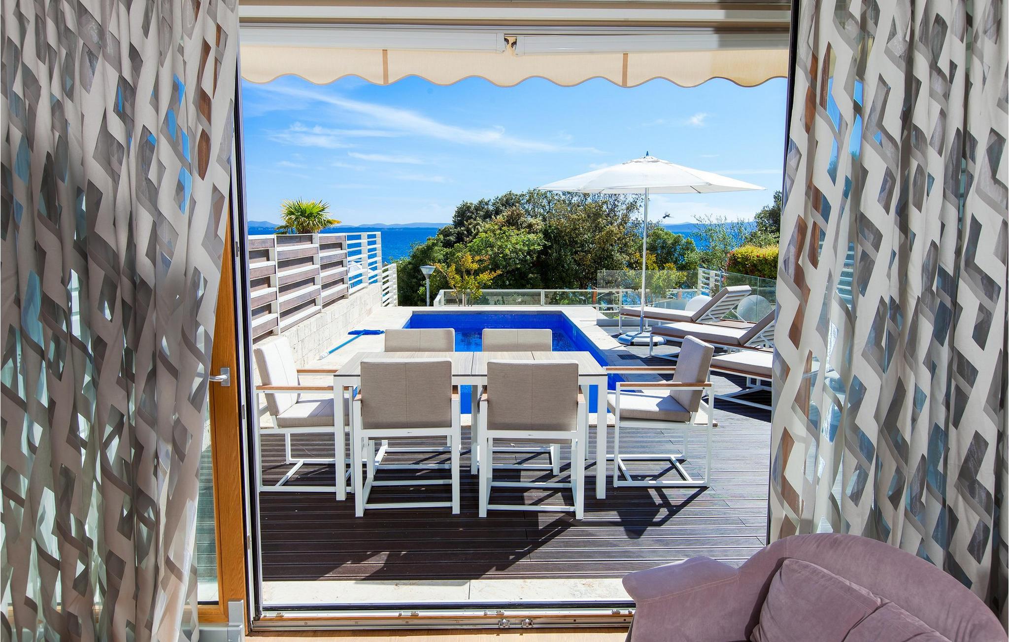 Oplev en ferieidyl lige ved havet i denne smukke villa. Kun få skridt fra havet ligger den elegante Villa Lantana i den charmerende ferieby Petrcane. Den lyse stue og det moderne køkken i stueetagen lægger op til at tilbringe hyggelige timer med havudsigt. I finder fred og ro i de komfortable soveværelser på begge etager, hver med eget badeværelse. I den indhegnede have kan I starte dagen med en forfriskende dukkert i den opvarmede pool og derefter nyde grillmad udendørs - den perfekte ramme for afslappende sommerdage. Das på liggestolene og kig ud over havet. Petrcane betager med sin nærhed til den historiske kongeby Nin og det livlige Zadar. Begge byer lokker jer med kulturelle højdepunkter og et varieret underholdningsprogram. De, der søger fred og ro, kan nyde strandture og traditionelle fiskefestivaler, mens eventyrere kan vælge mellem talrige sports- og fritidsaktiviteter. Oplev den fortryllende Zadar-region og oplev uforglemmelige dage på Villa Lantana. Bemærk venligst: Ejendommen accepterer ikke ungdomsgrupper under 30 år eller polterabender. Bookinger fra sådanne grupper vil blive afvist, selv ved ankomst eller under opholdet, uden refusion.