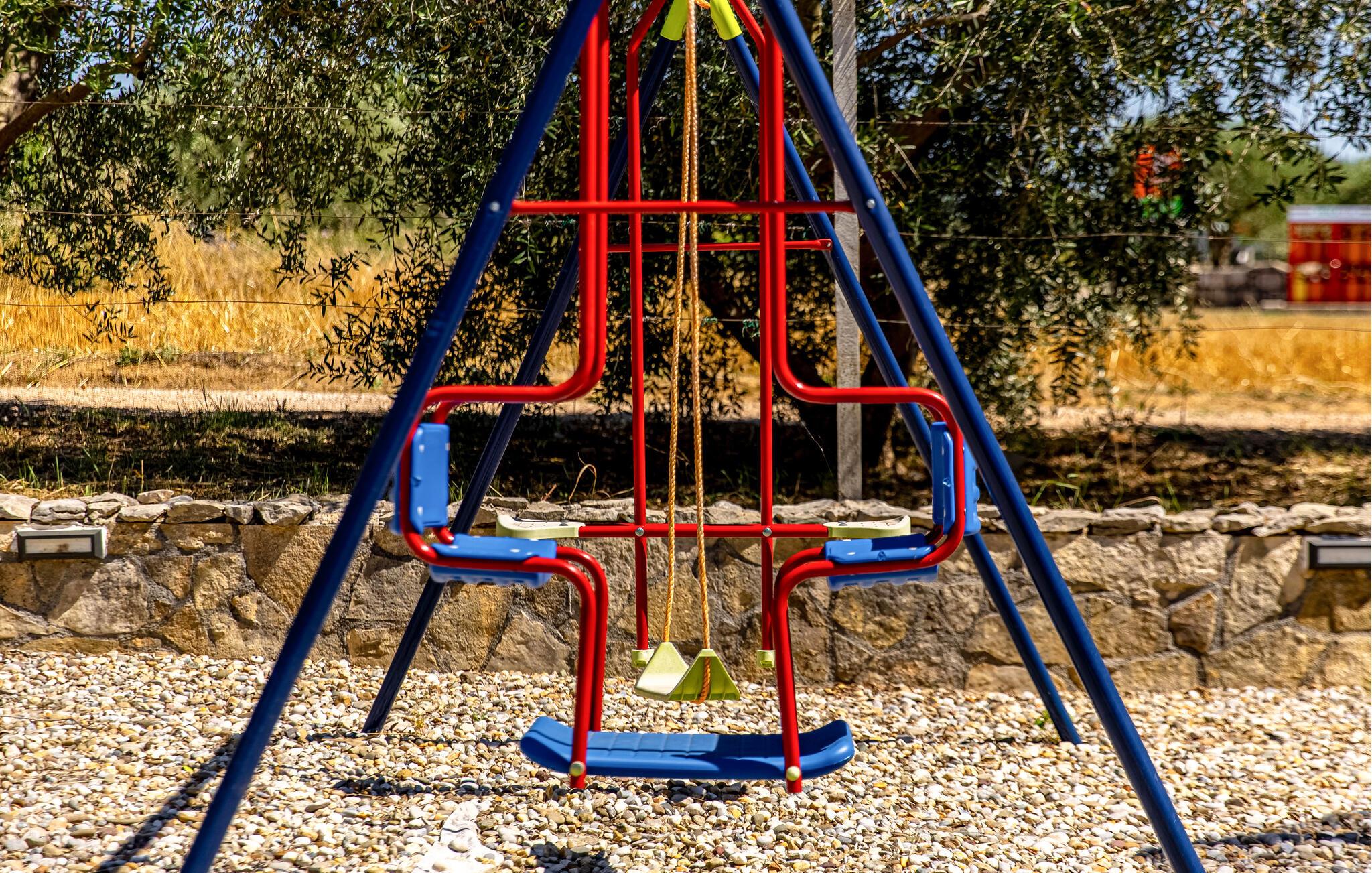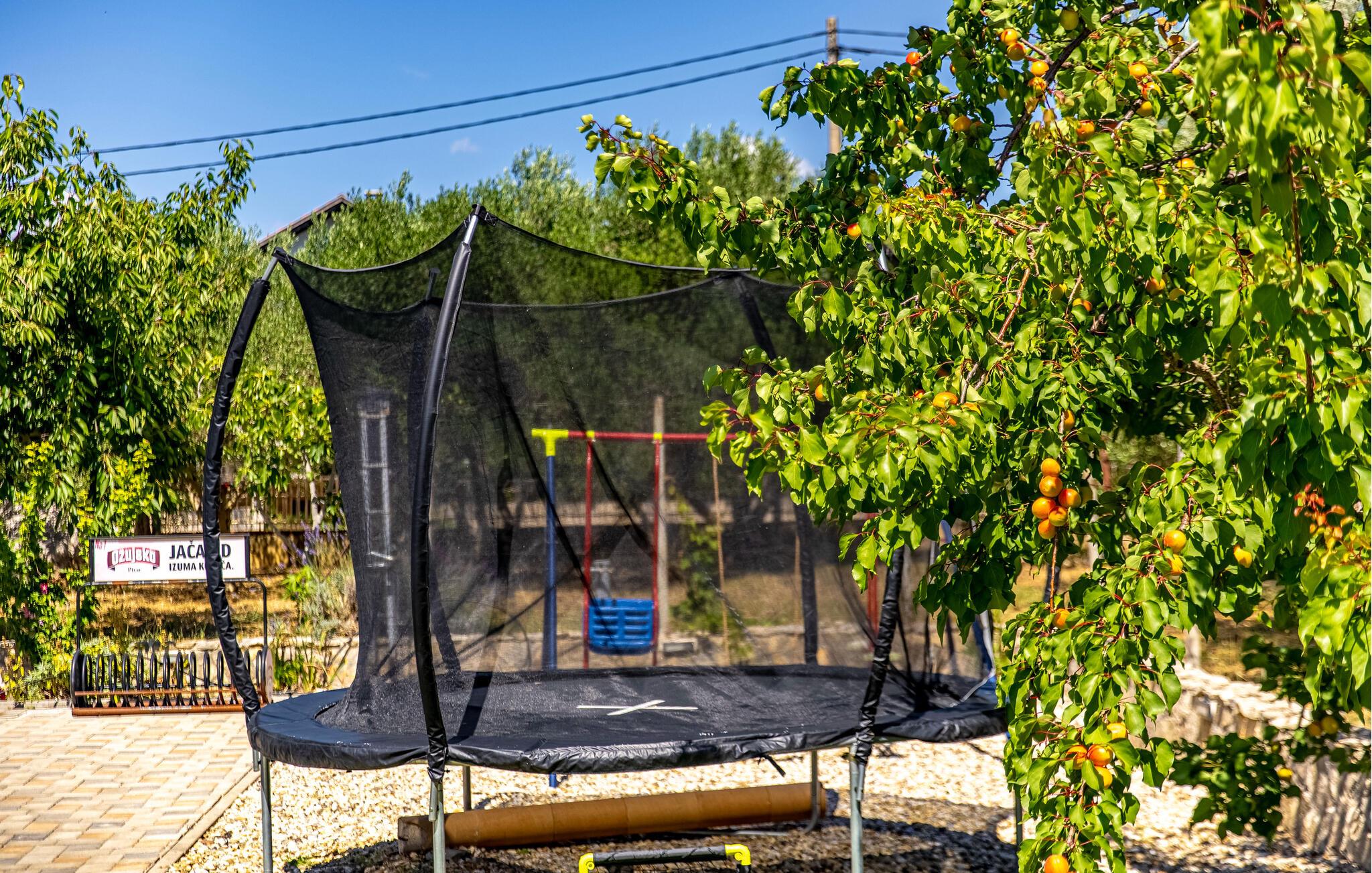 Mellem de to huse ligger swimmingpoolen, på den store grund findes endnu en bygning, hvor grillen samt et stort bord med tilhørende stole findes. Børnene kan hygge sig med gynger, legehus, rutsjebane samt sandkasse. Af flere udendørs aktiviteter kan nævnes trampolin, volleyballnet, badminton og bordtennis.
