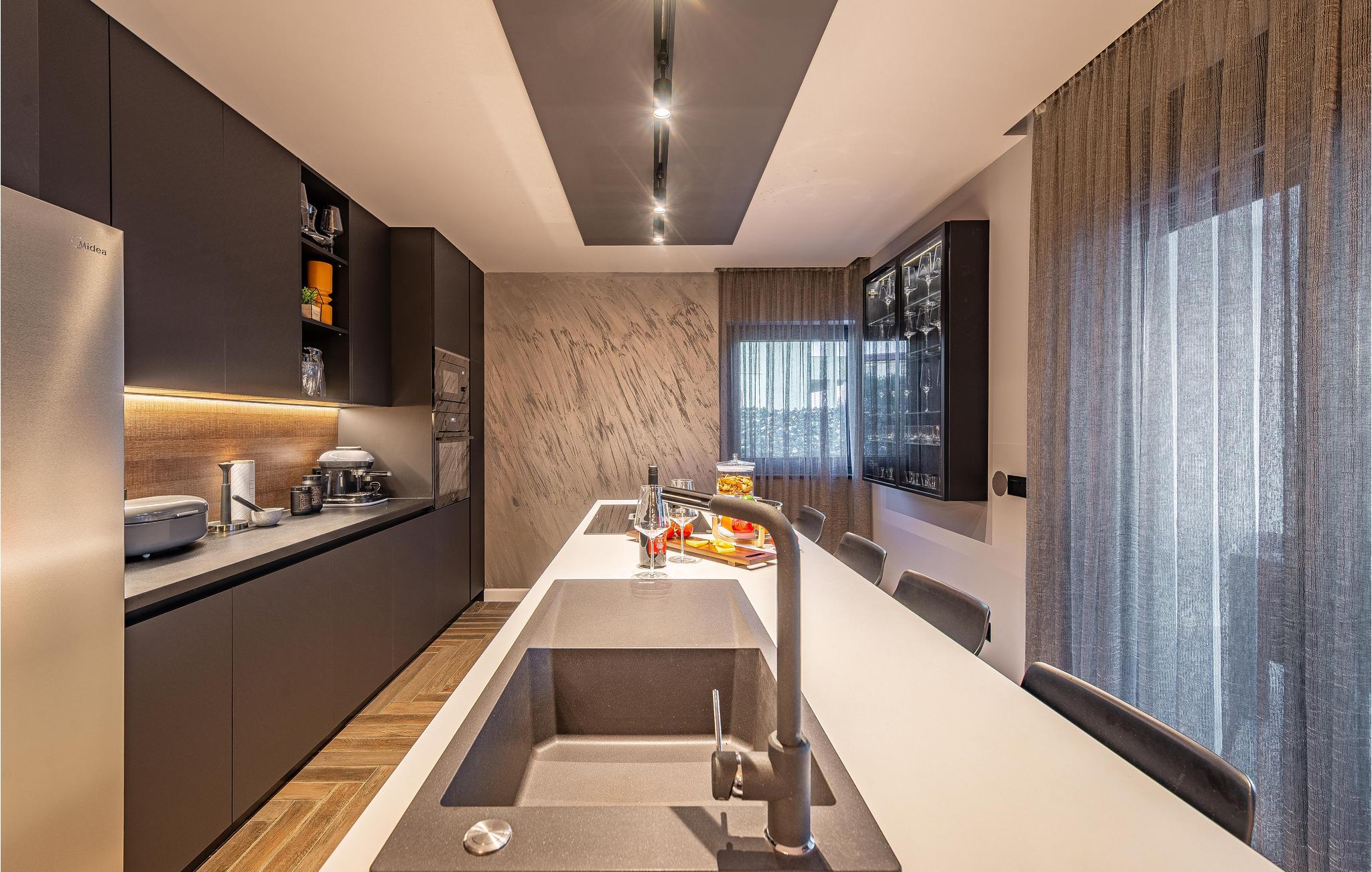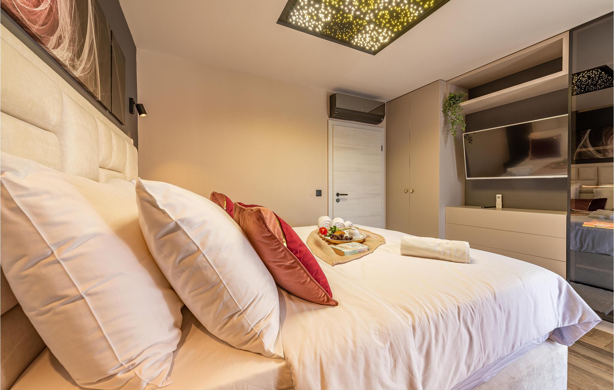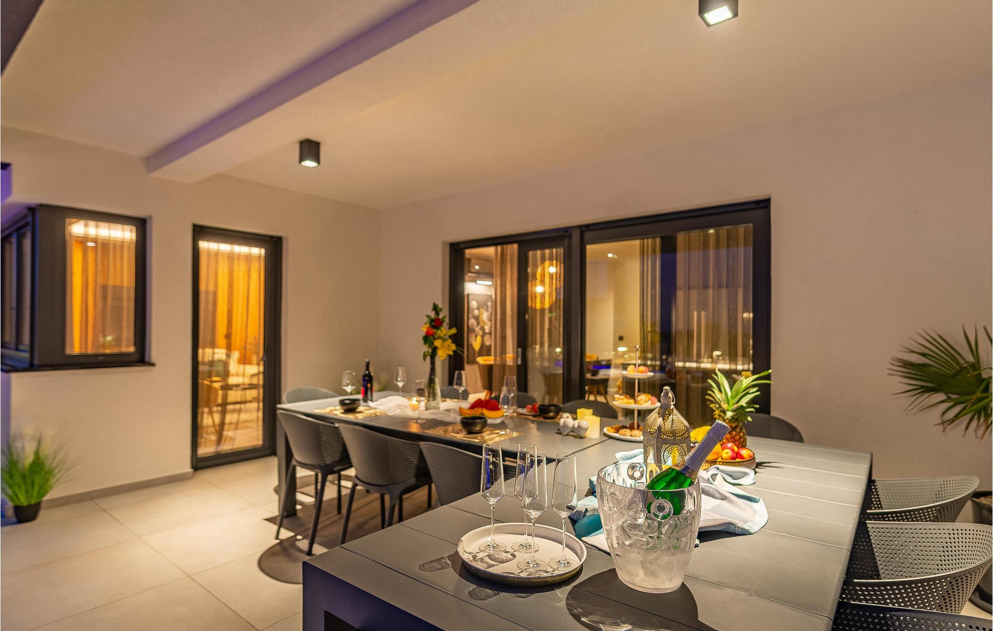Glæd jer til en vidunderlig ferie i dette lækre, moderne feriehus, som med fem soveværelser og fem badeværelser kan rumme op til 12 personer. Indretningen på værelserne er enkel og moderne, og så er der tilmed en flot havudsigt. I har desuden adgang til fitnessudstyr og diverse underholdningsmuligheder.