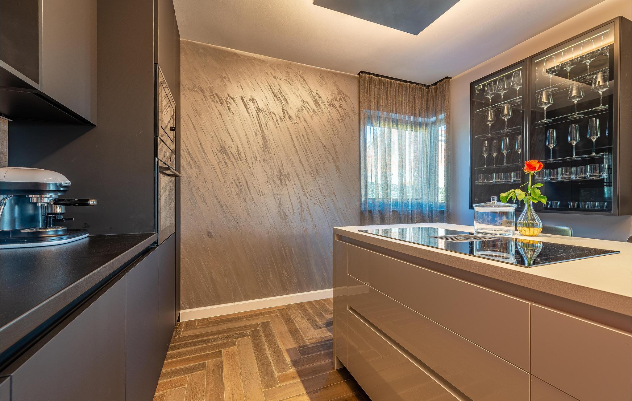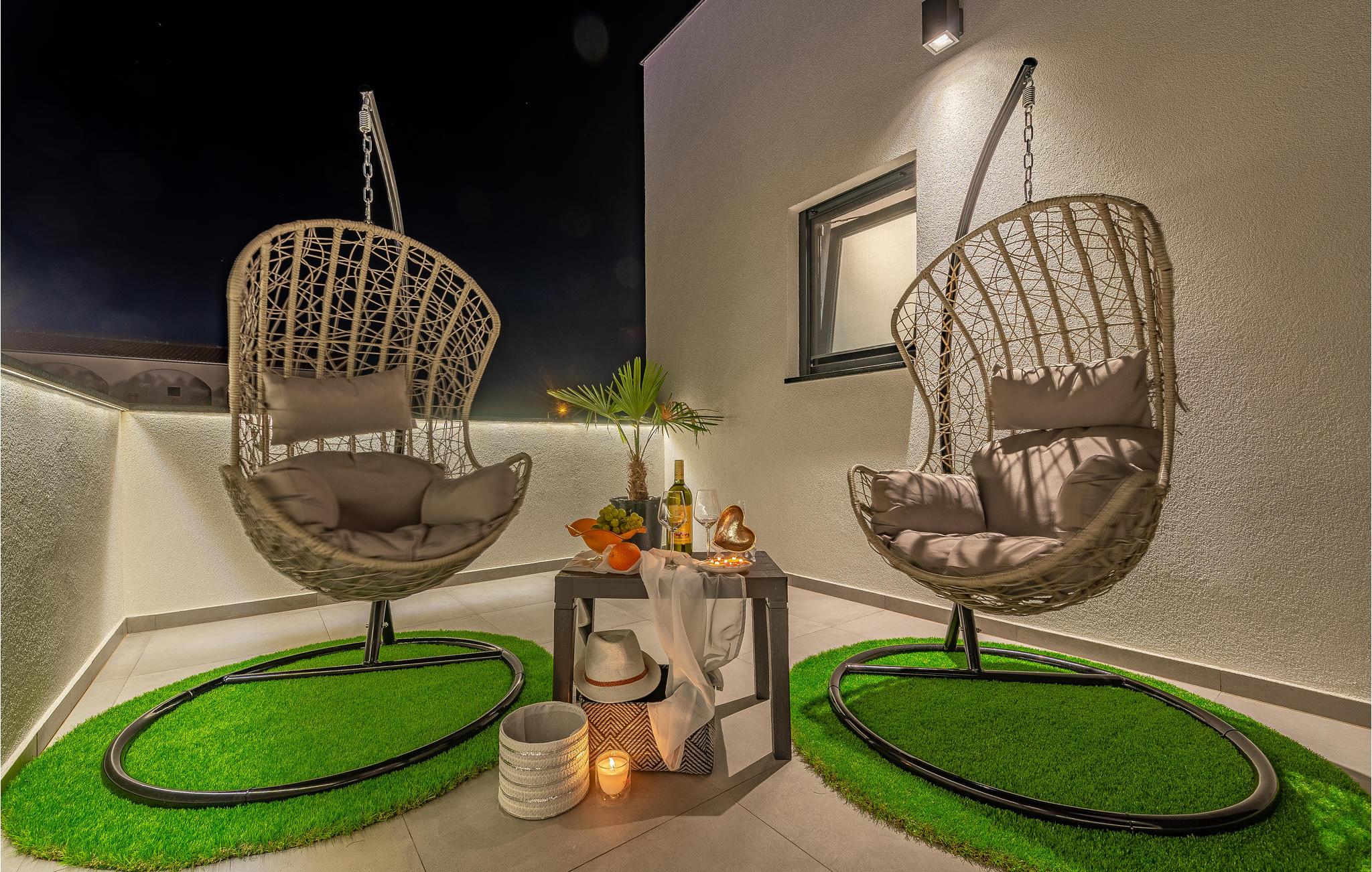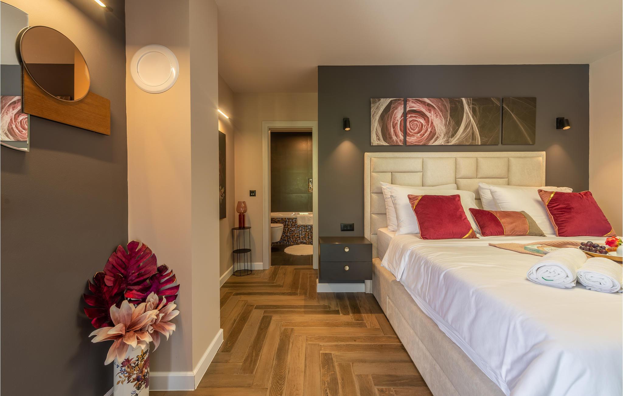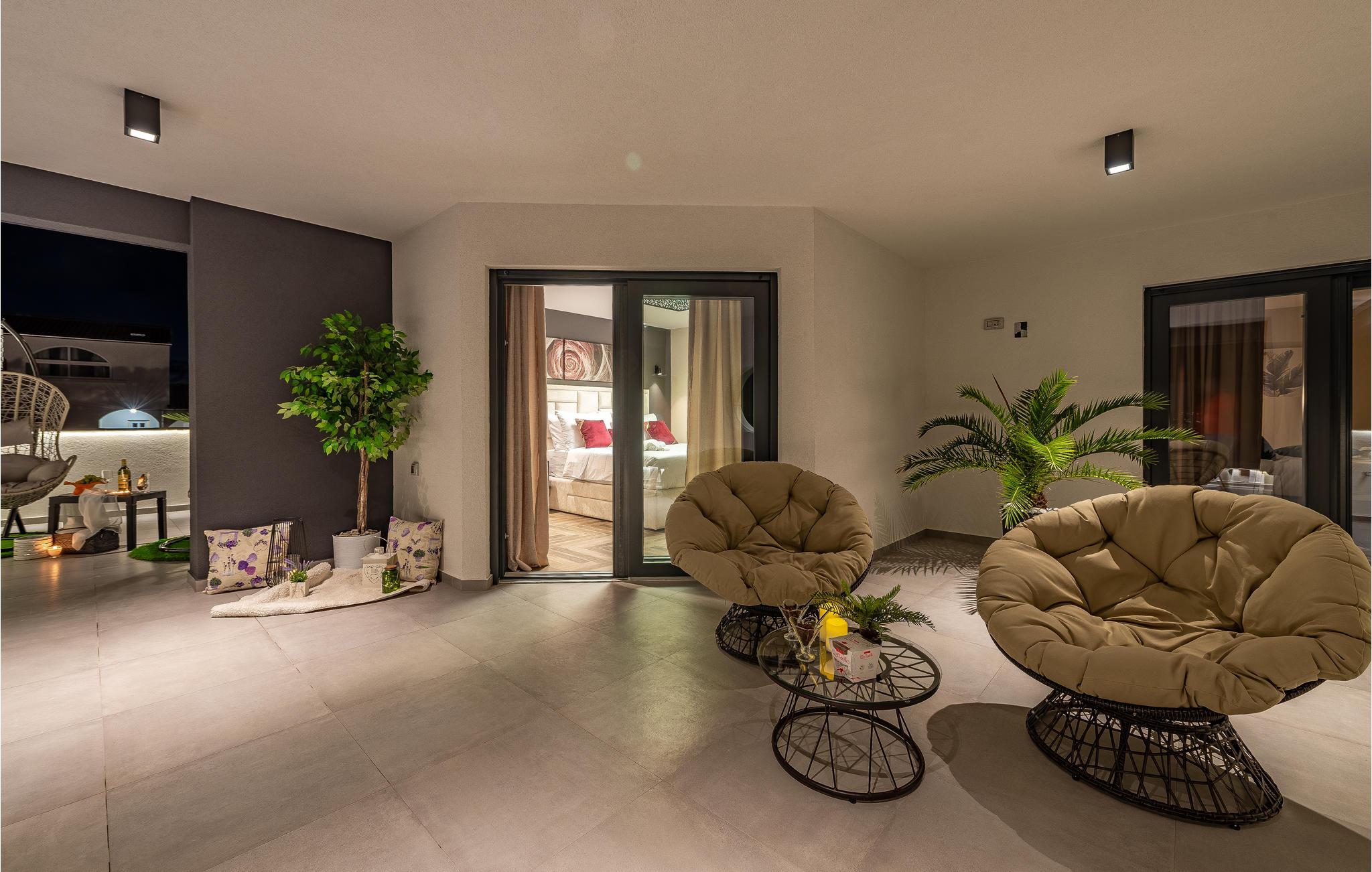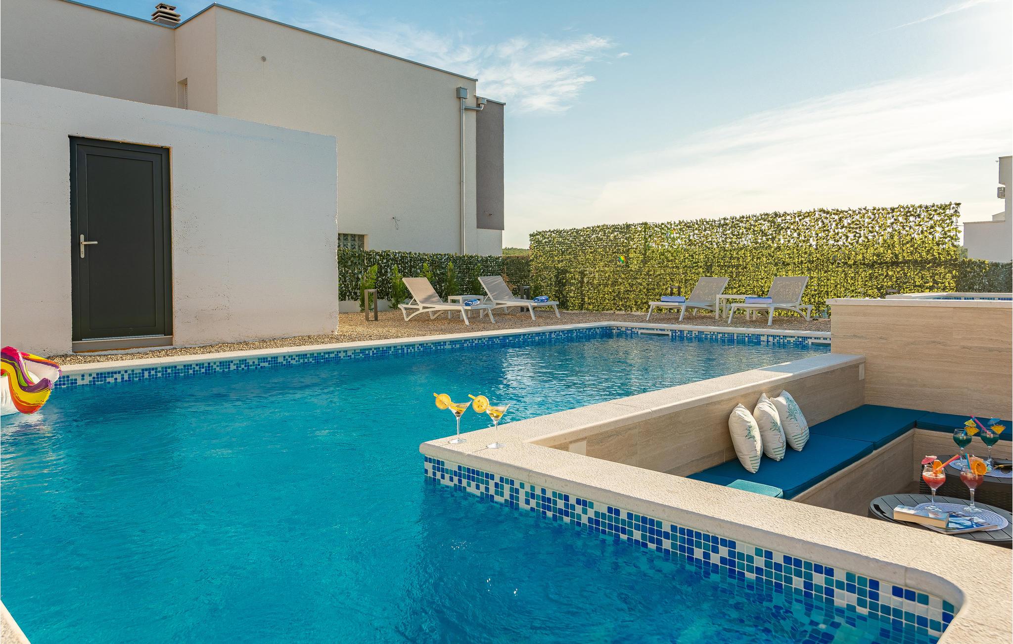 Udendørs kan I slappe af i de komfortable liggestole ved den store private pool, nyde et boblebad og vælge mellem flere terrasser med sol eller skygge, alt efter hvad I har brug for.
