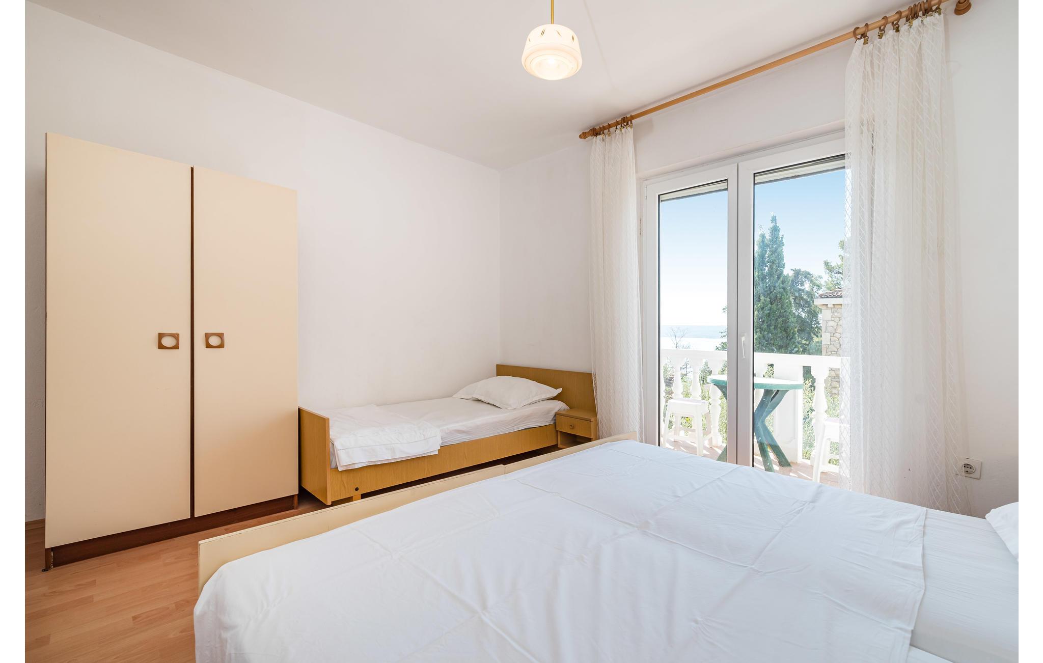 Lejligheden ligger på første sal, og fordeler sig over 3 soveværelser og en opholdsstue med køkken. Udenfor finder I en dejlig stor altan med delvis havudsigt. Her har I havemøbler til jeres rådighed, så I let kan nyde morgenkaffen her, eller et godt glas vin om aftnene. I har også adgang til dejlig have hvor børnene kan lege, mens I sidder under de skyggefulde træer.